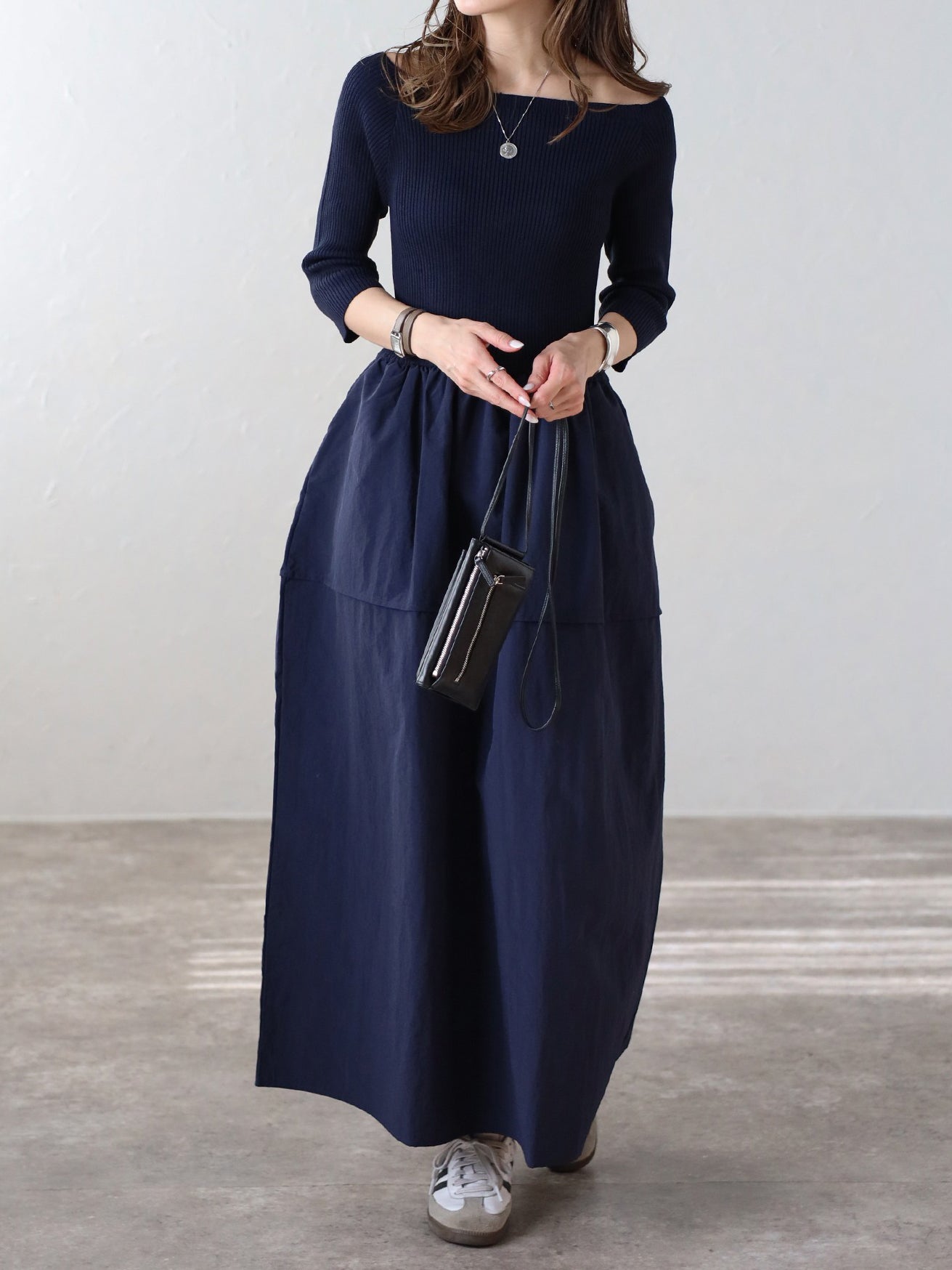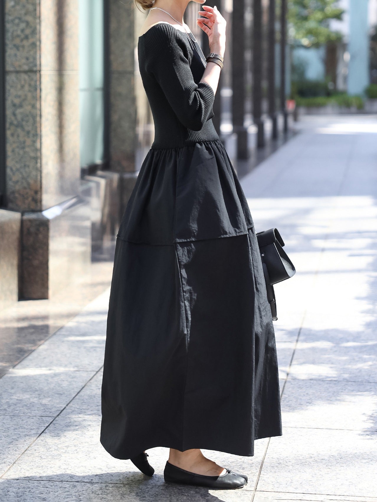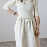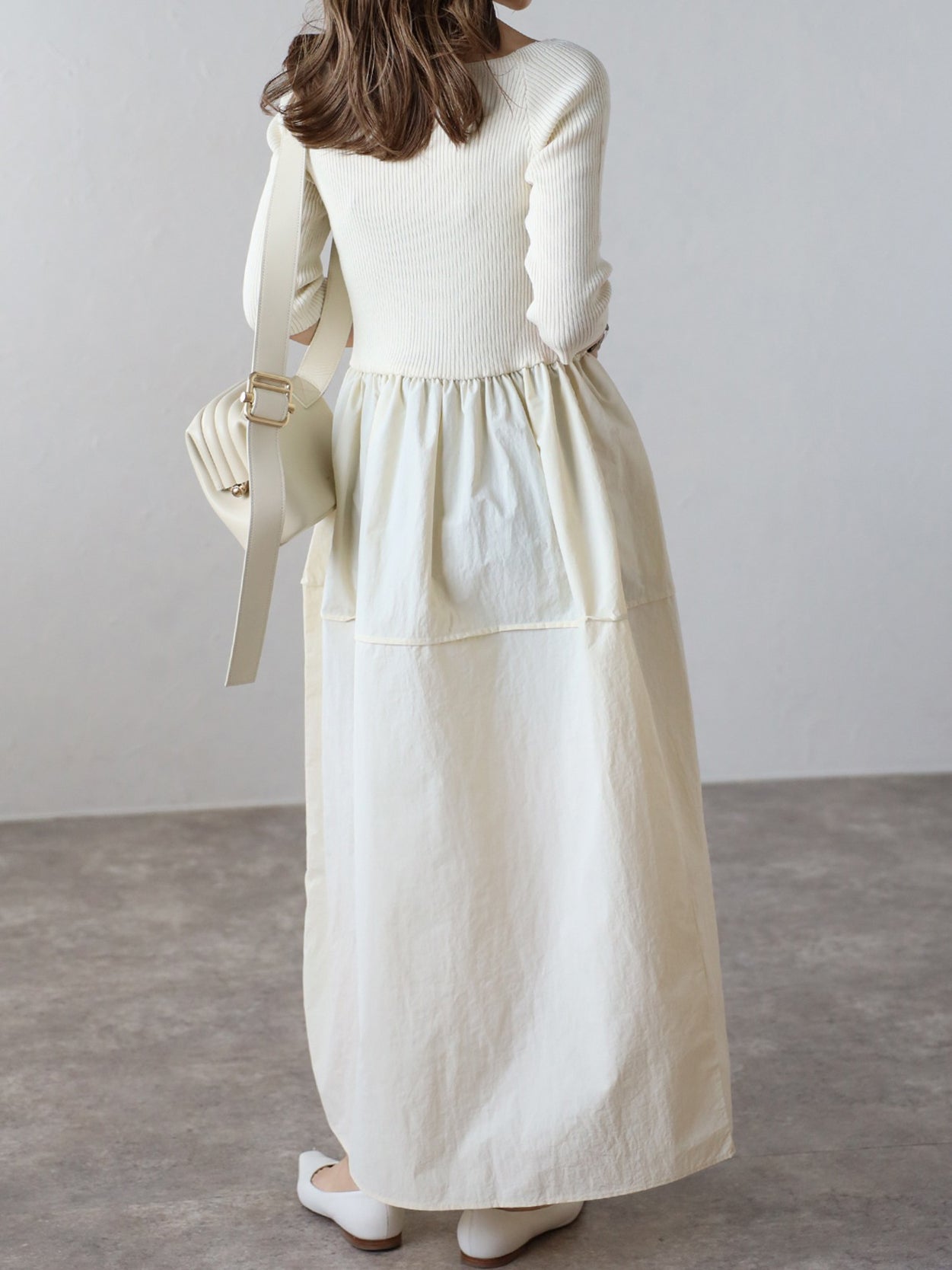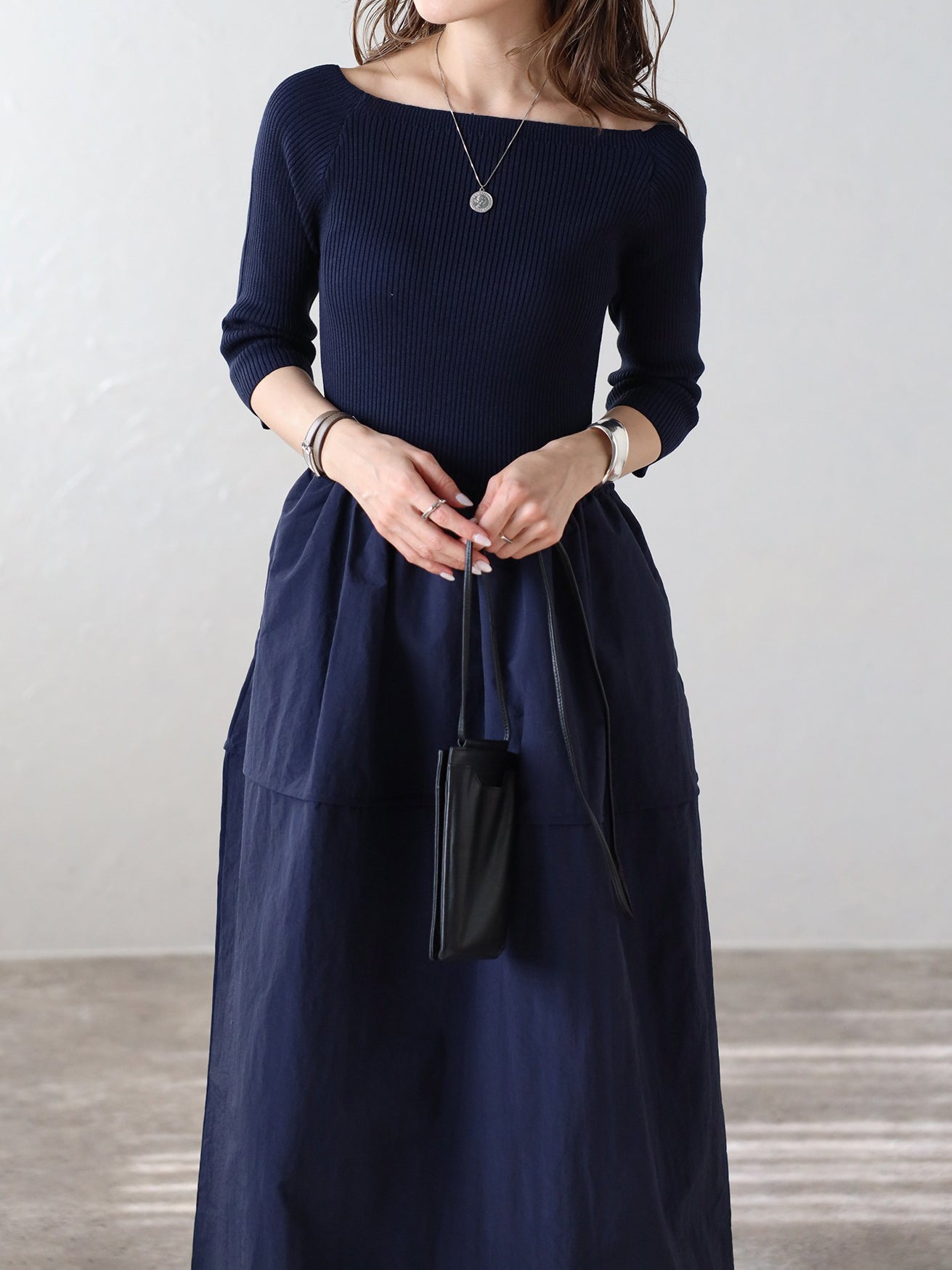 A three-quarter sleeve dress made from a combination of three-dimensional knit and nylon material.