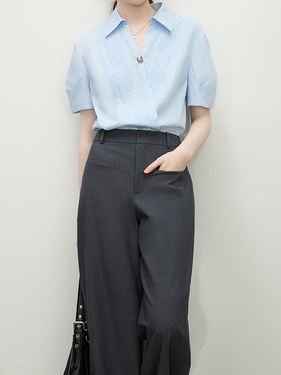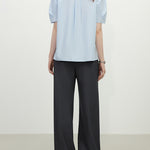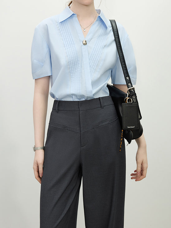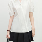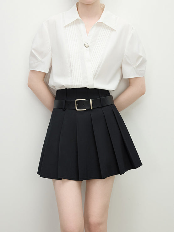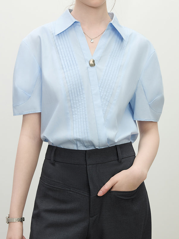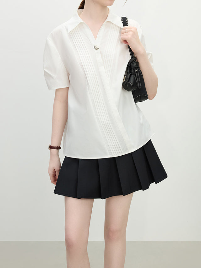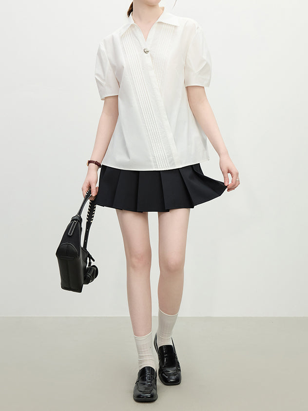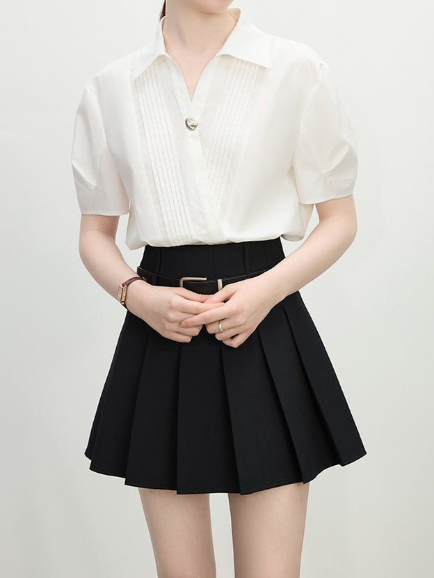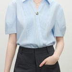 A puff sleeve blouse featuring delicate pin tucks and a cache-coeur design.