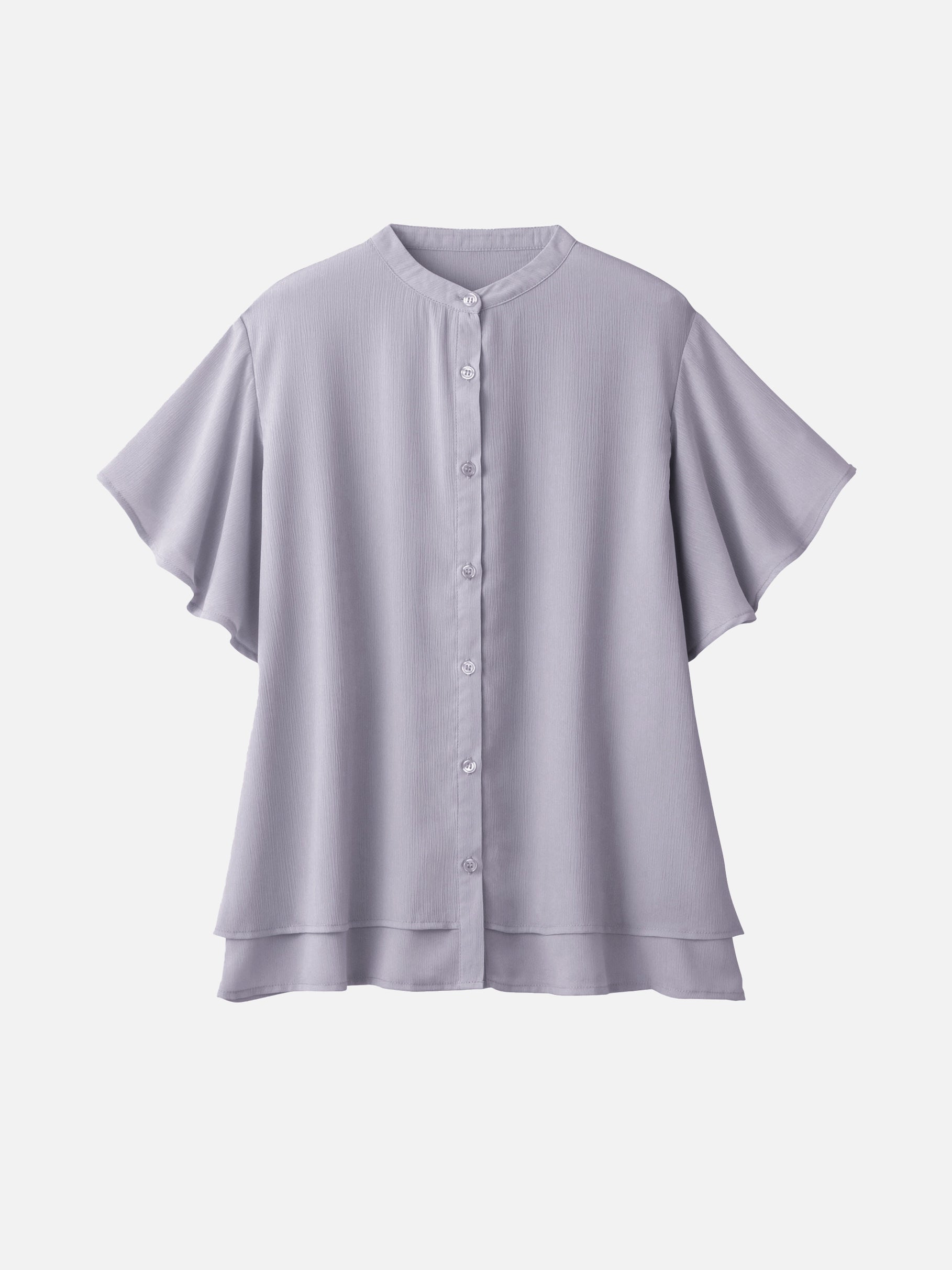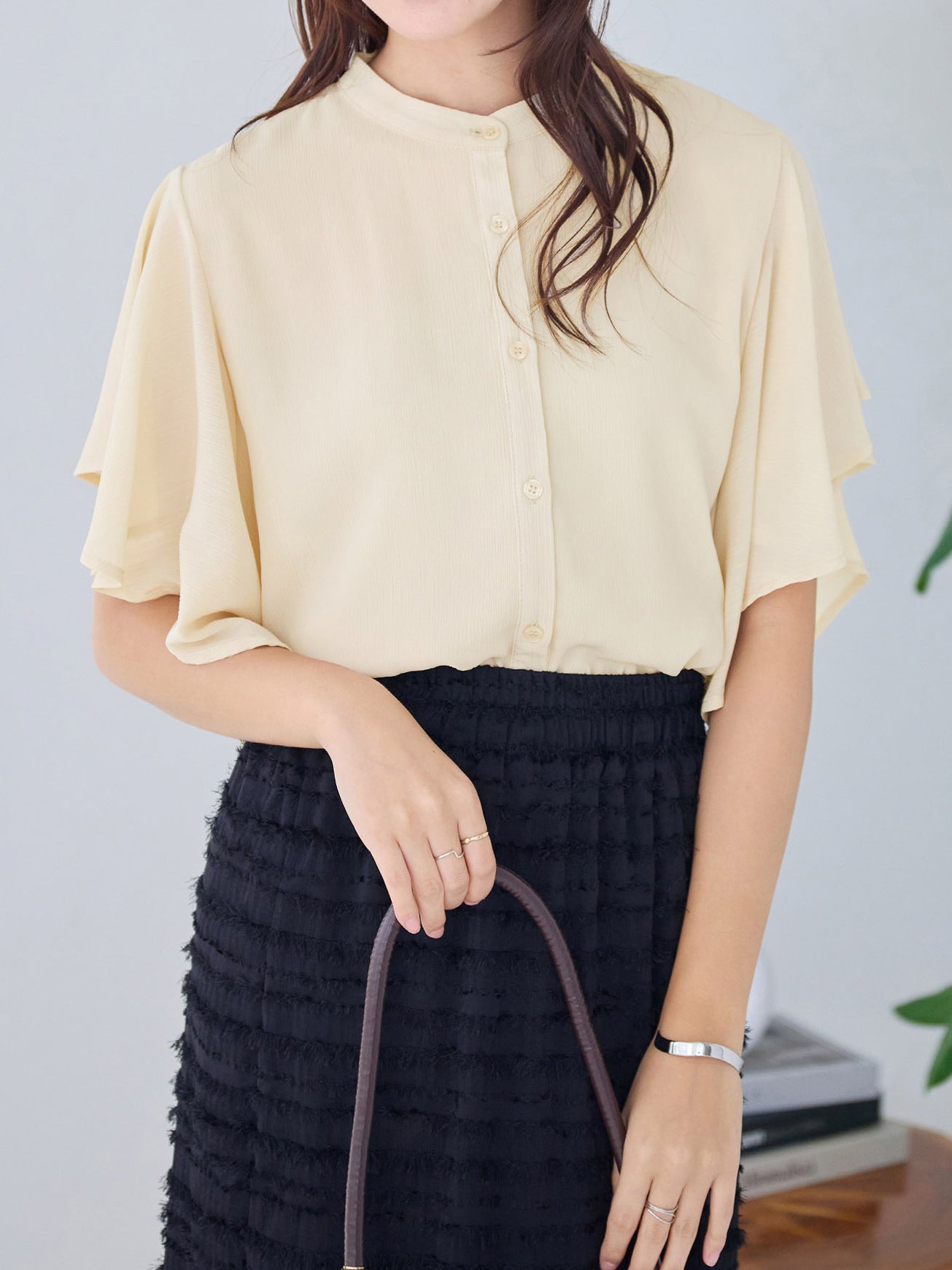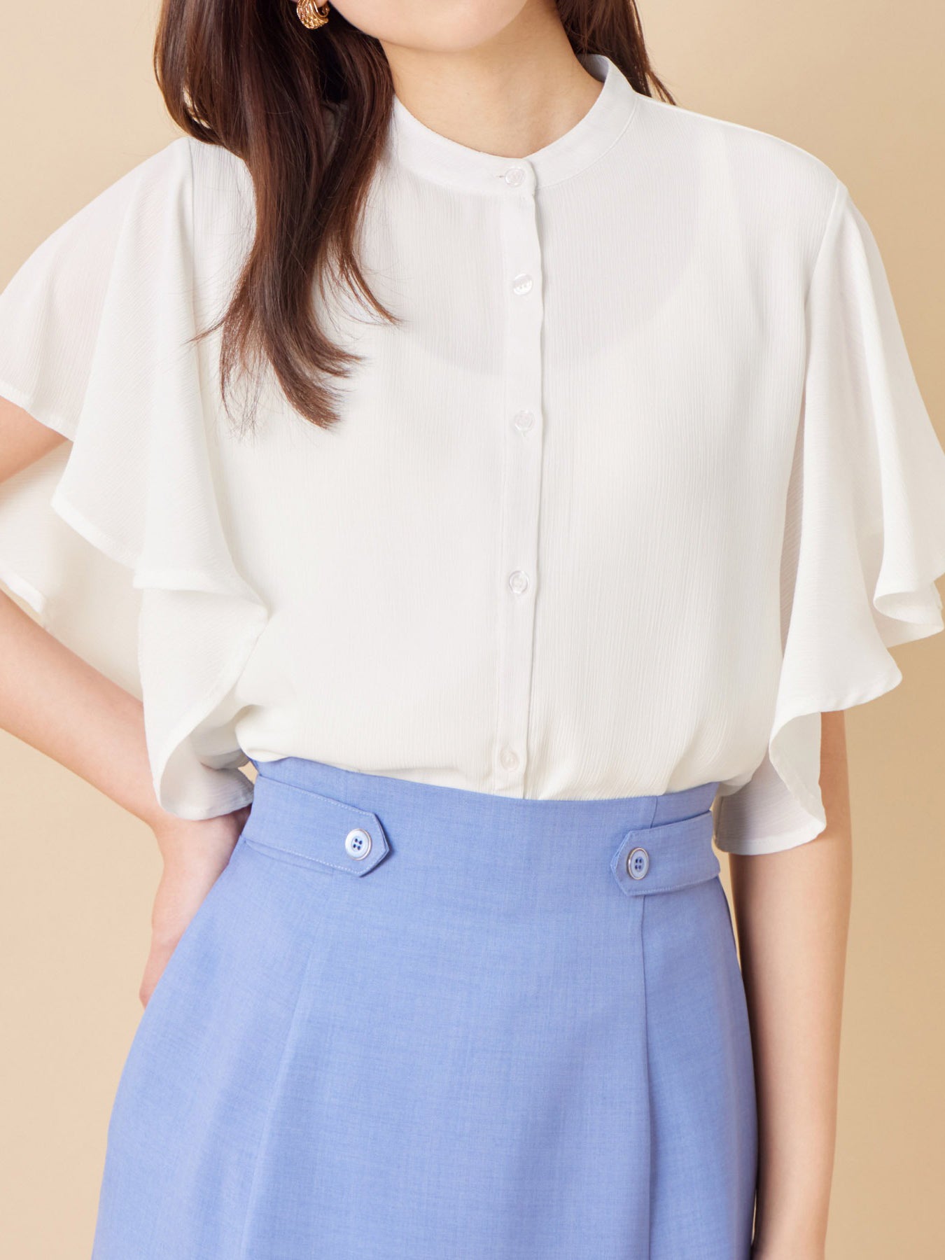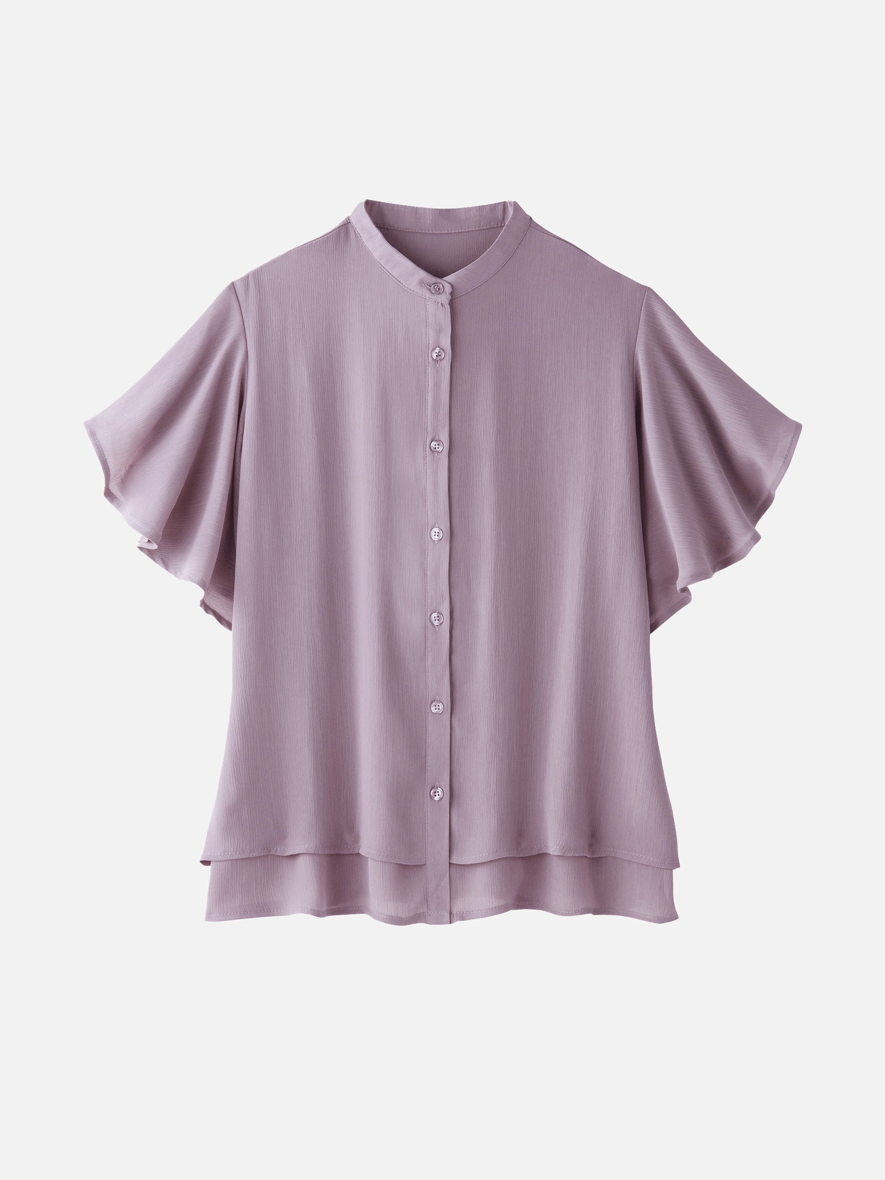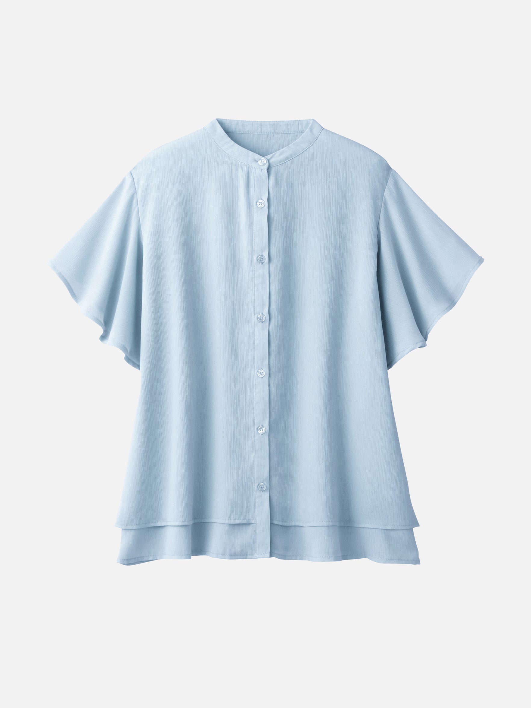 A blouse with a soft texture and a neat band collar that makes it perfect for a sophisticated lady.