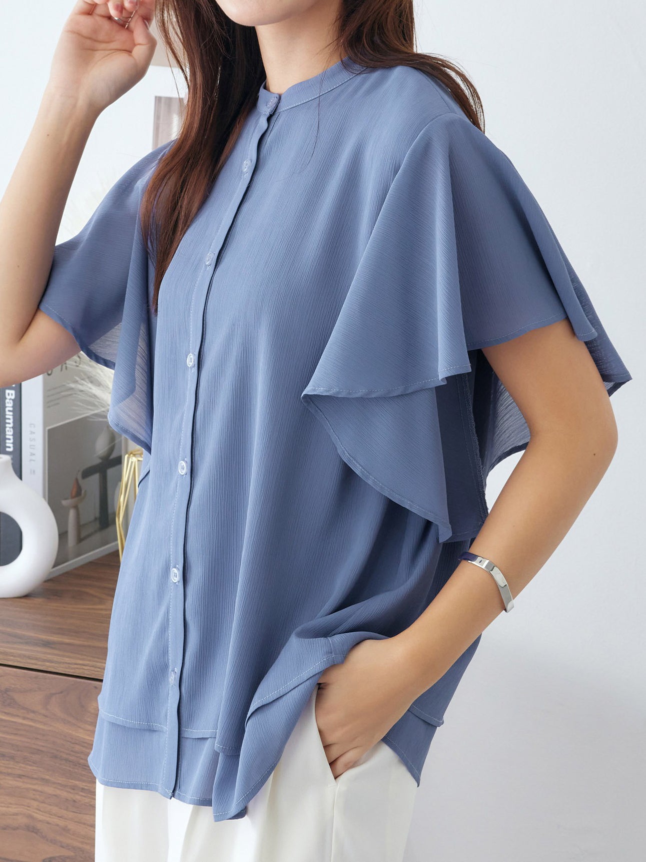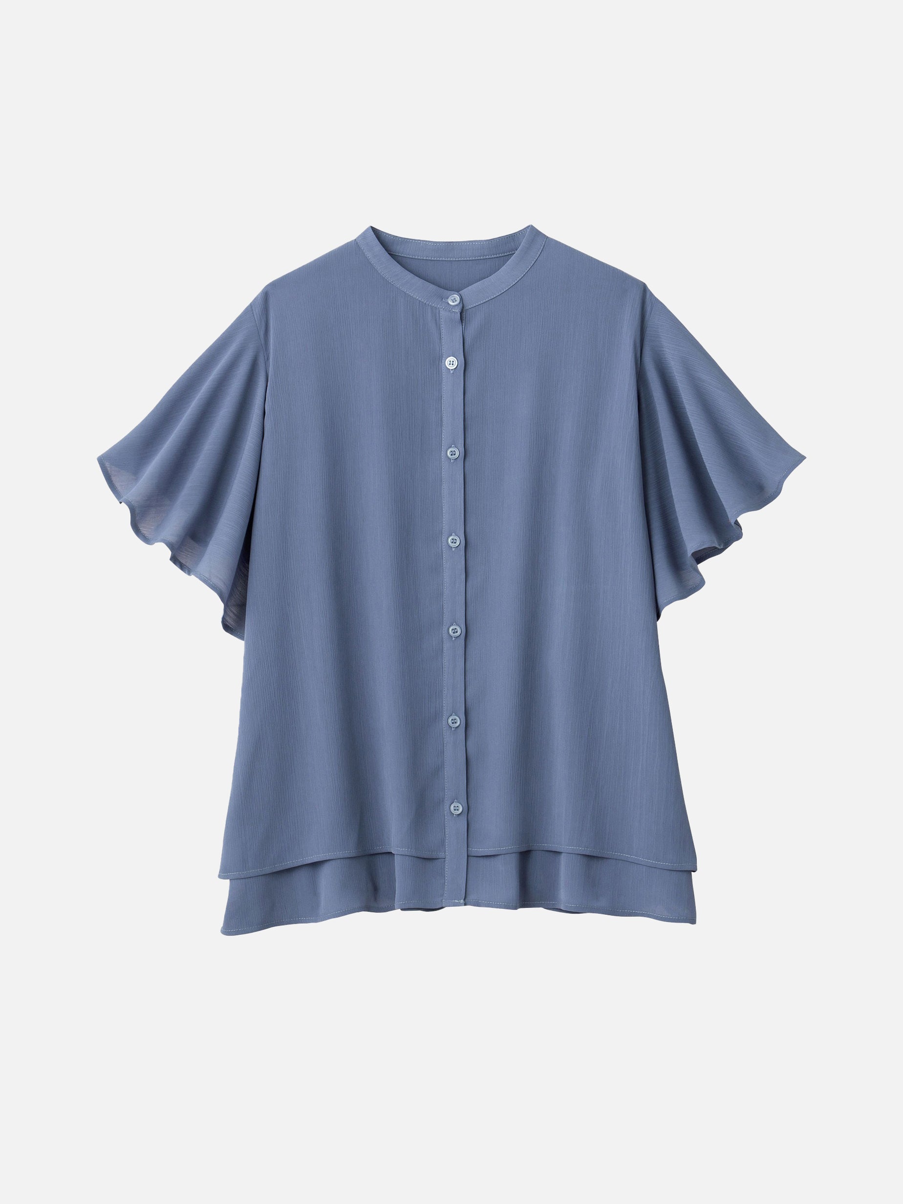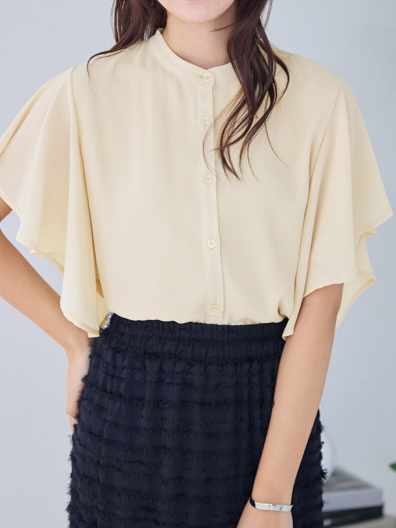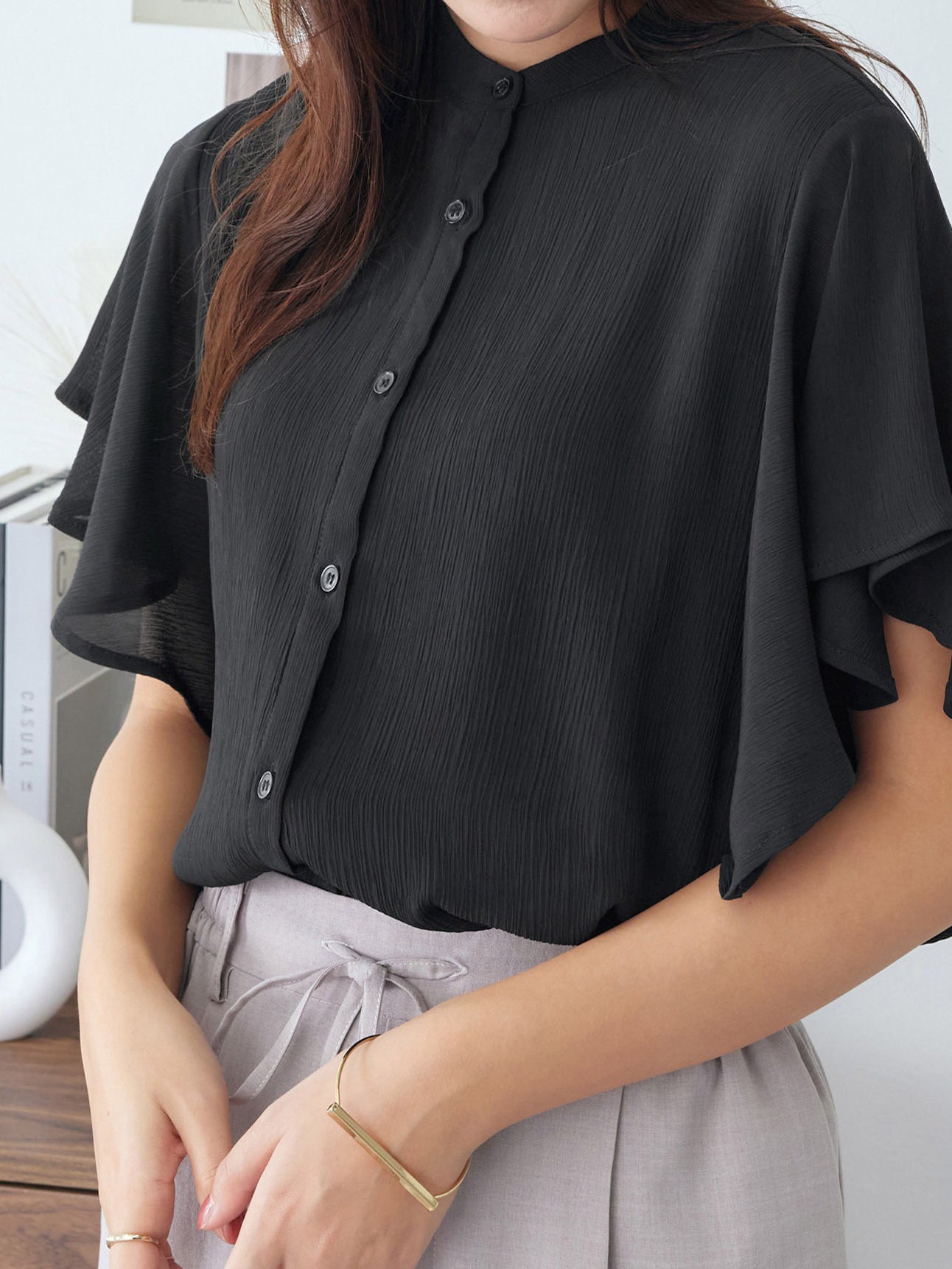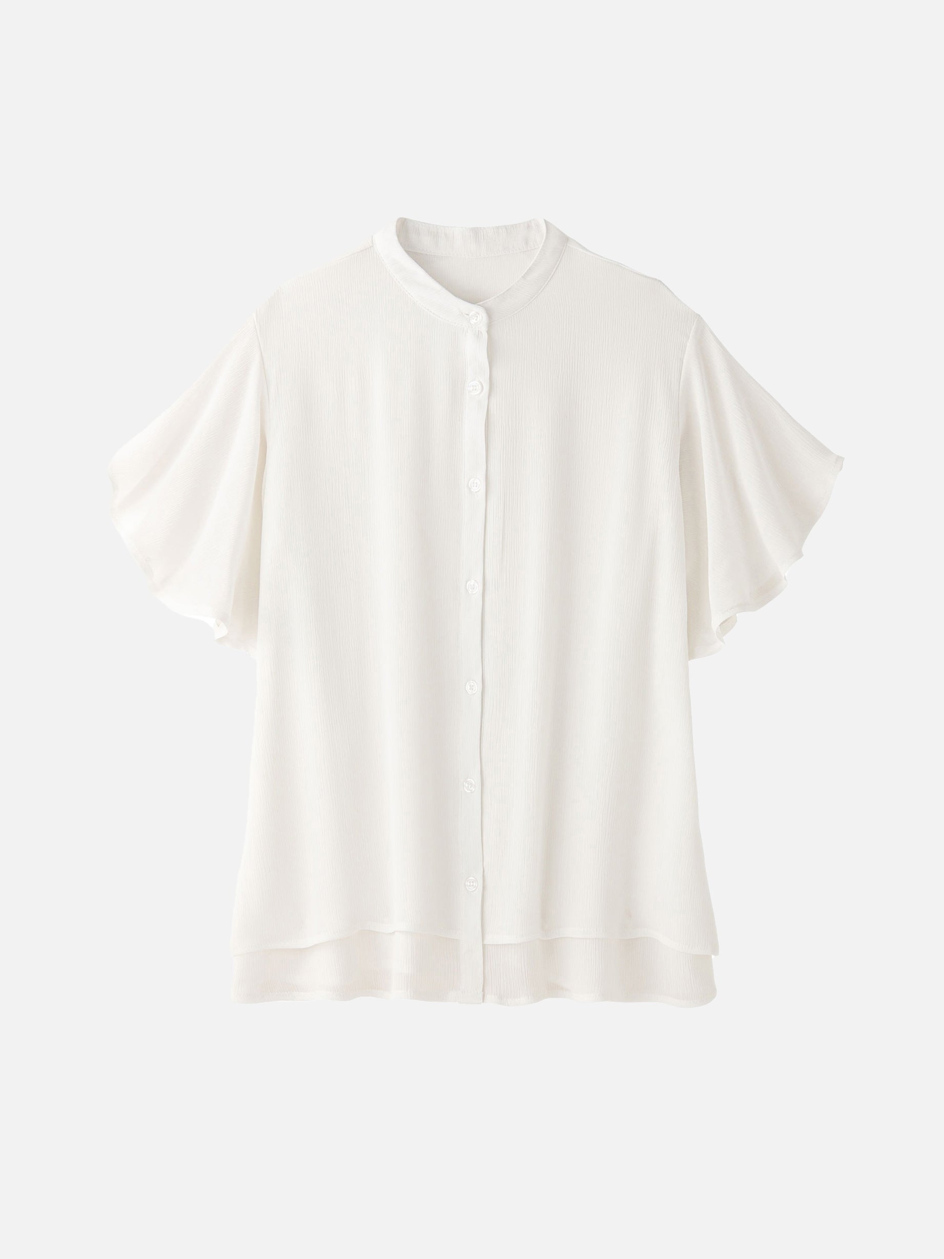 A blouse with a soft texture and a neat band collar that makes it perfect for a sophisticated lady.