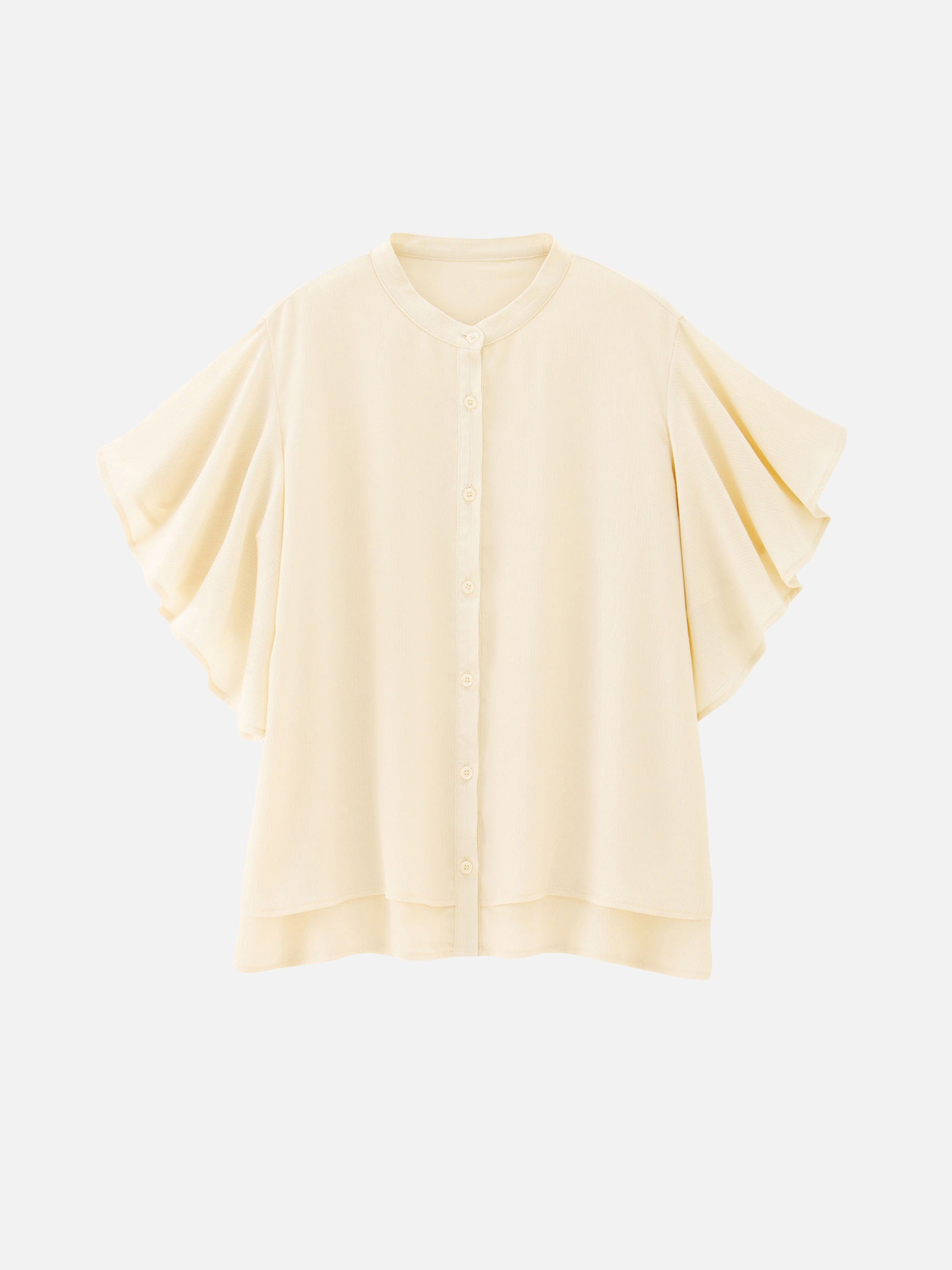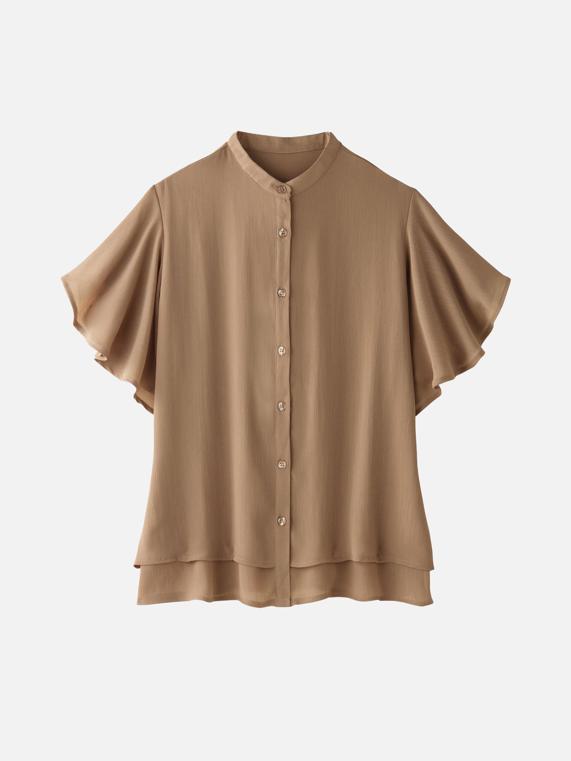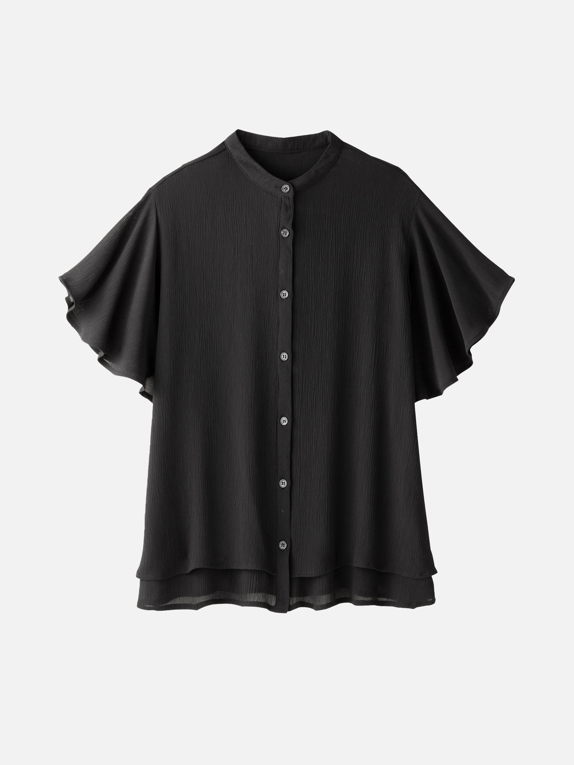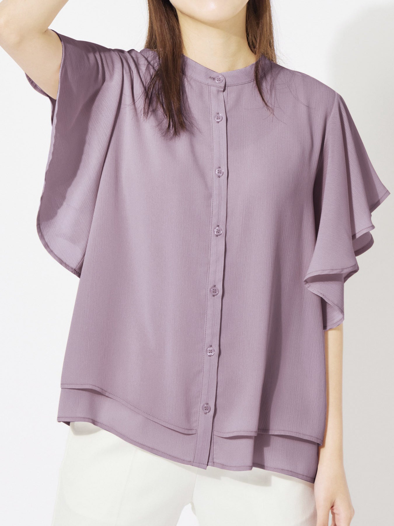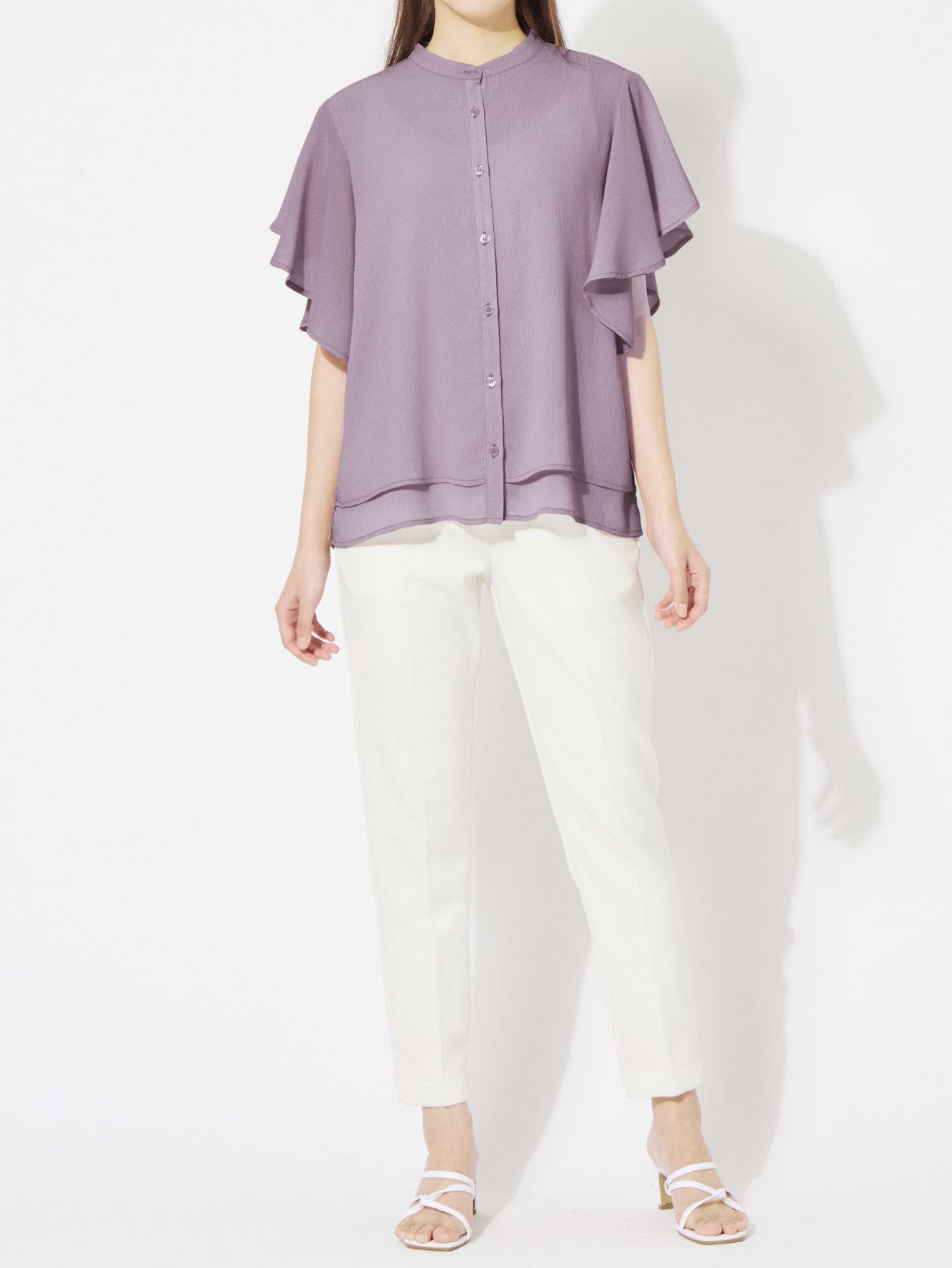 A blouse with a soft texture and a neat band collar that makes it perfect for a sophisticated lady.
