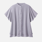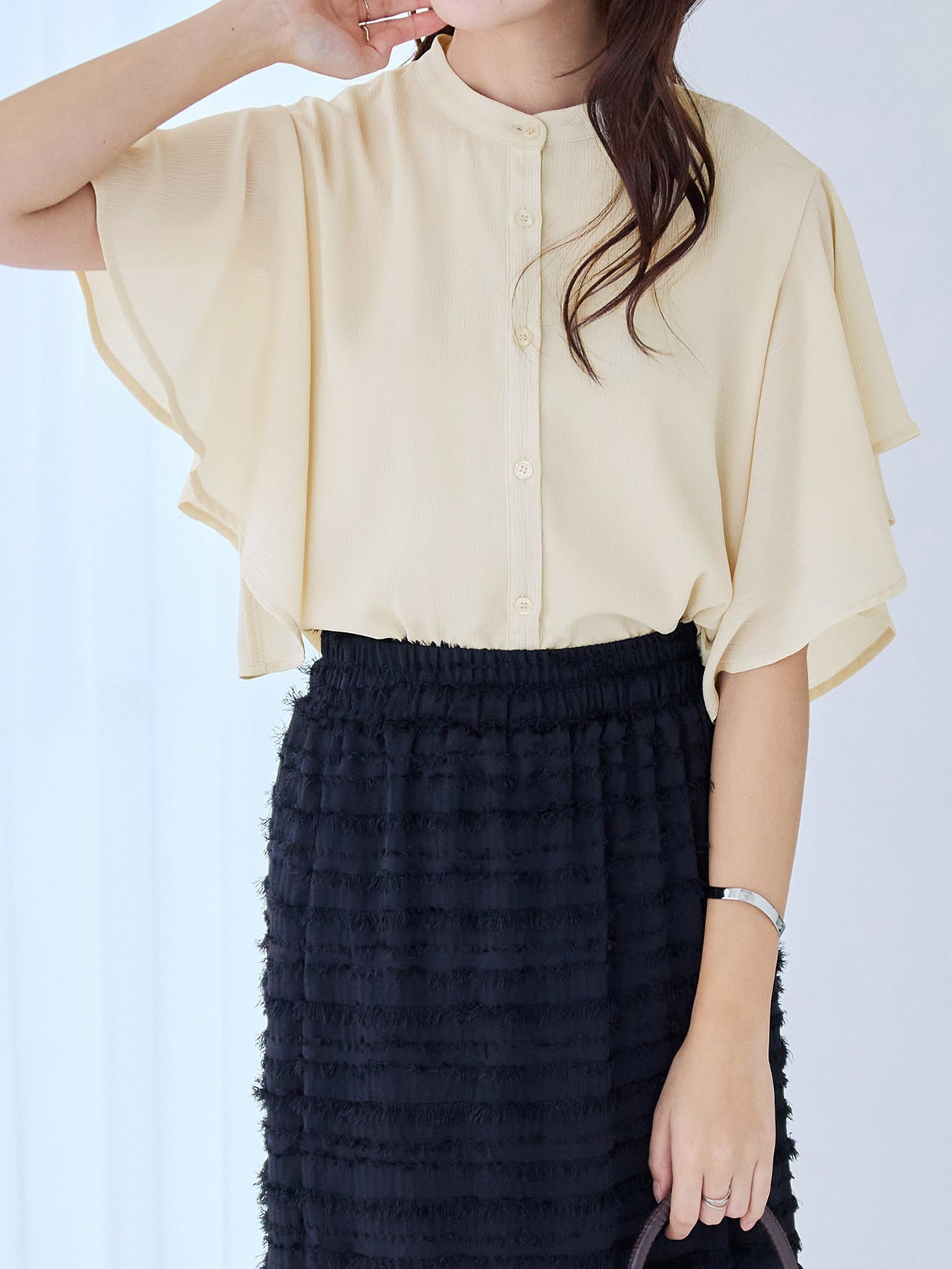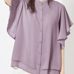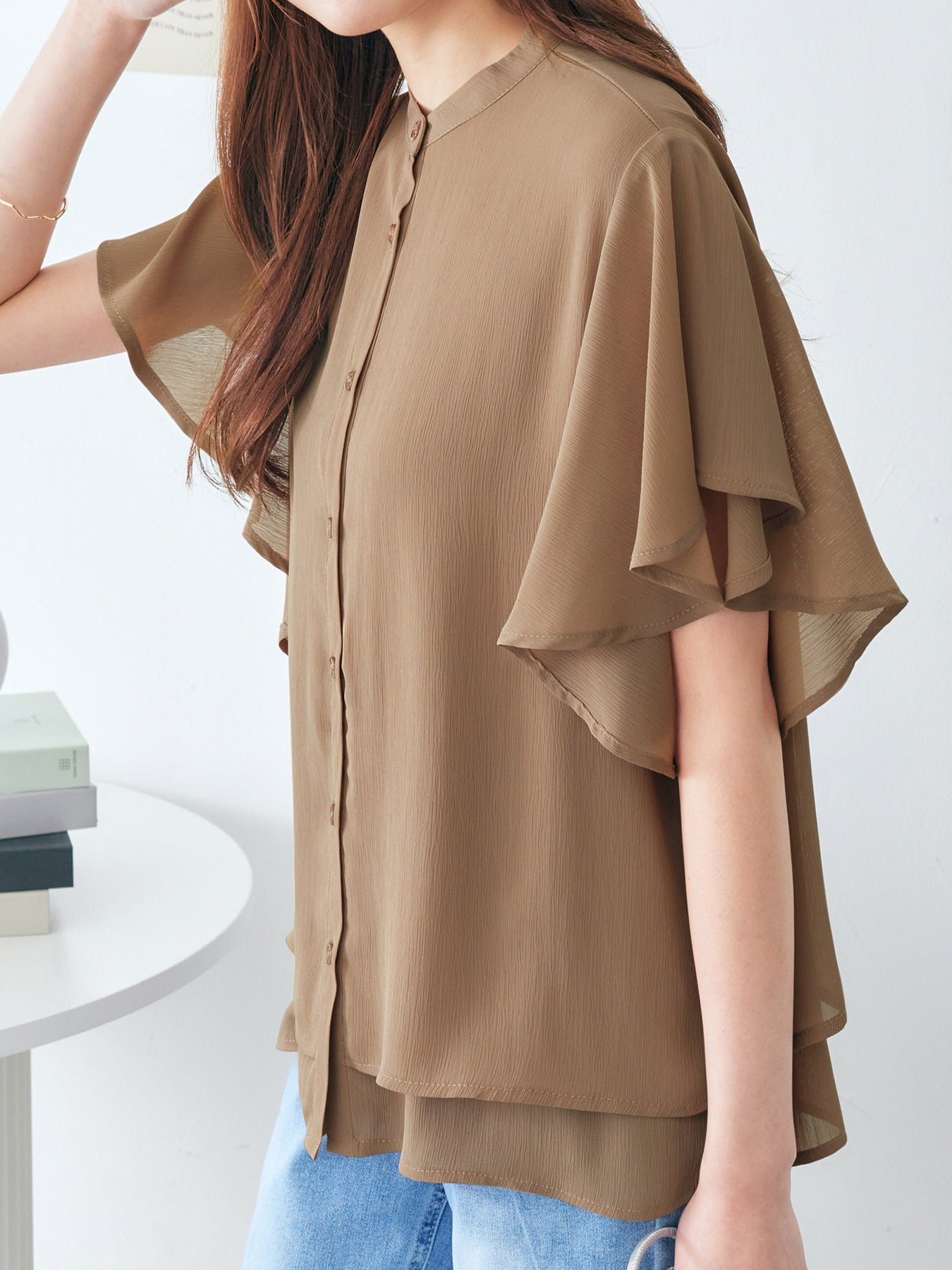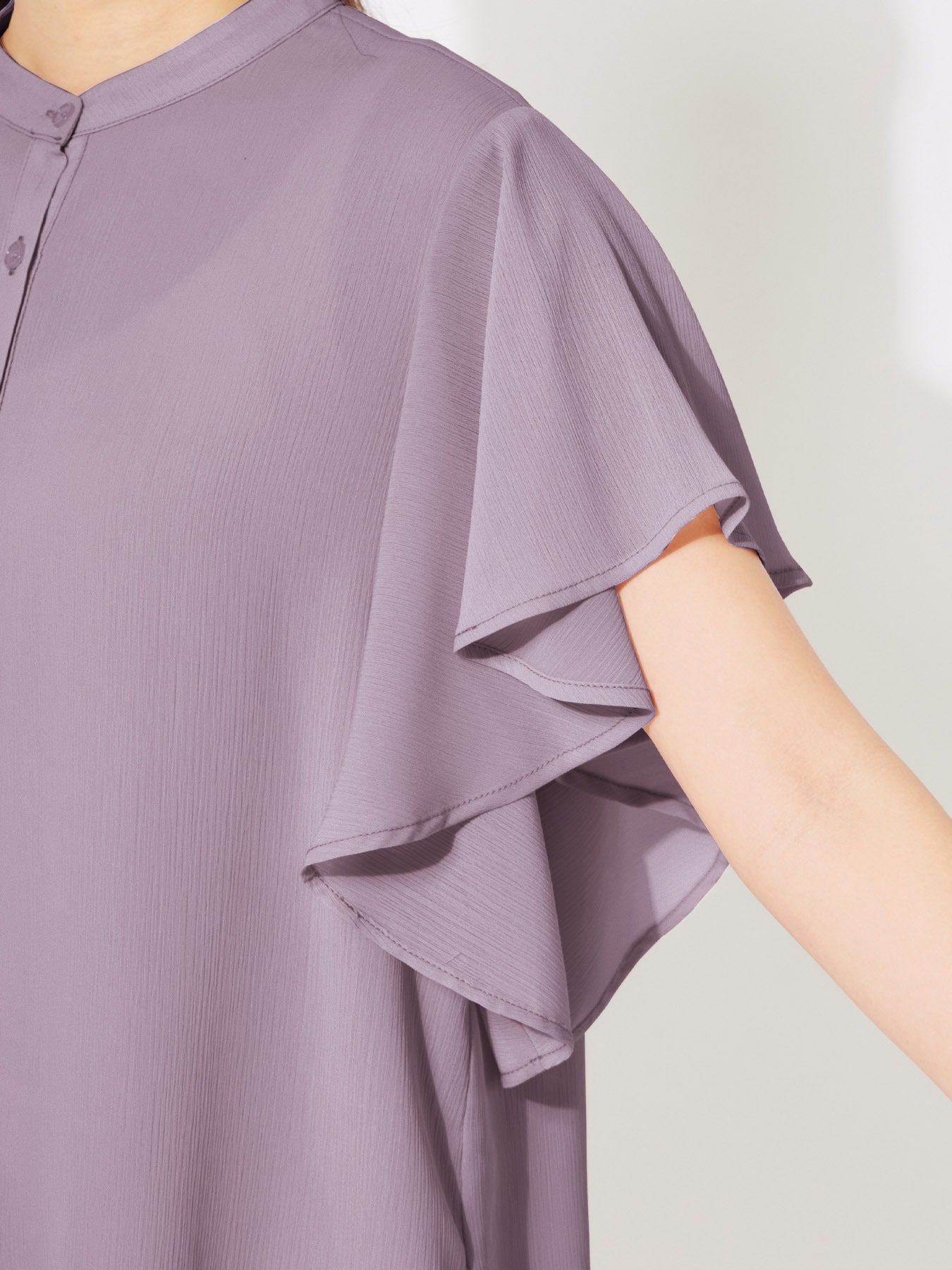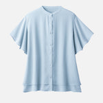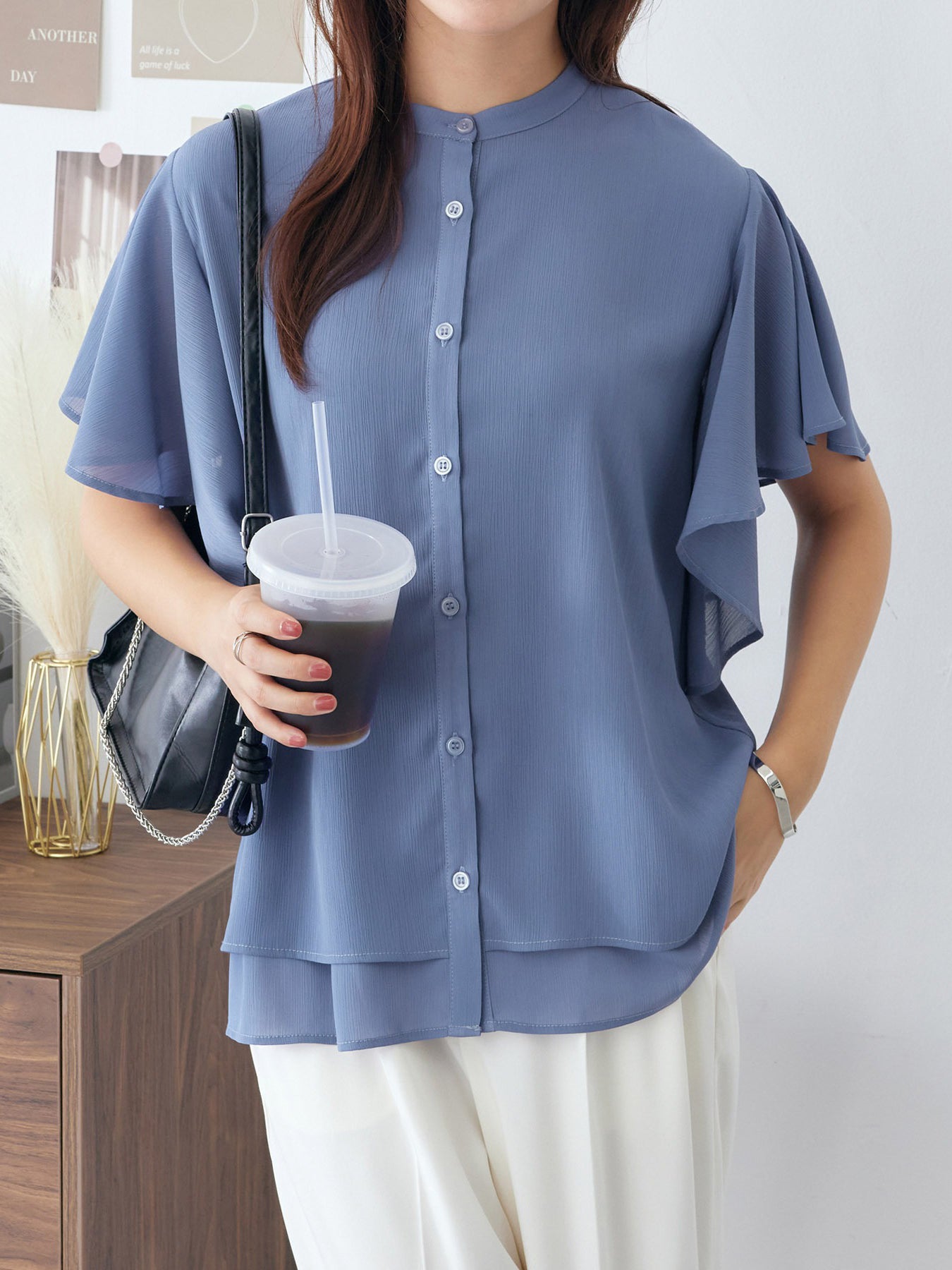 A blouse with a soft texture and a neat band collar that makes it perfect for a sophisticated lady.