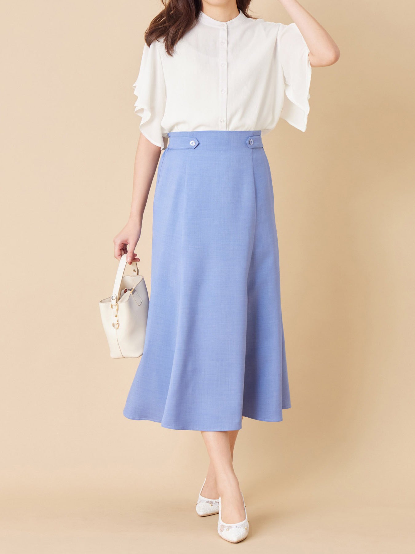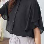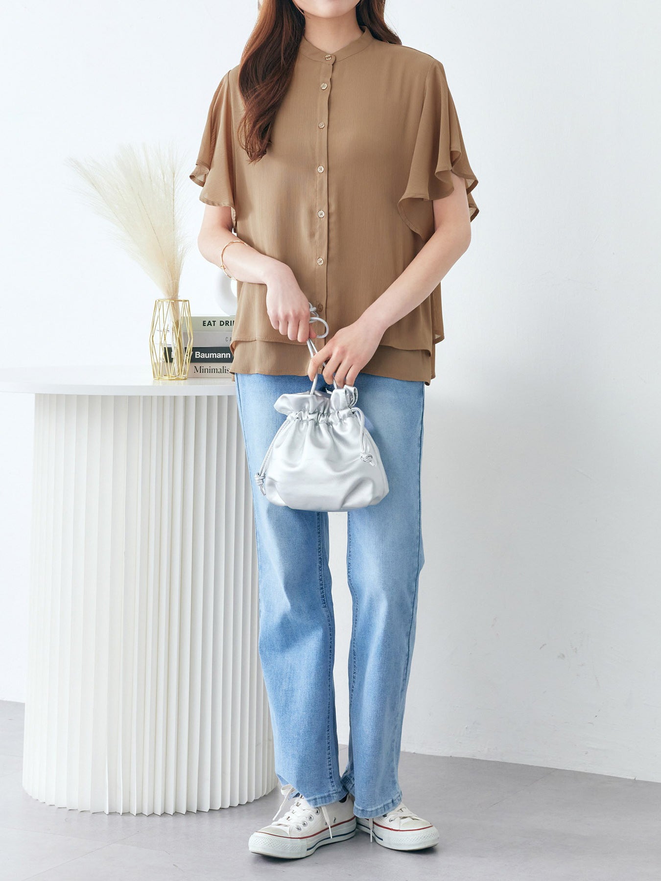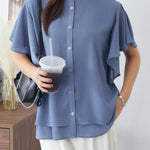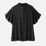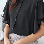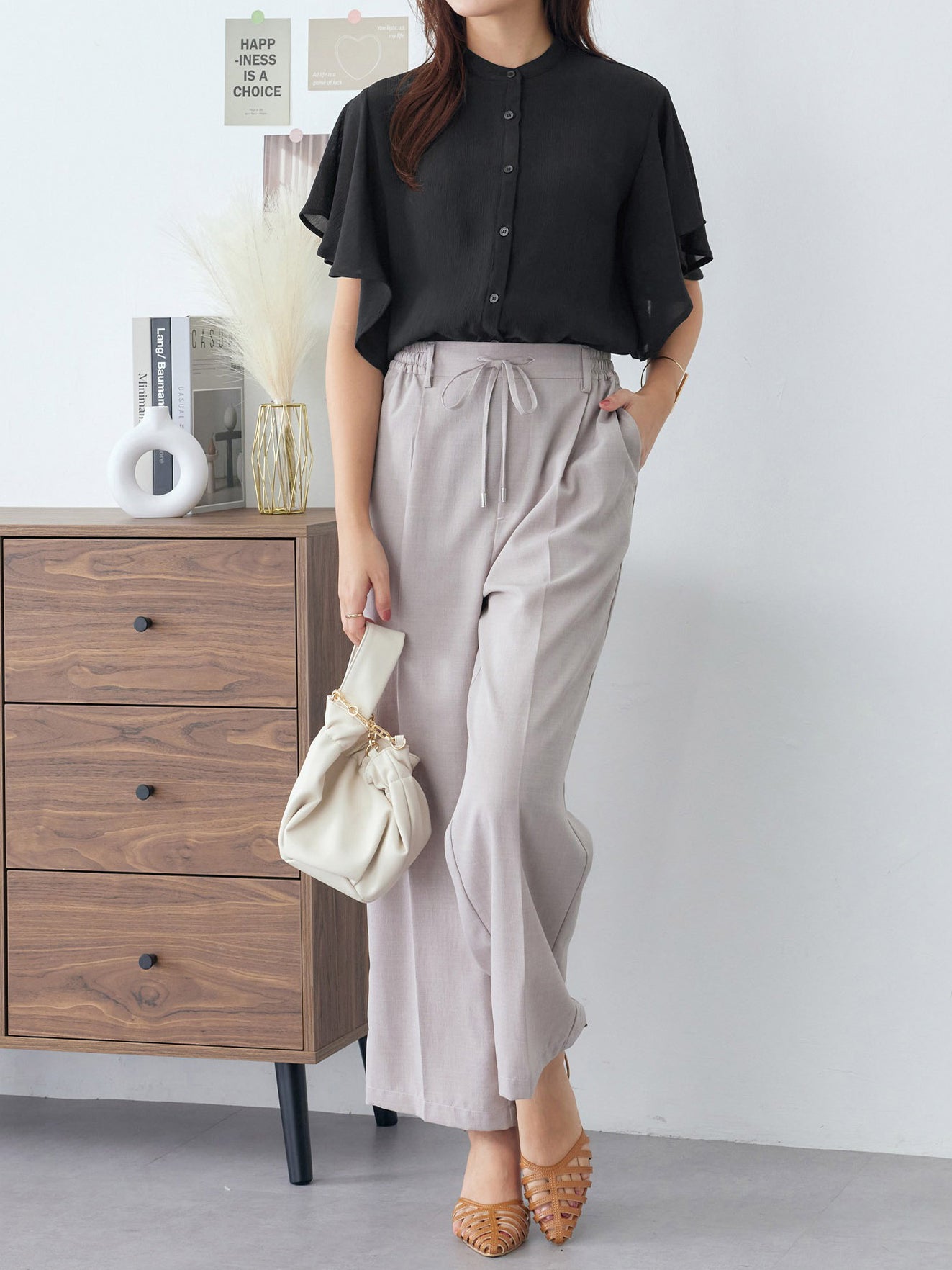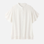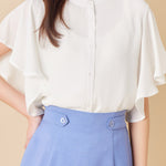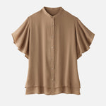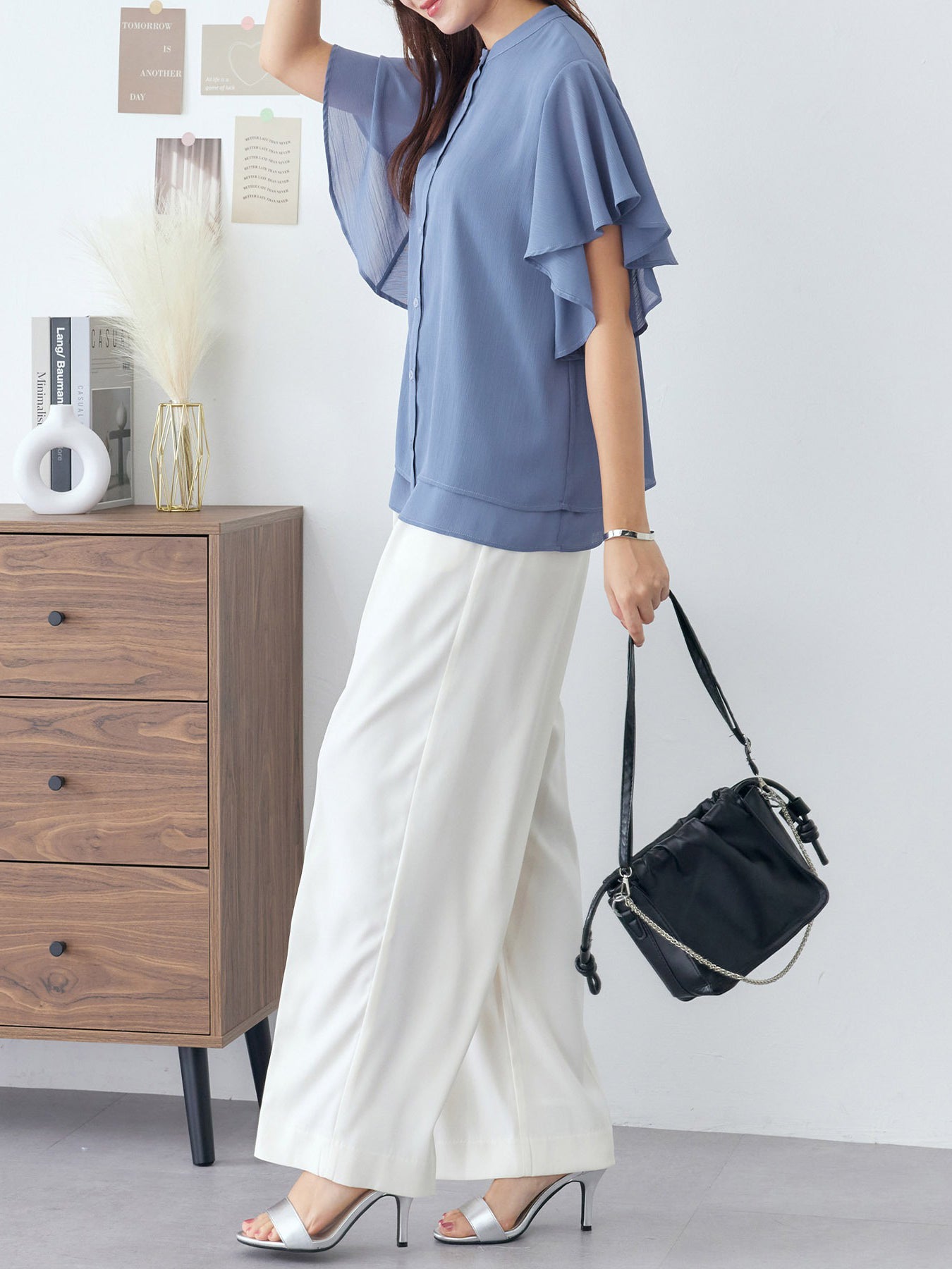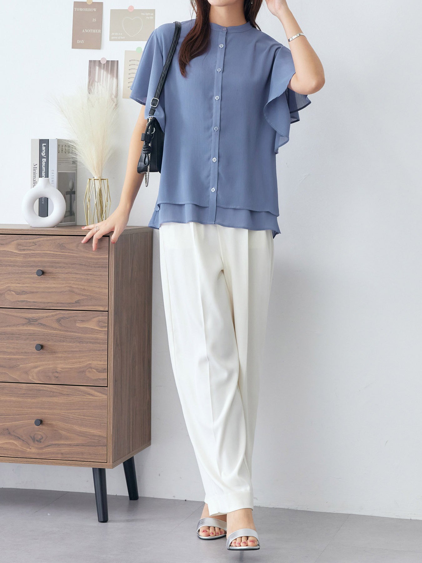 A blouse with a soft texture and a neat band collar that makes it perfect for a sophisticated lady.