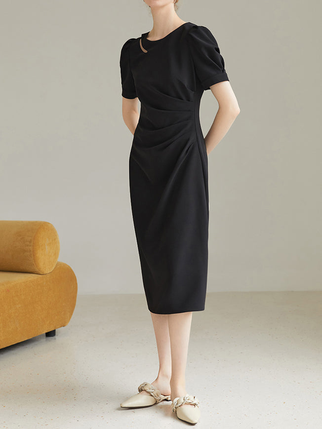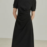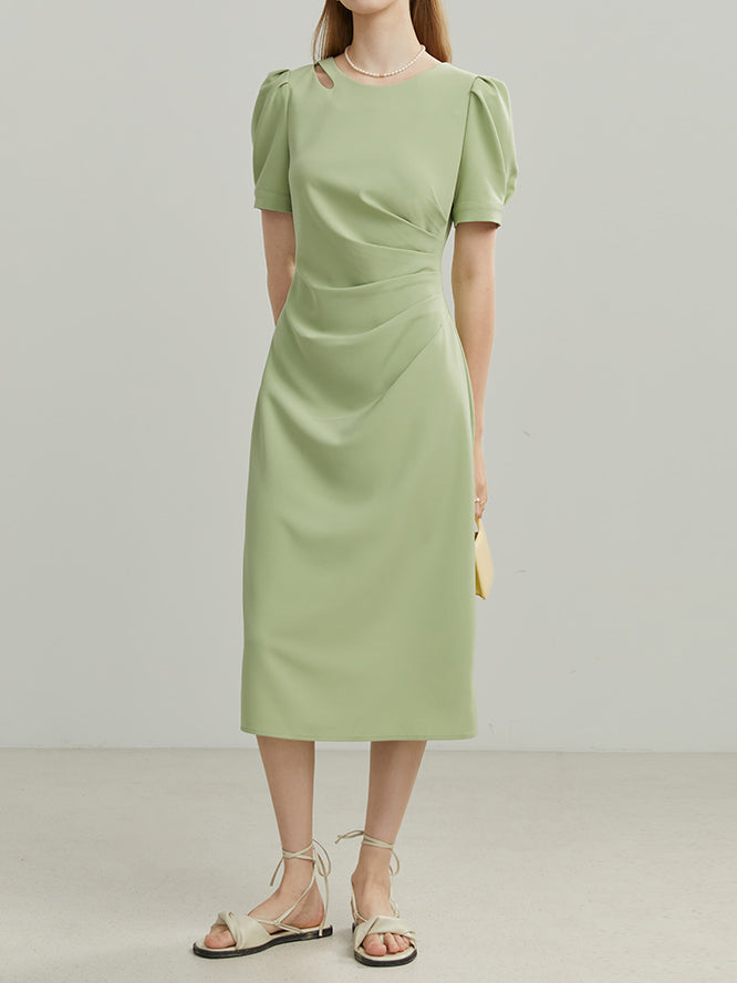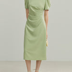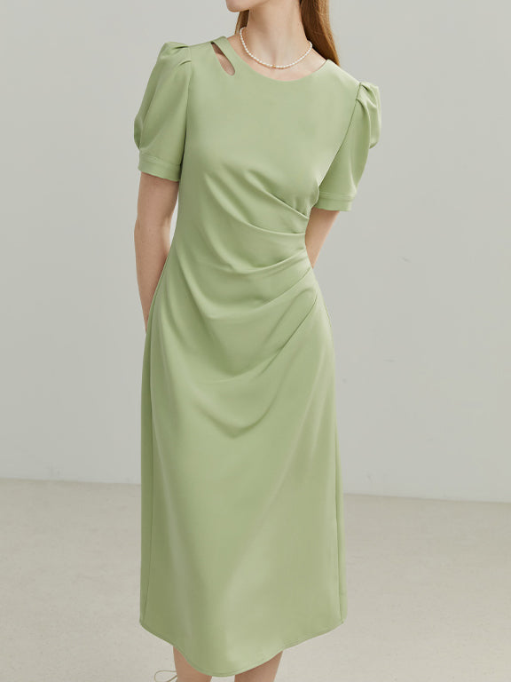 A camisole dress with side tuck details that hug the body 's natural curves and an eye-catching asymmetrical design.