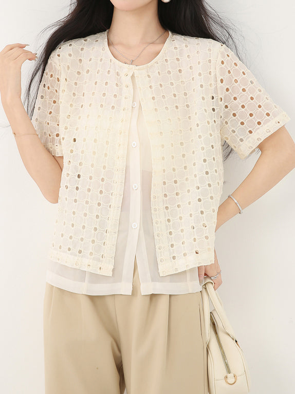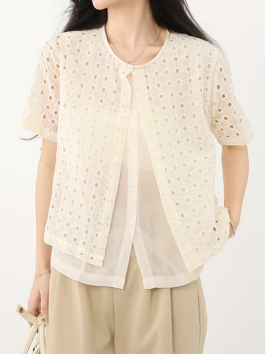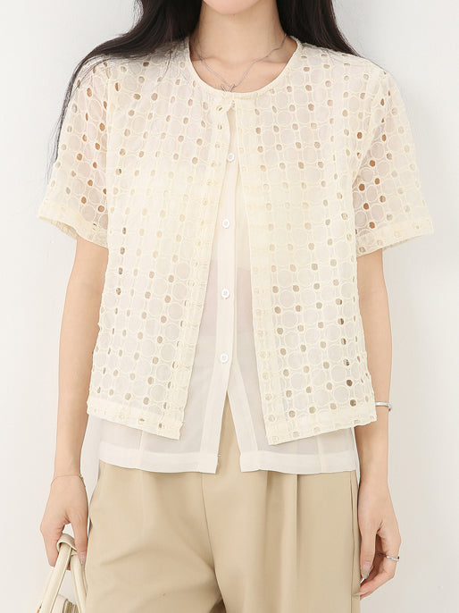 Pearl-trimmed keyhole cut georgette peplum blouse in 2 colors