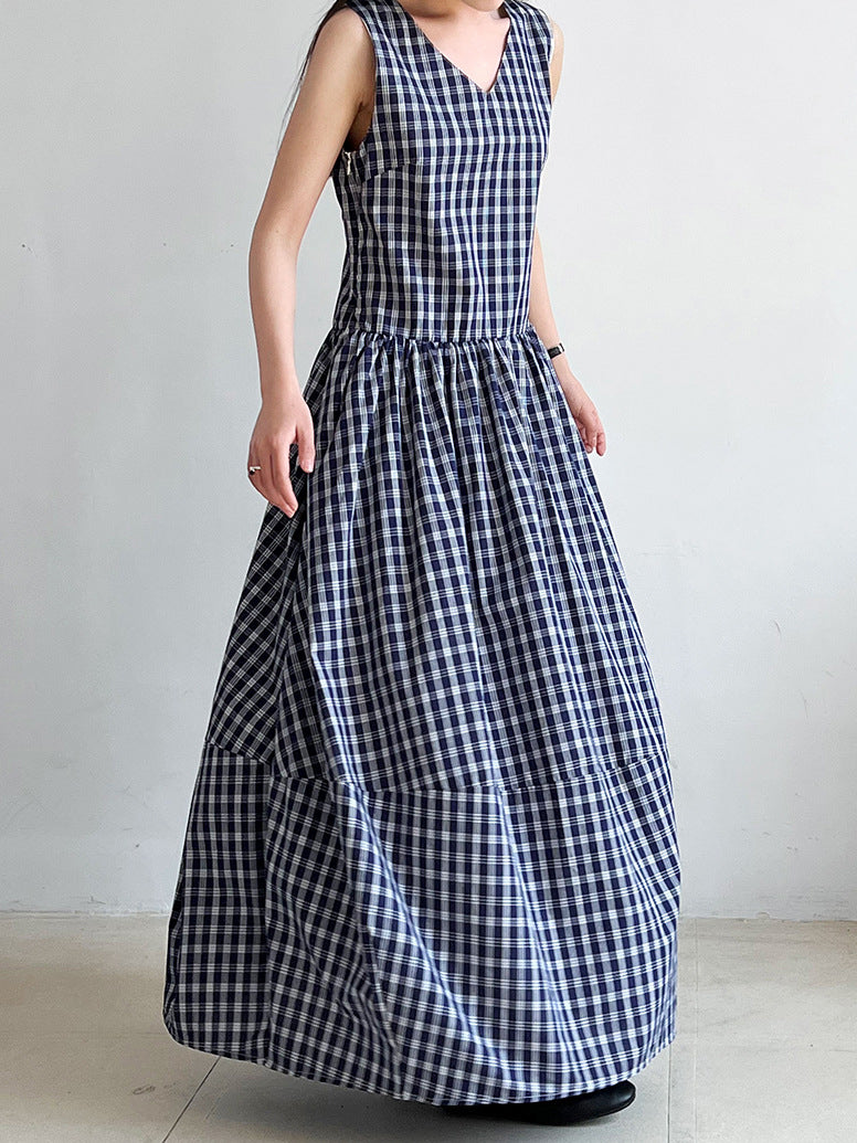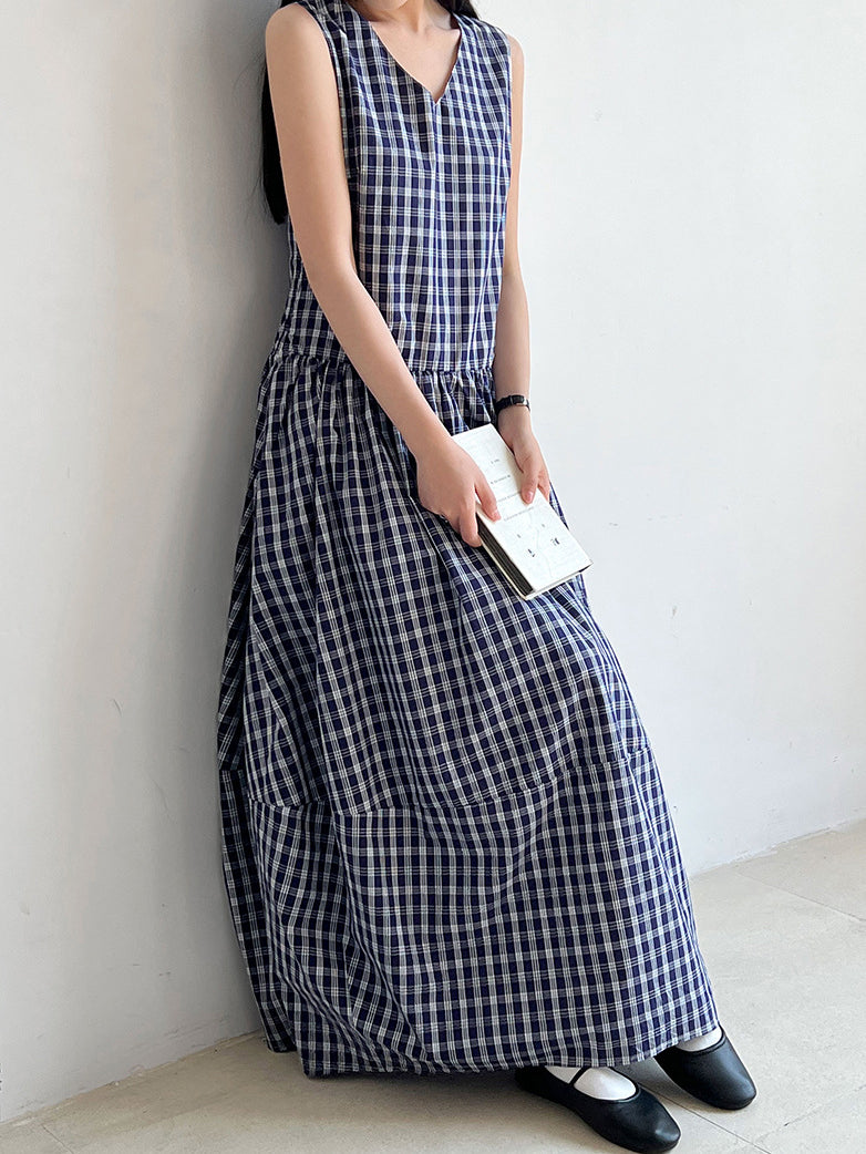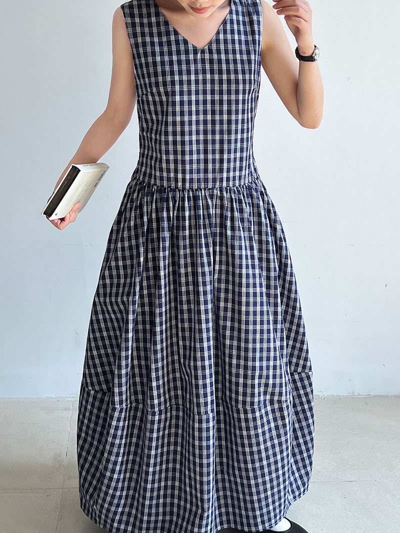 V-neck balloon silhouette check dress