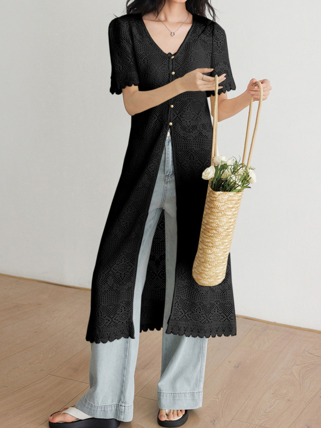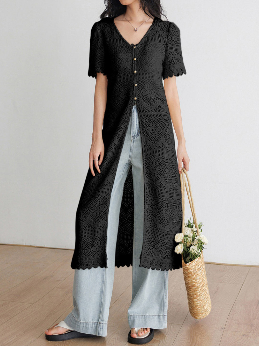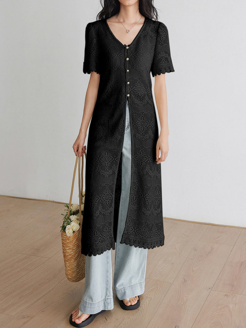 V-neck short-sleeved lace long jacket top (2 colors)