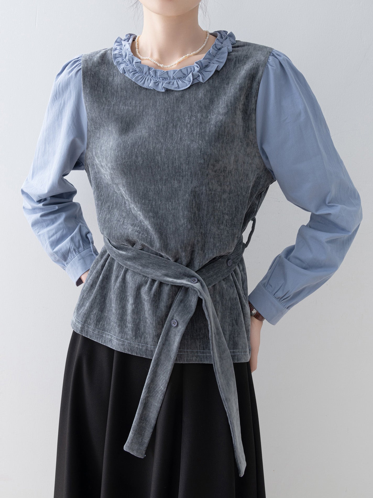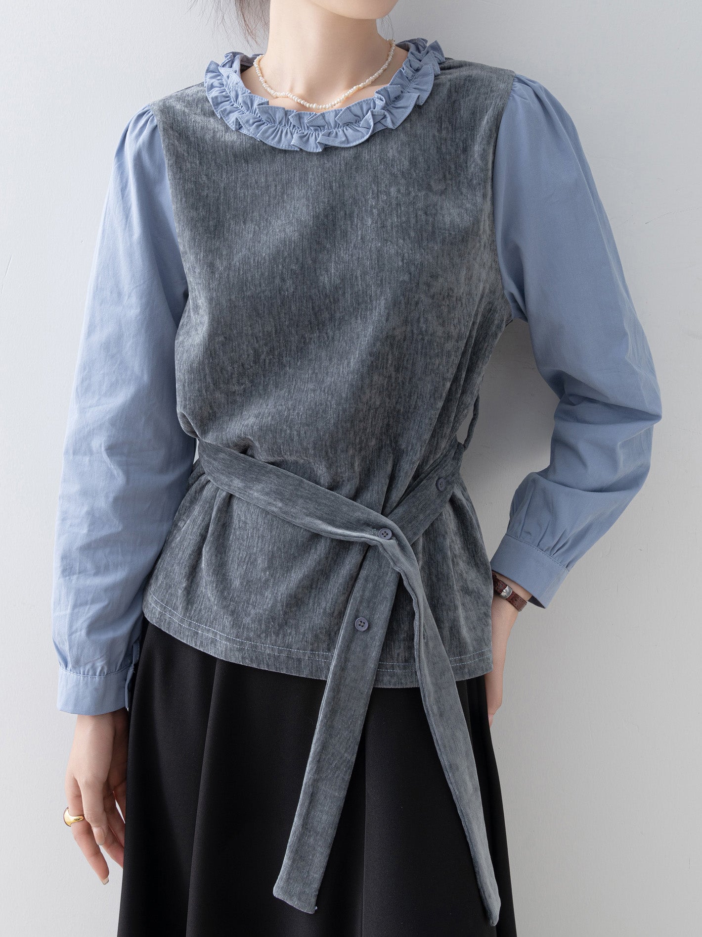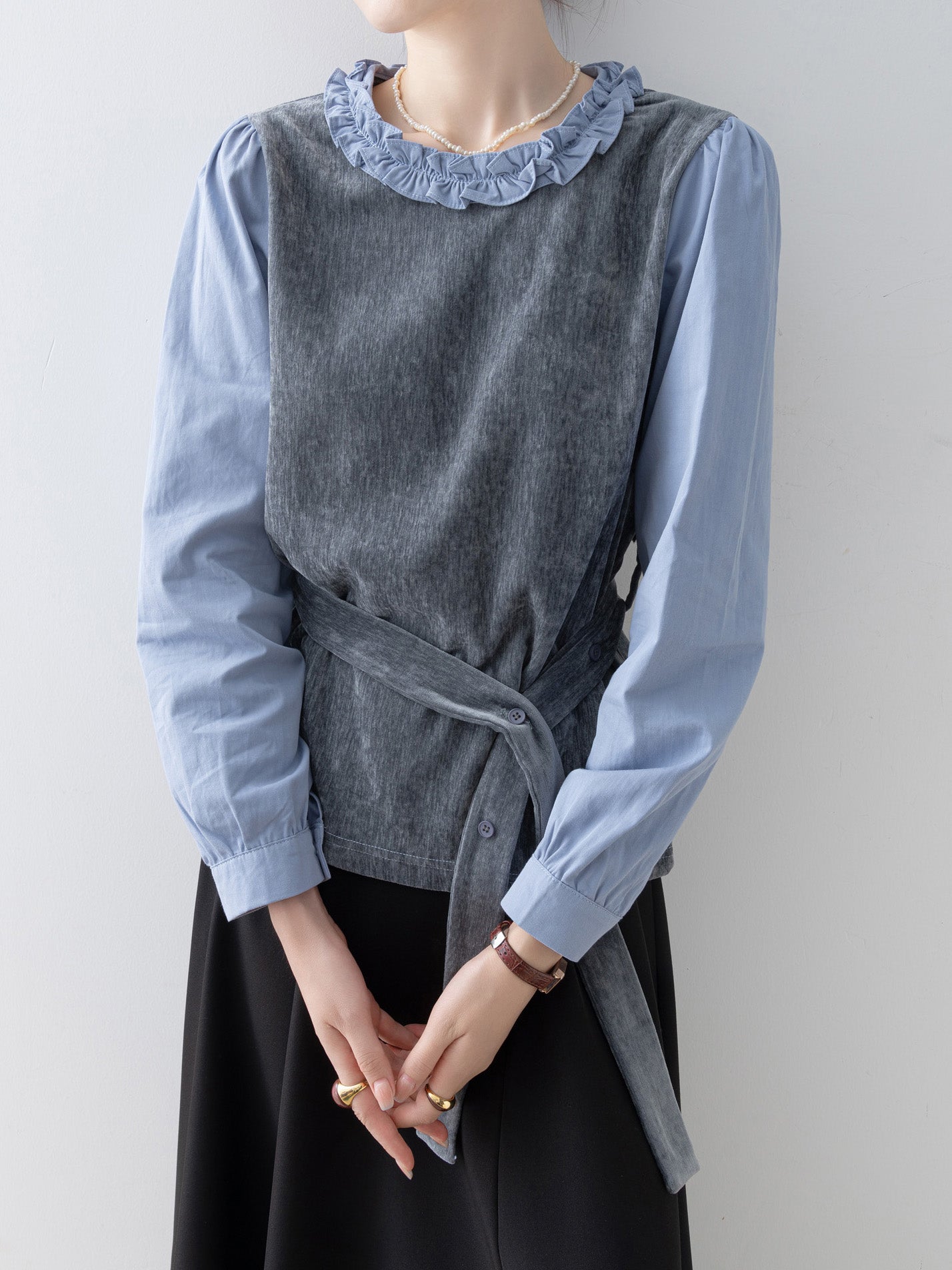 Frilled shirt docking belted blouse