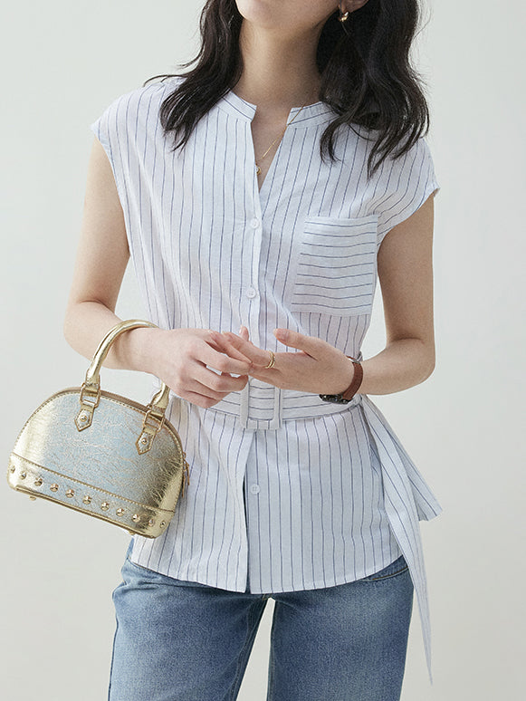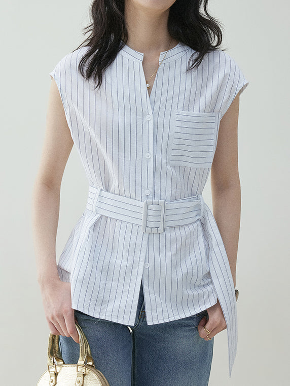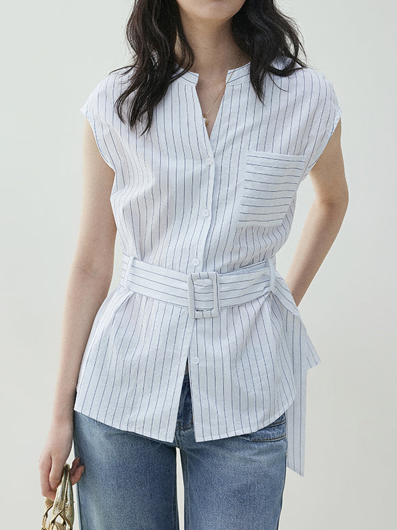 Buckle-belted striped blouse
