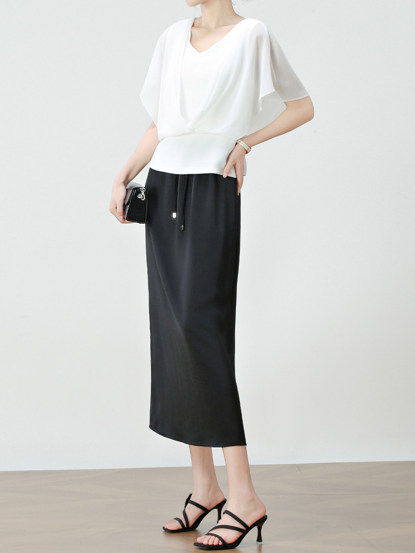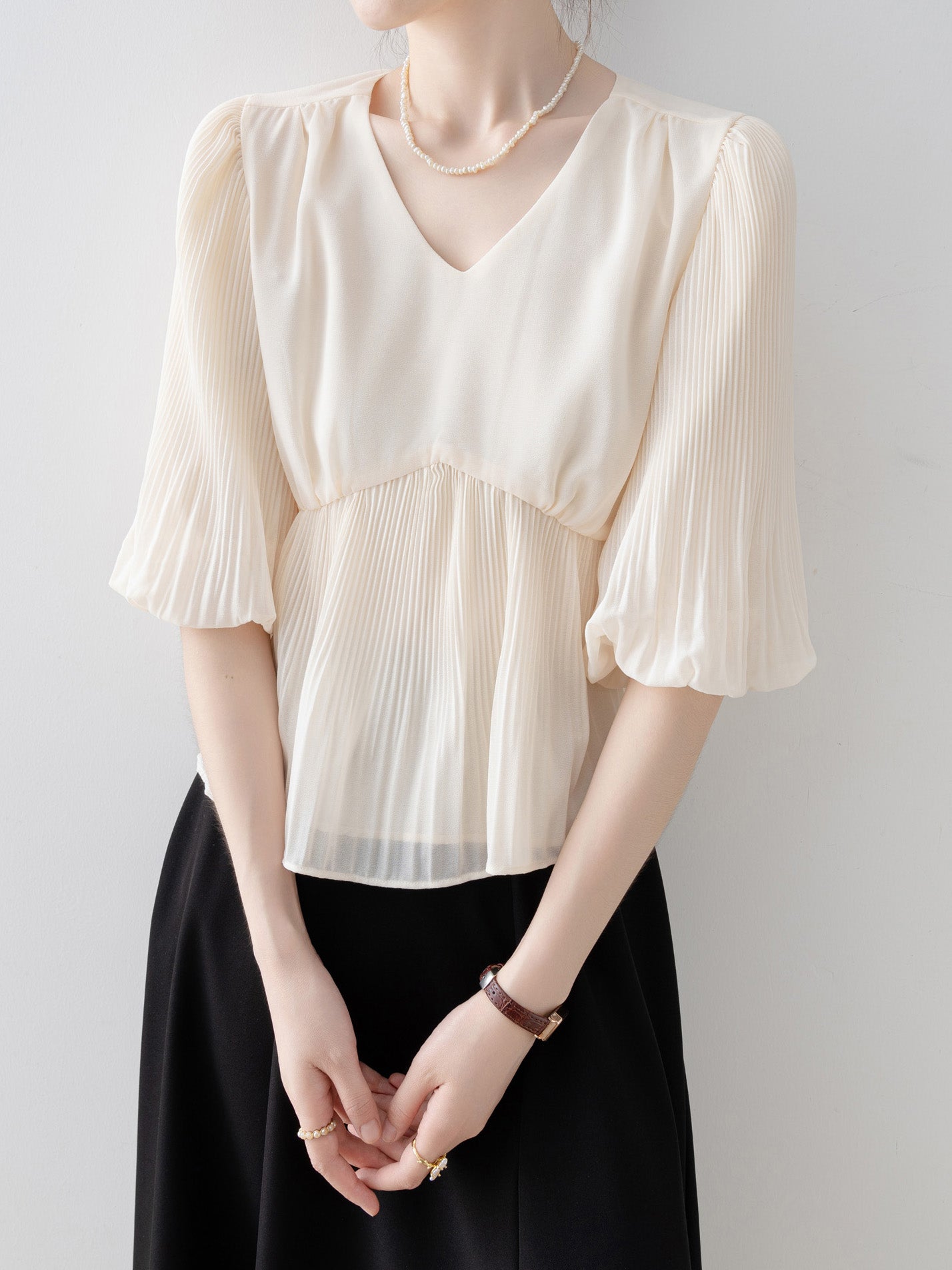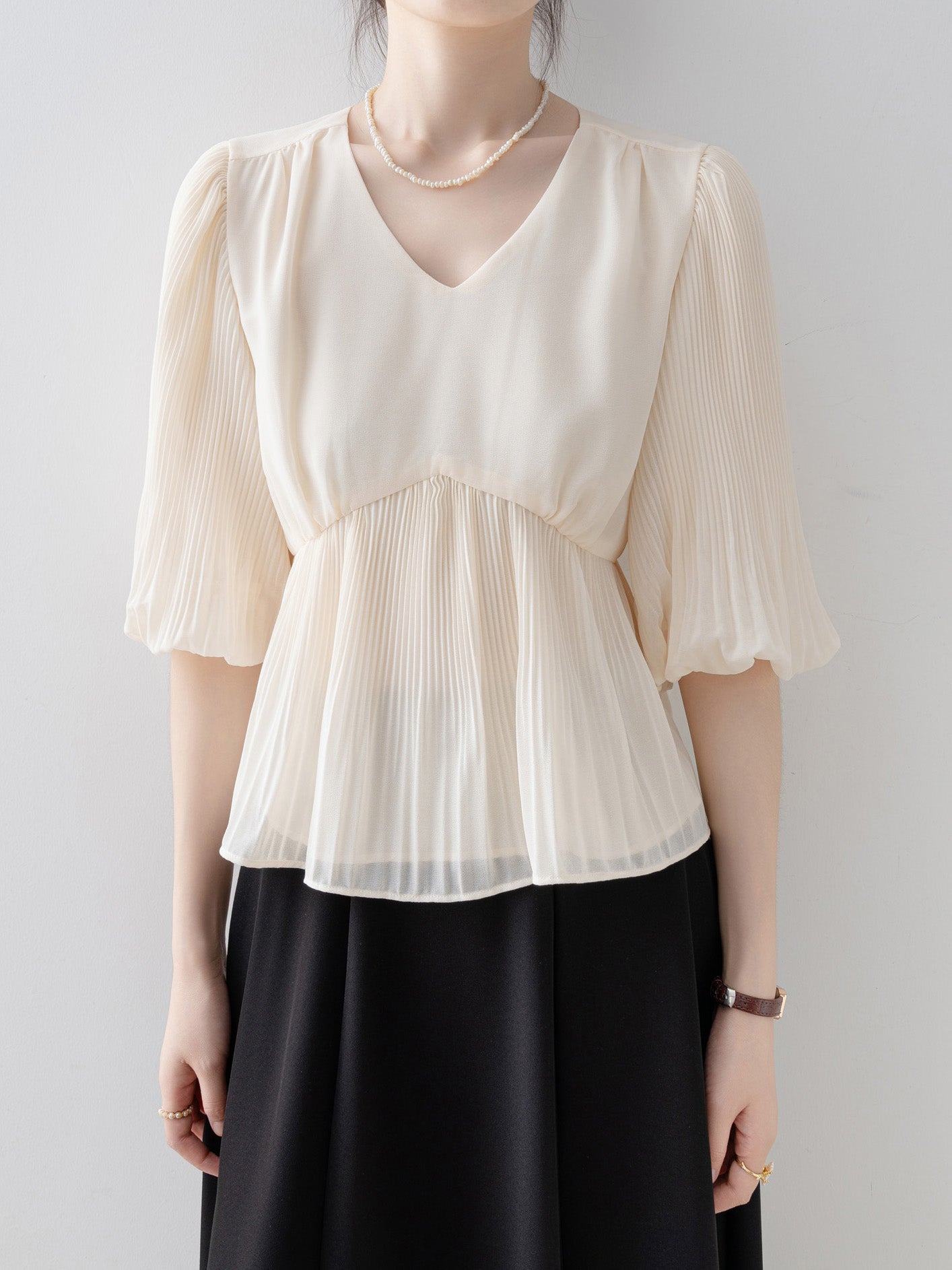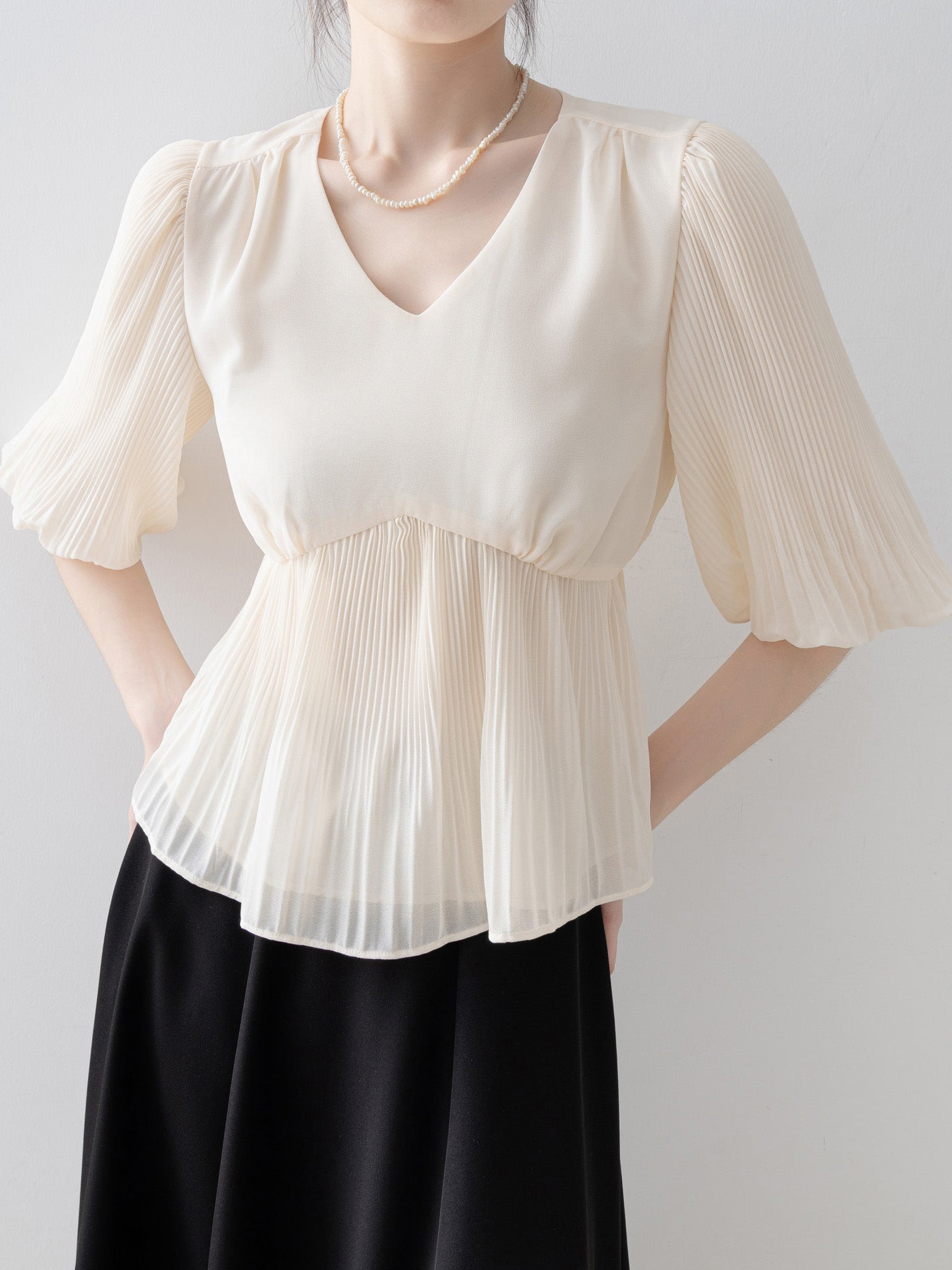 V-neck peplum pleated blouse in 2 colors