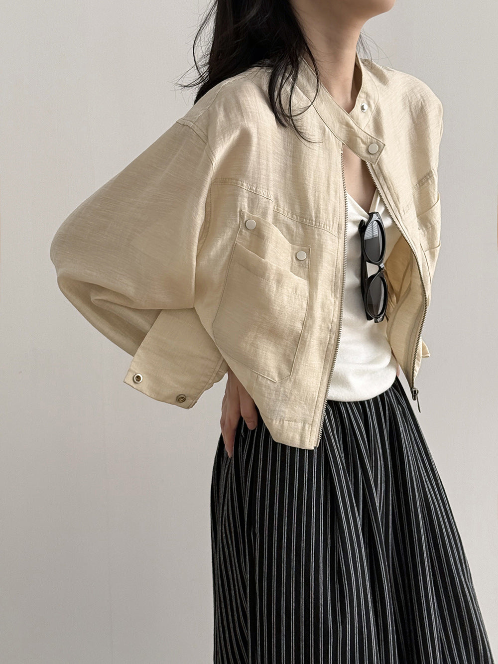 This jacket features a clean stand collar and a compact length.