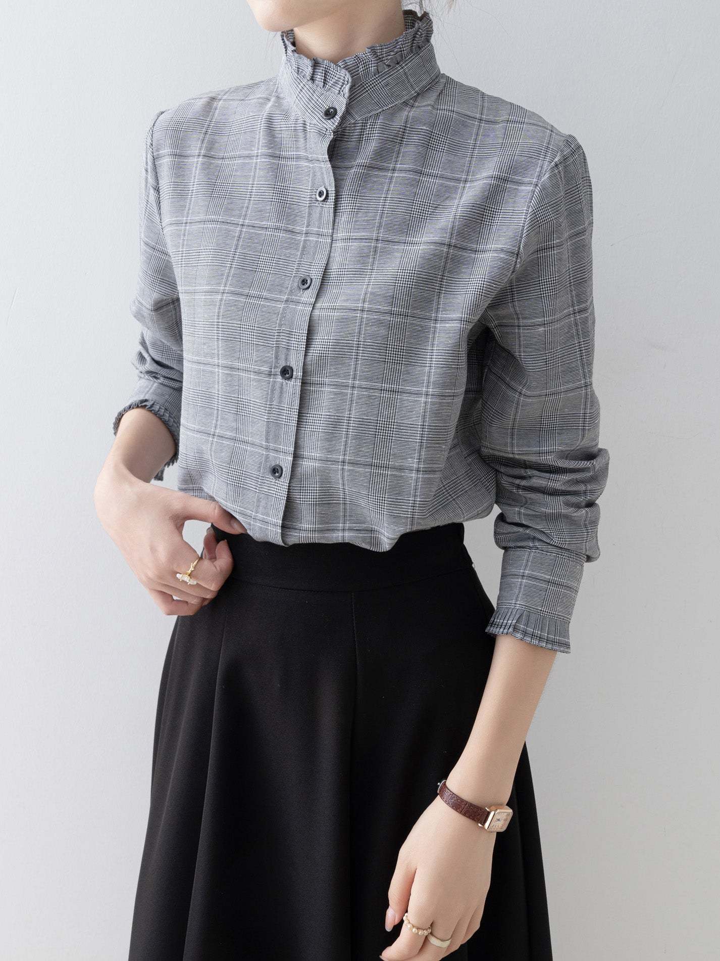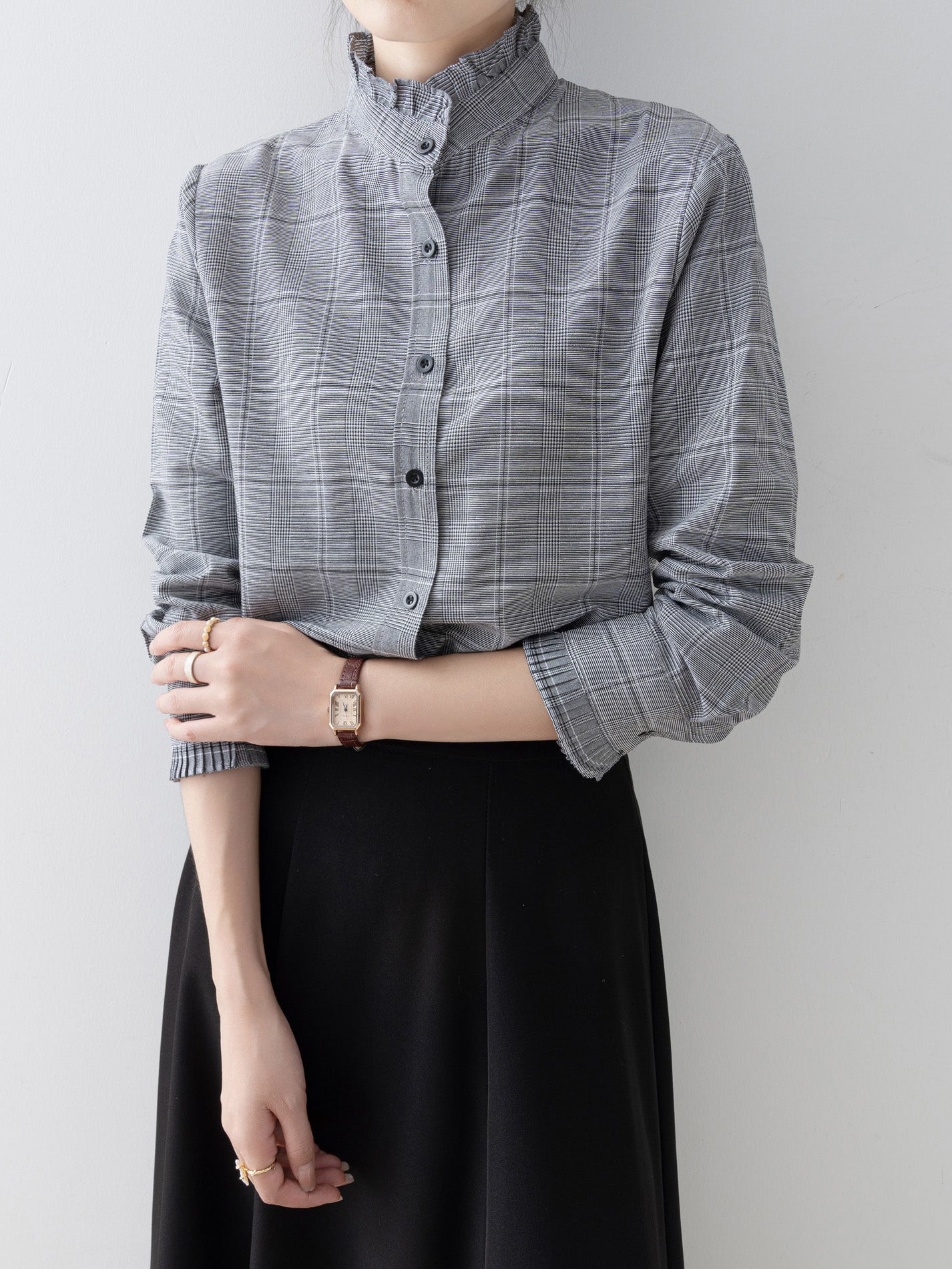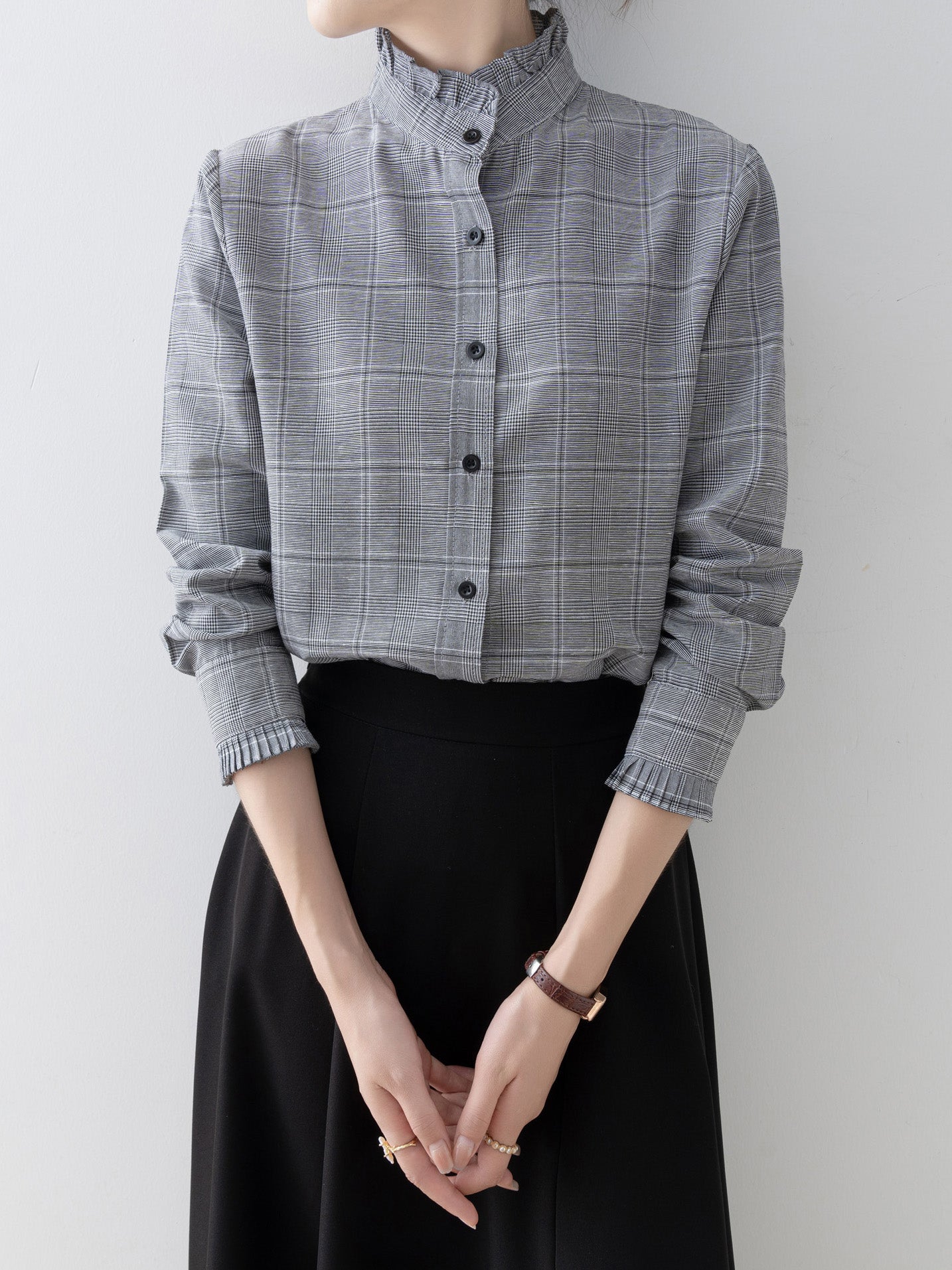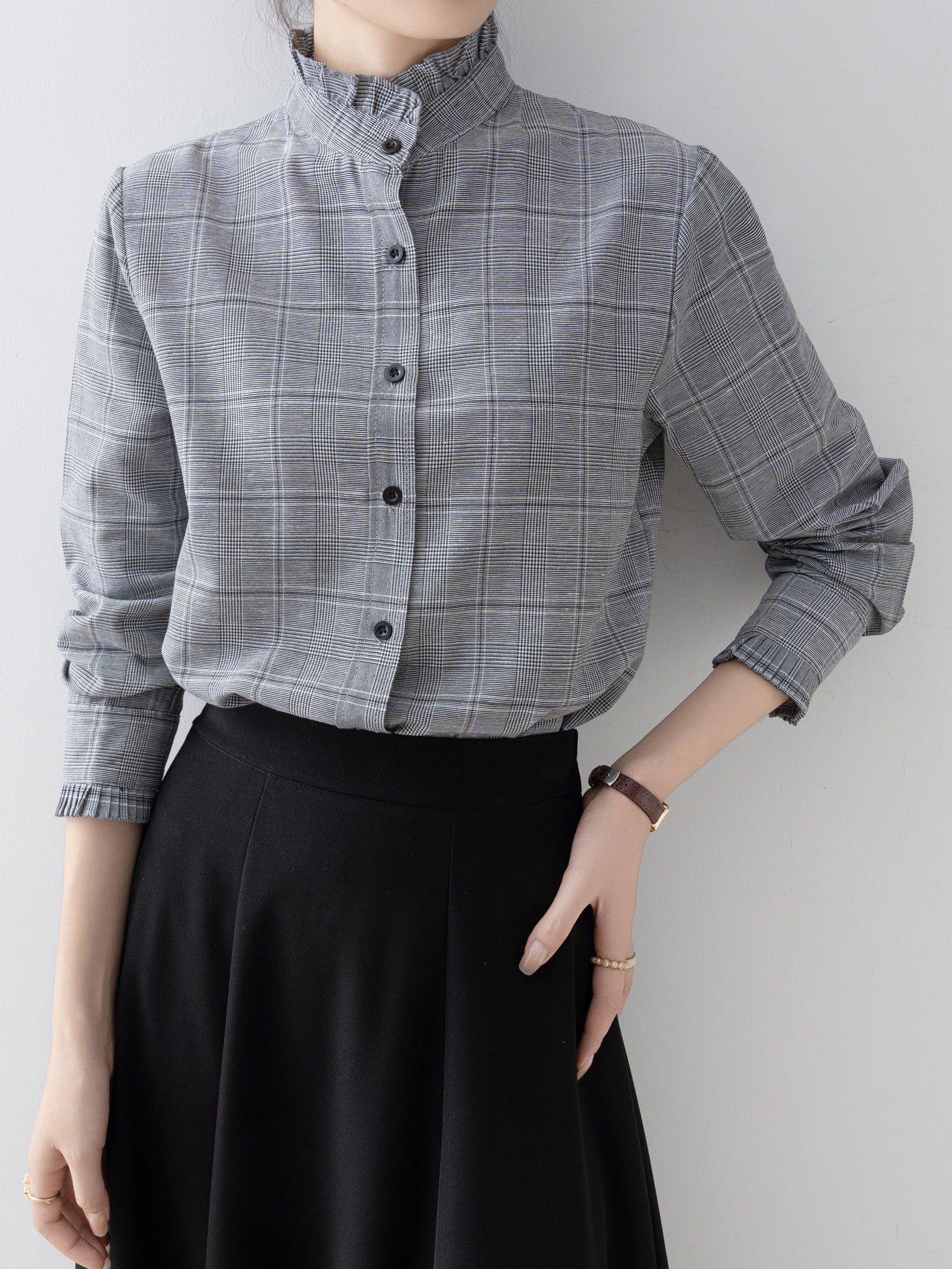 A band collar blouse with a delicate check pattern and ruffle design that catches the eye.