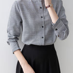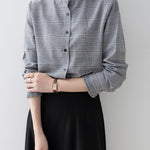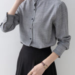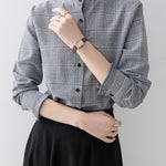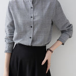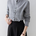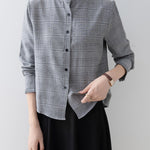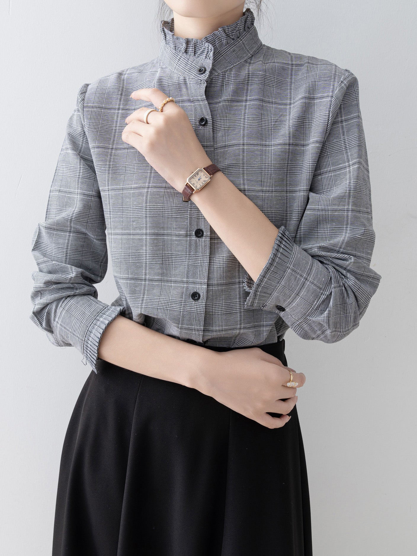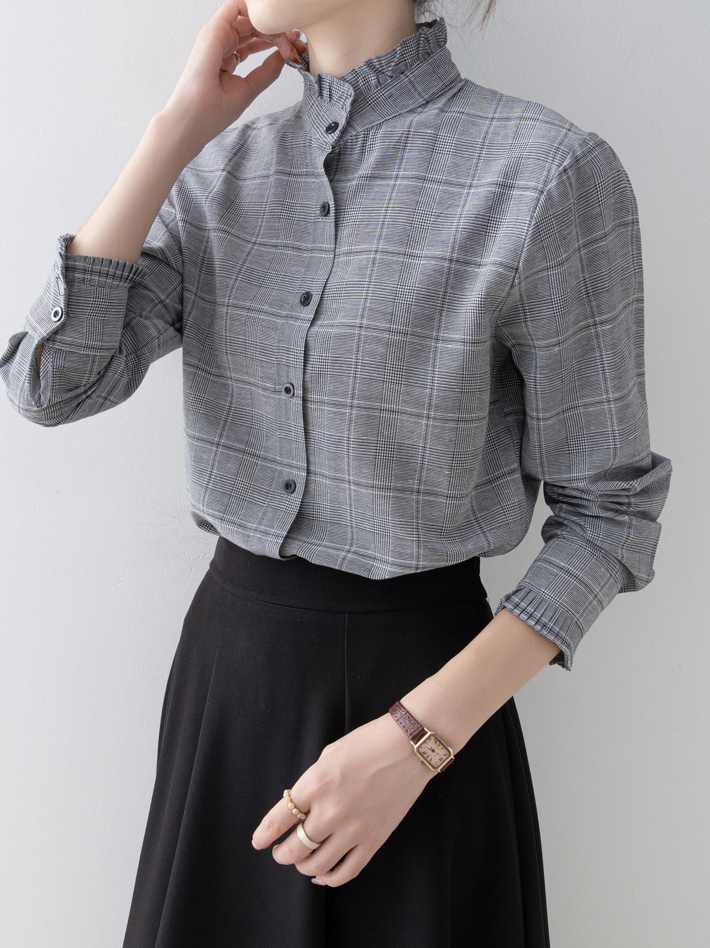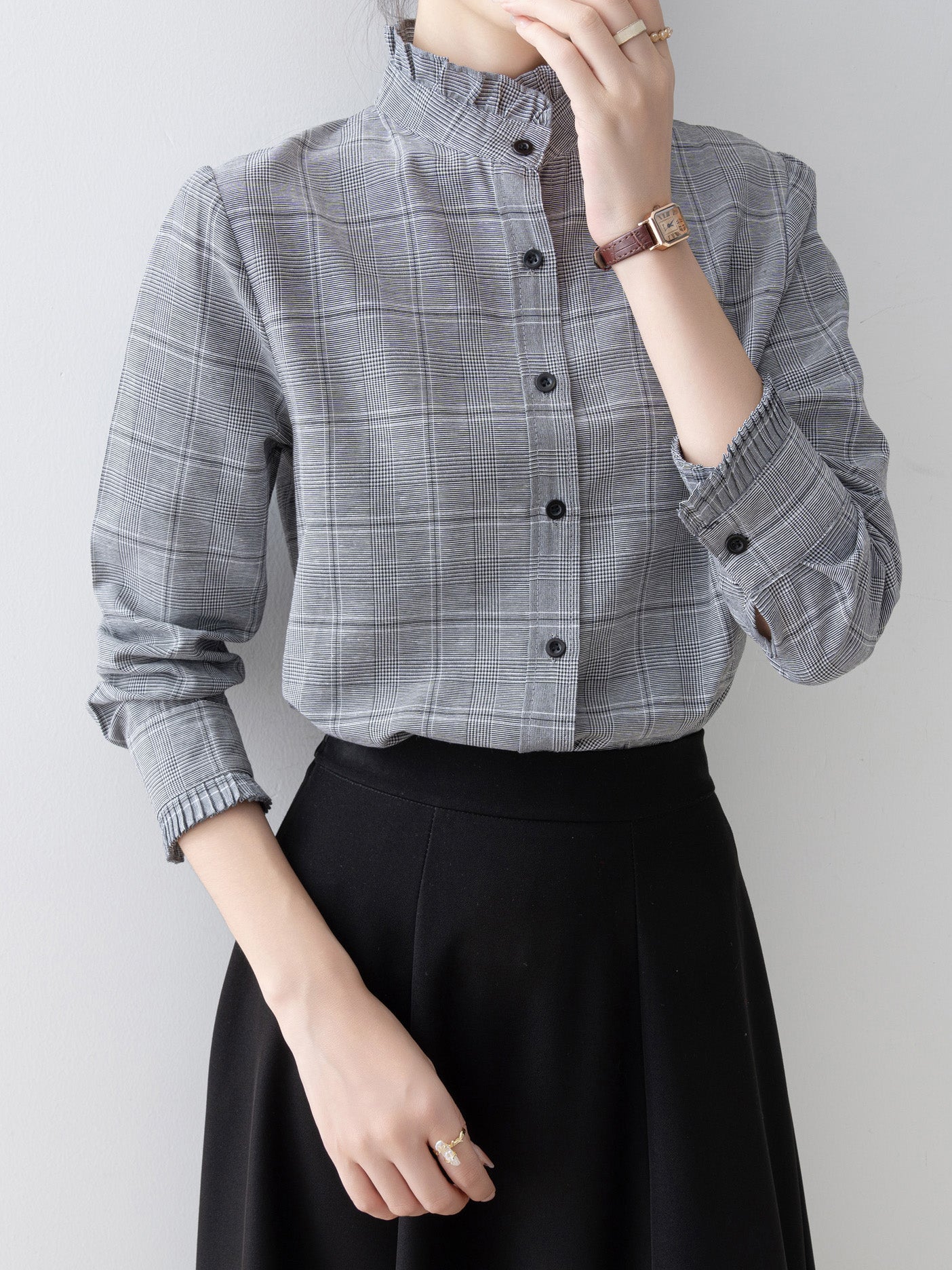 A band collar blouse with a delicate check pattern and ruffle design that catches the eye.
