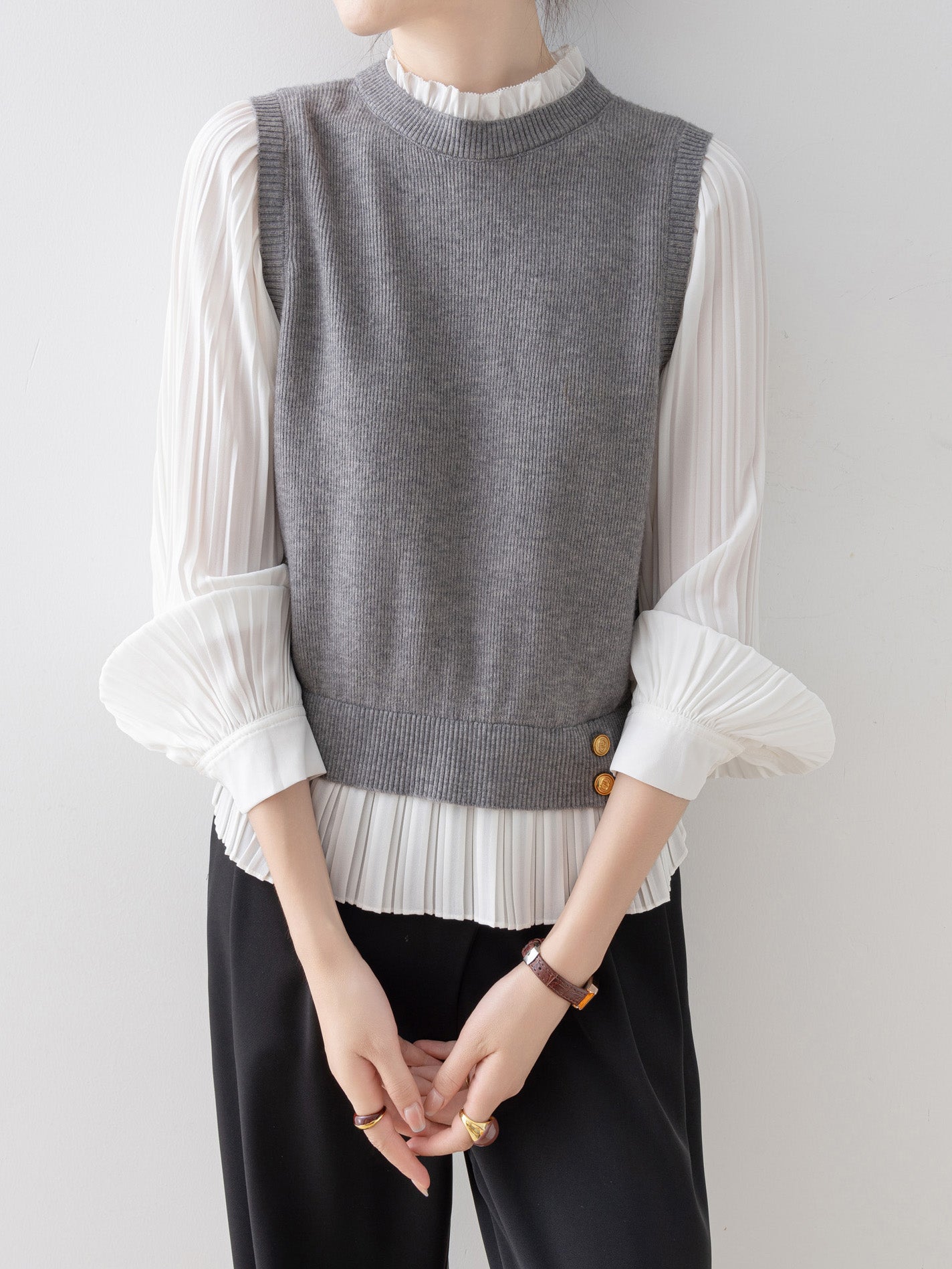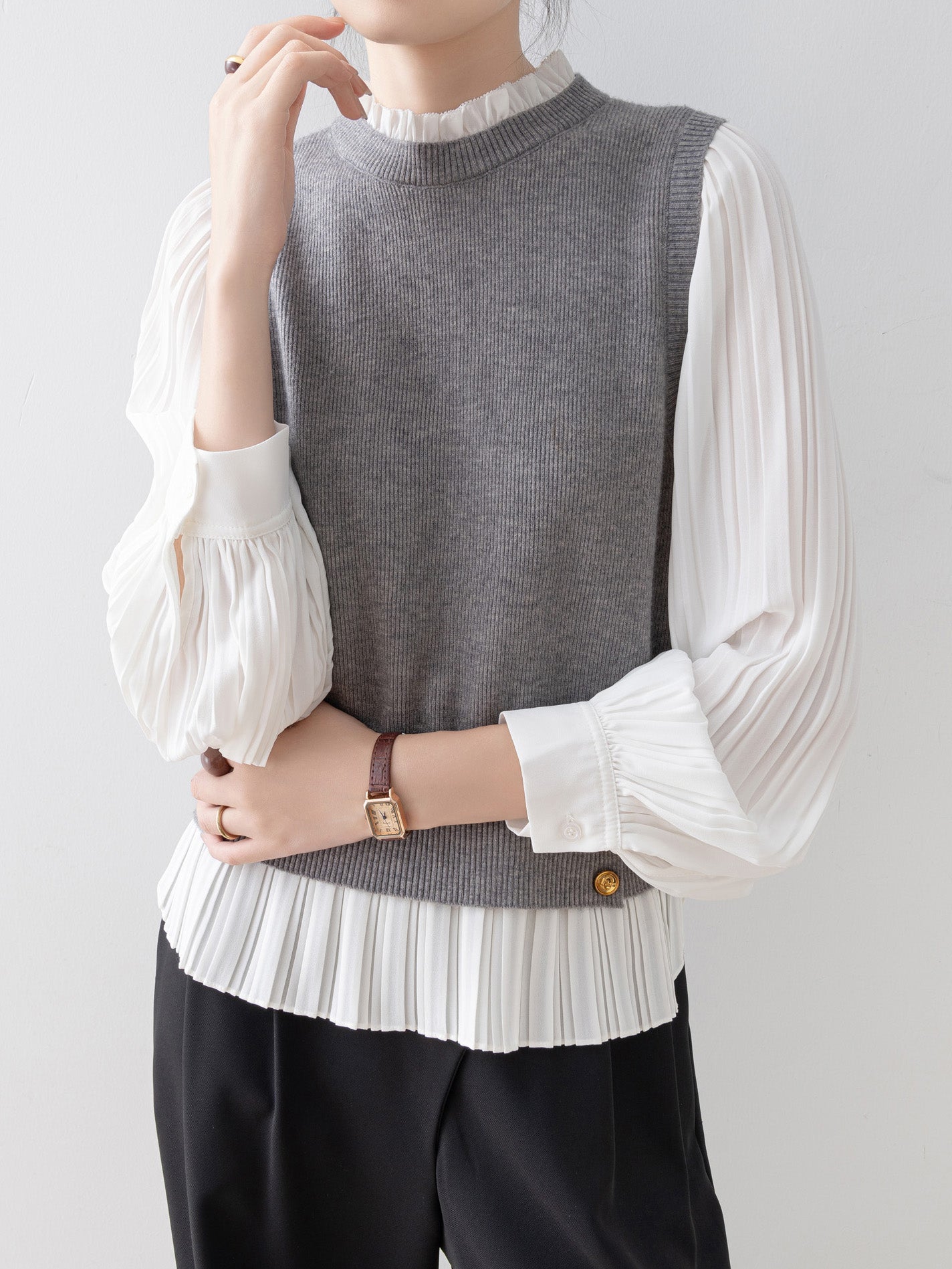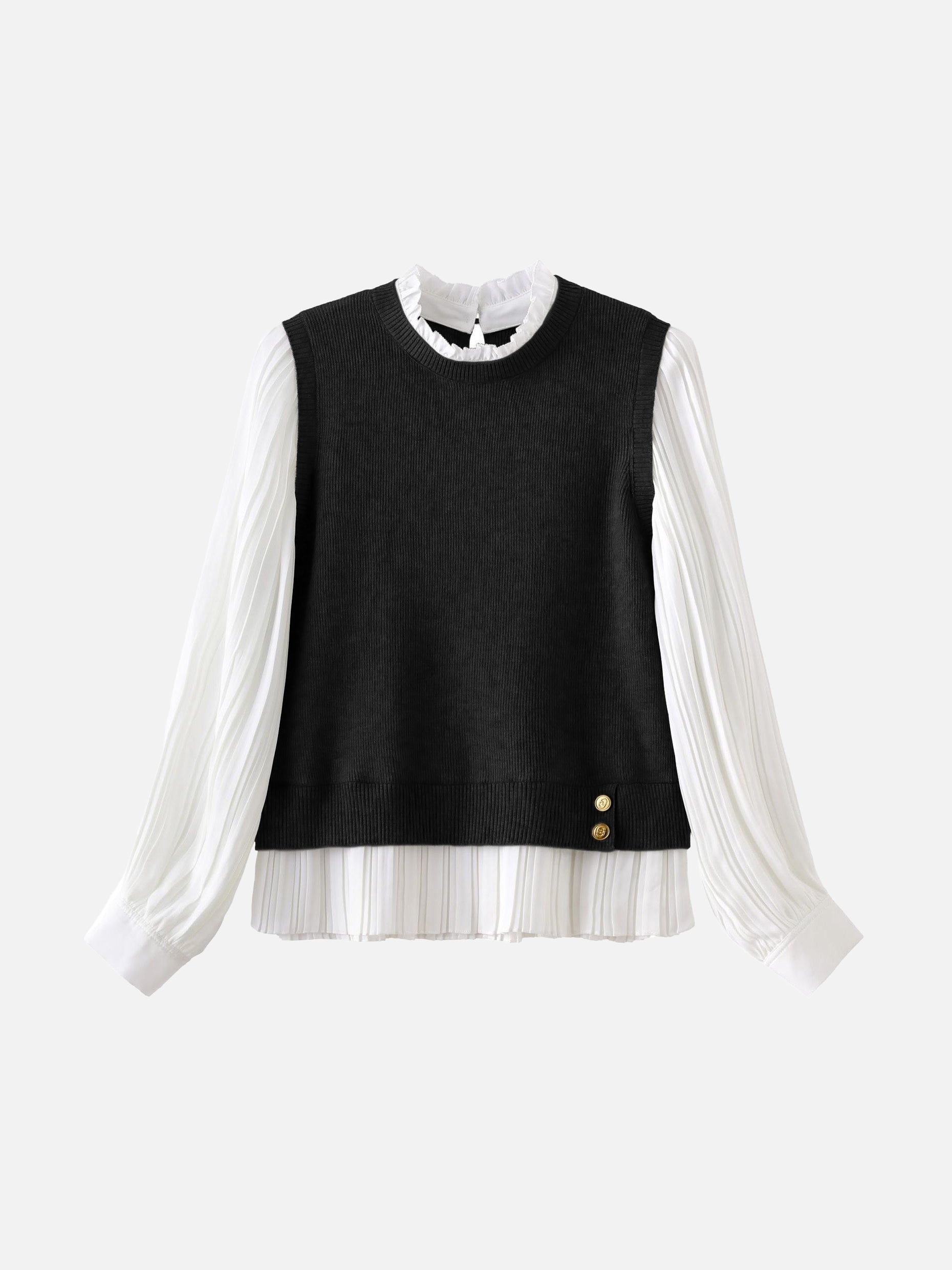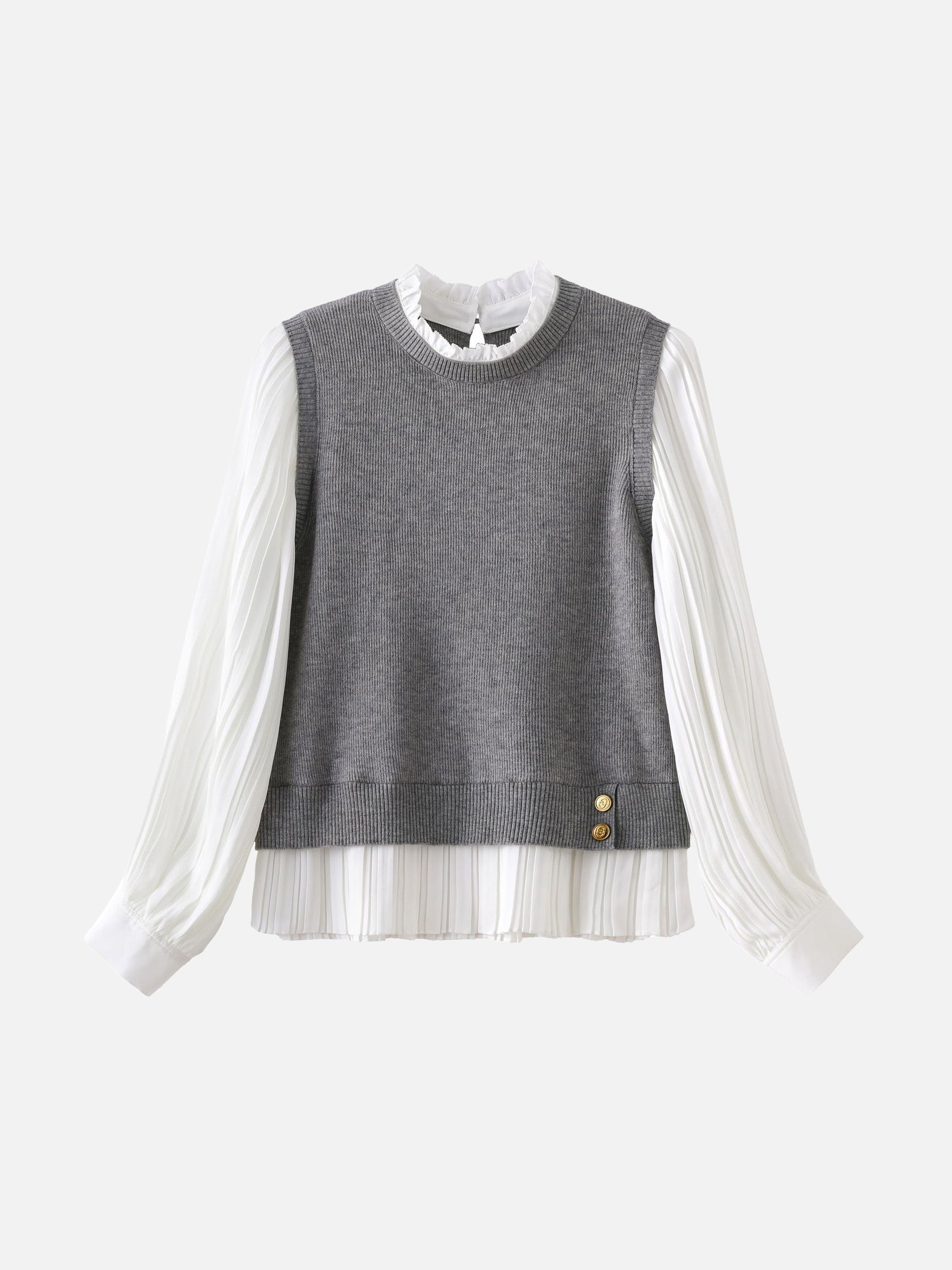 This is a docking item that looks like a knit vest and pleated blouse layered together.