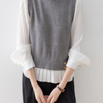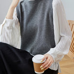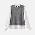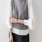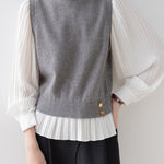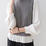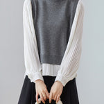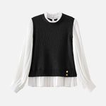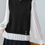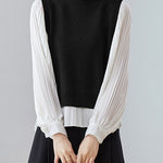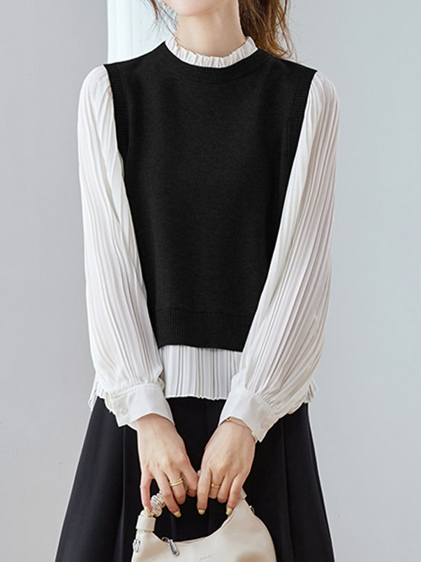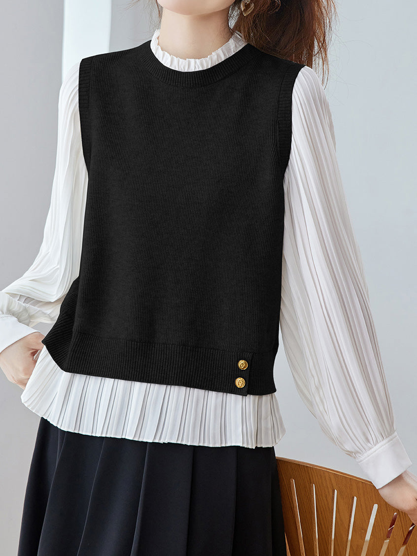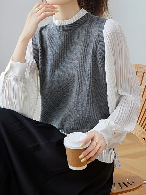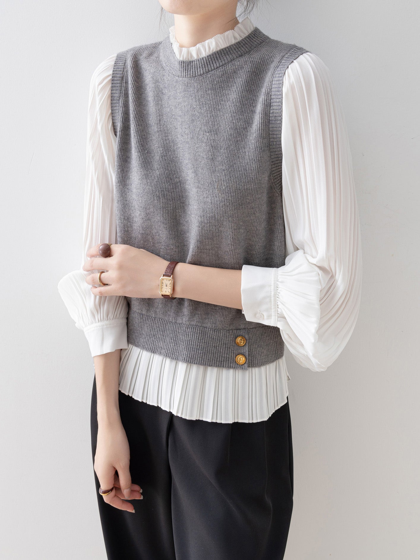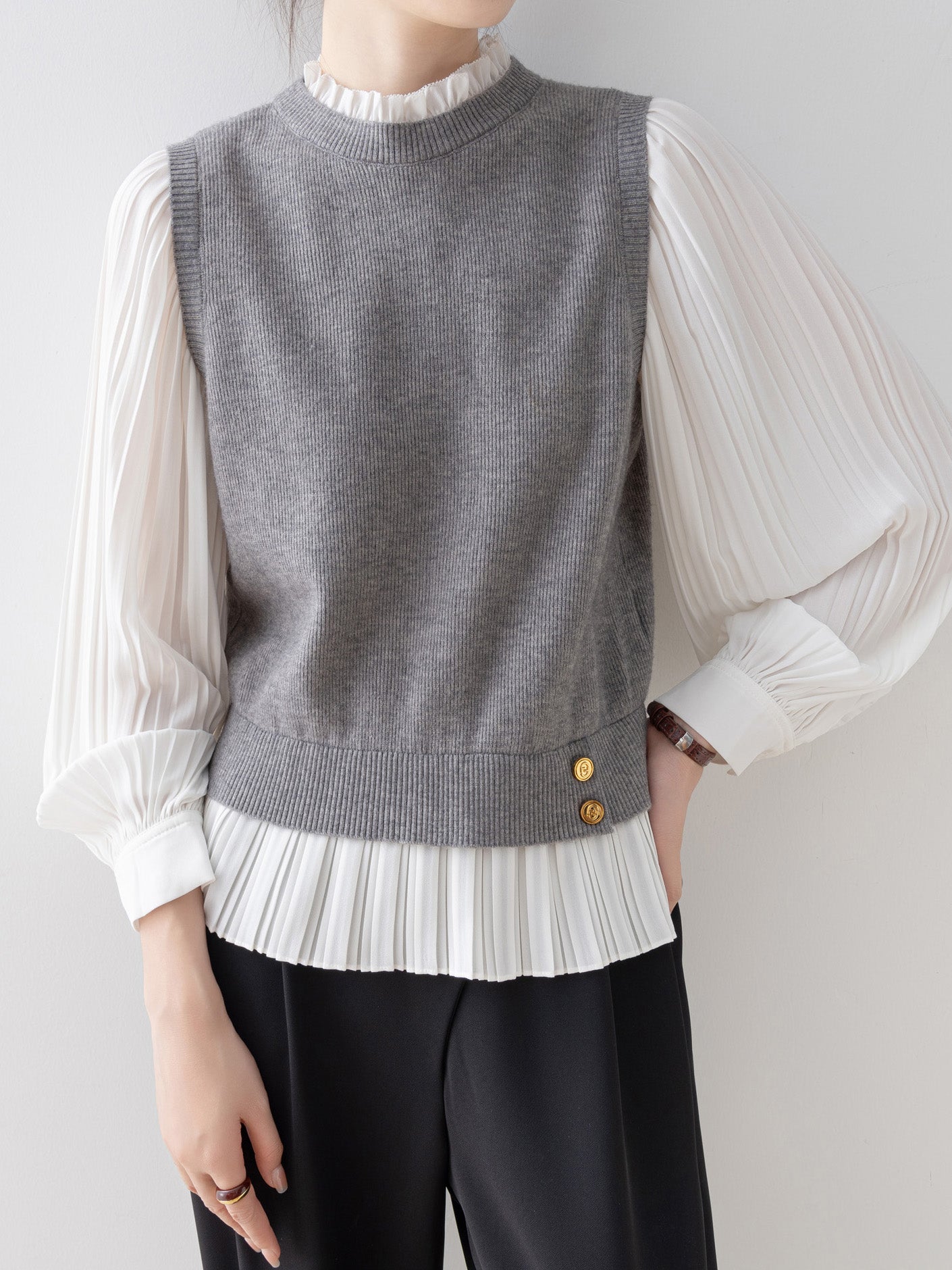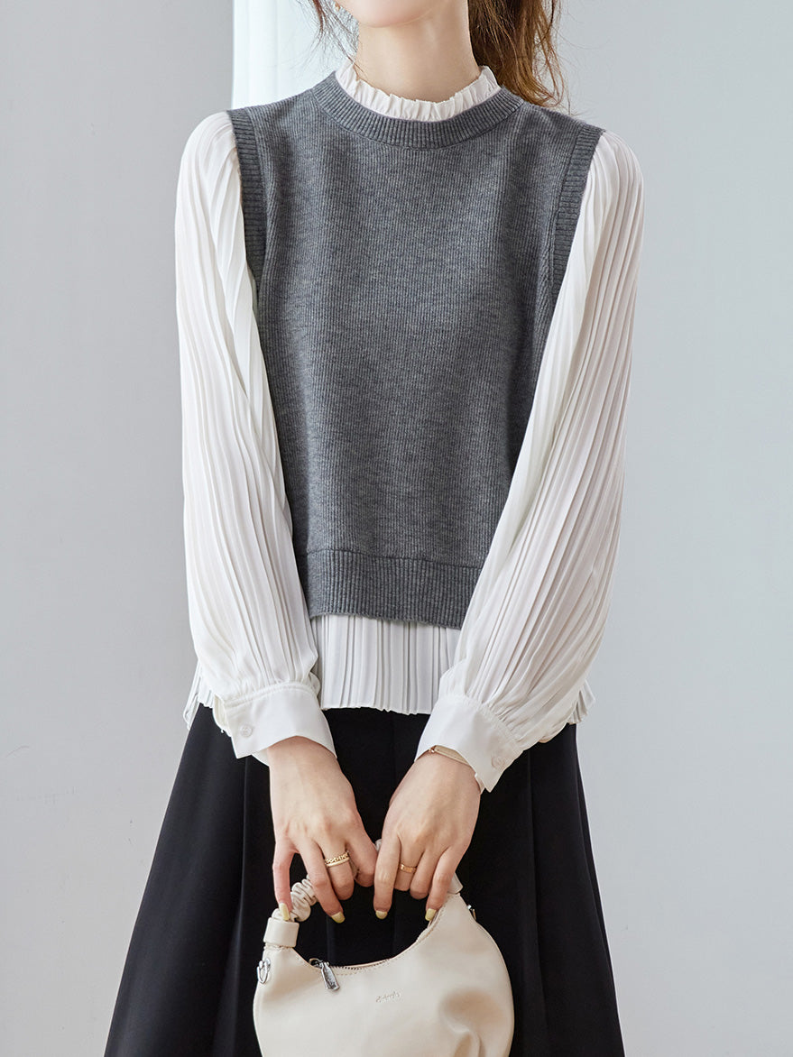 This is a docking item that looks like a knit vest and pleated blouse layered together.