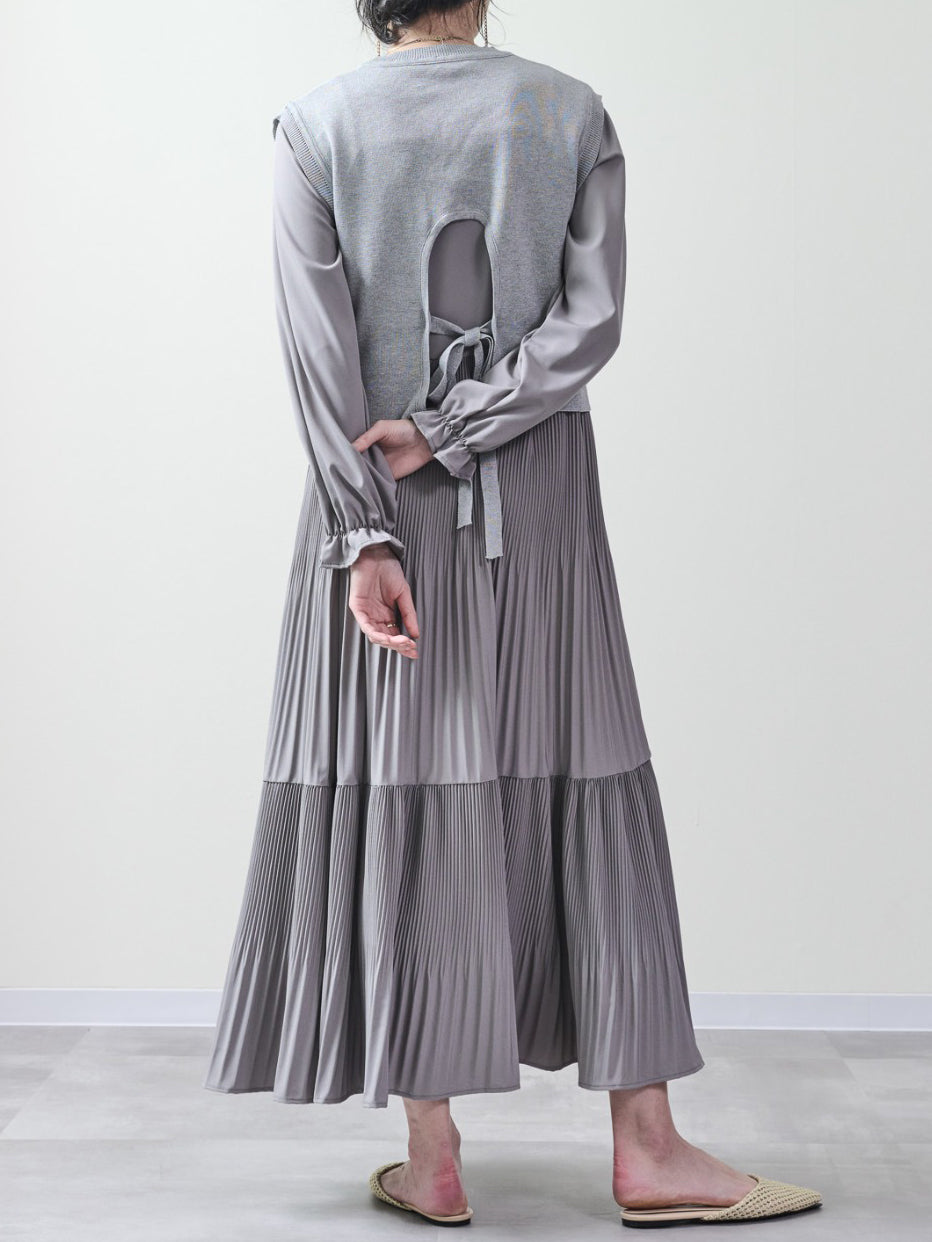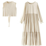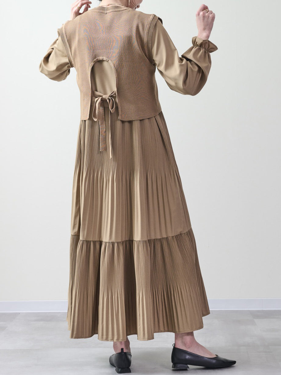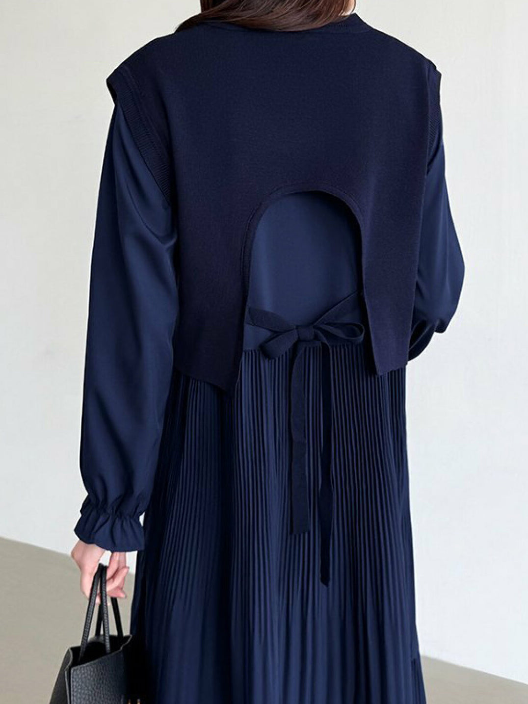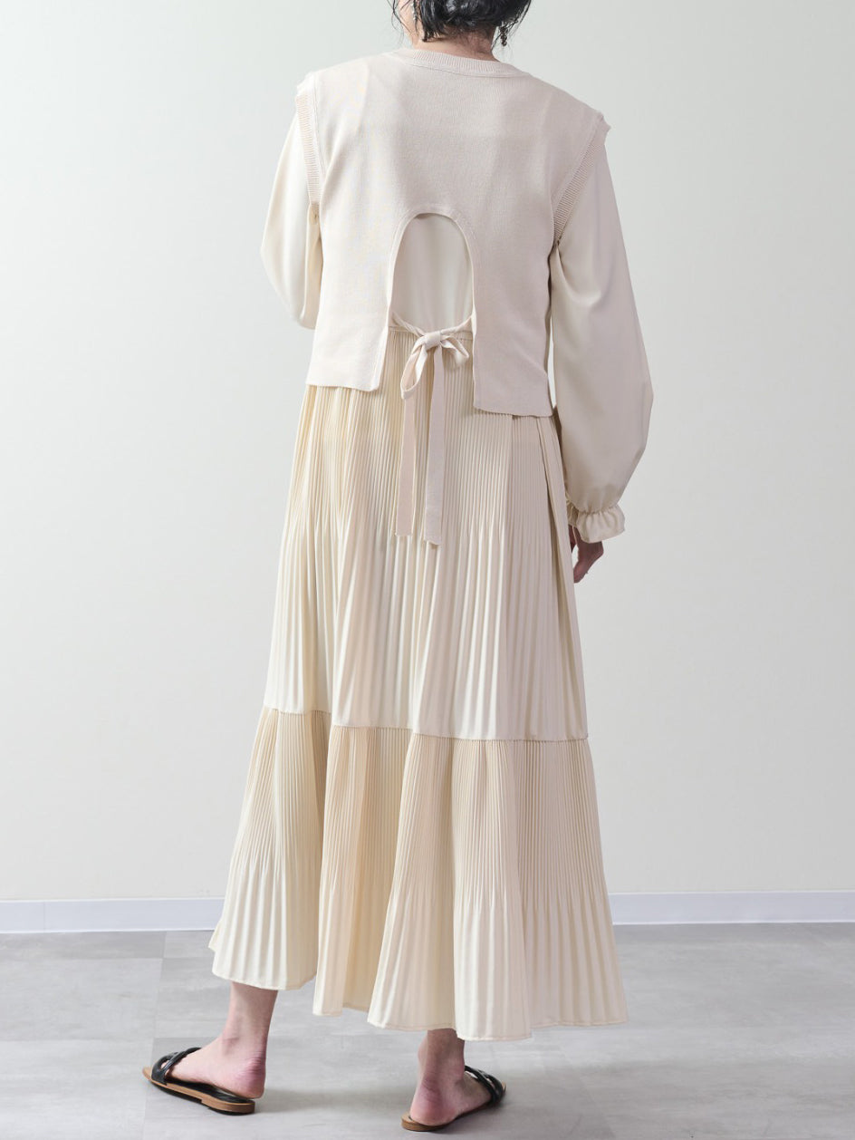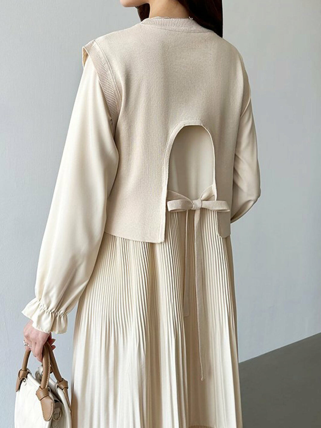 Back Ribbon Knit Vest + Pleated Dress Set (5 Colors)