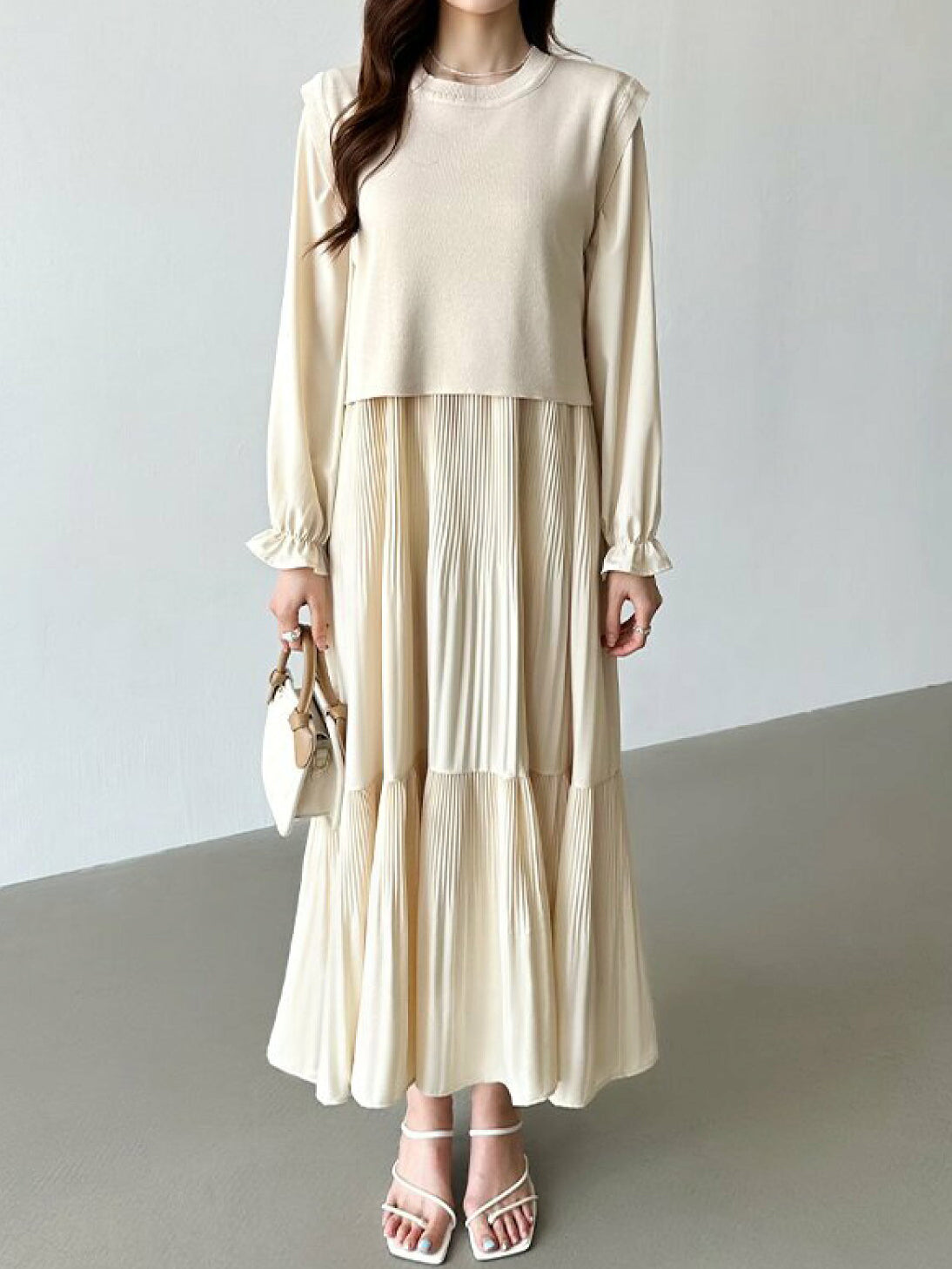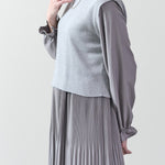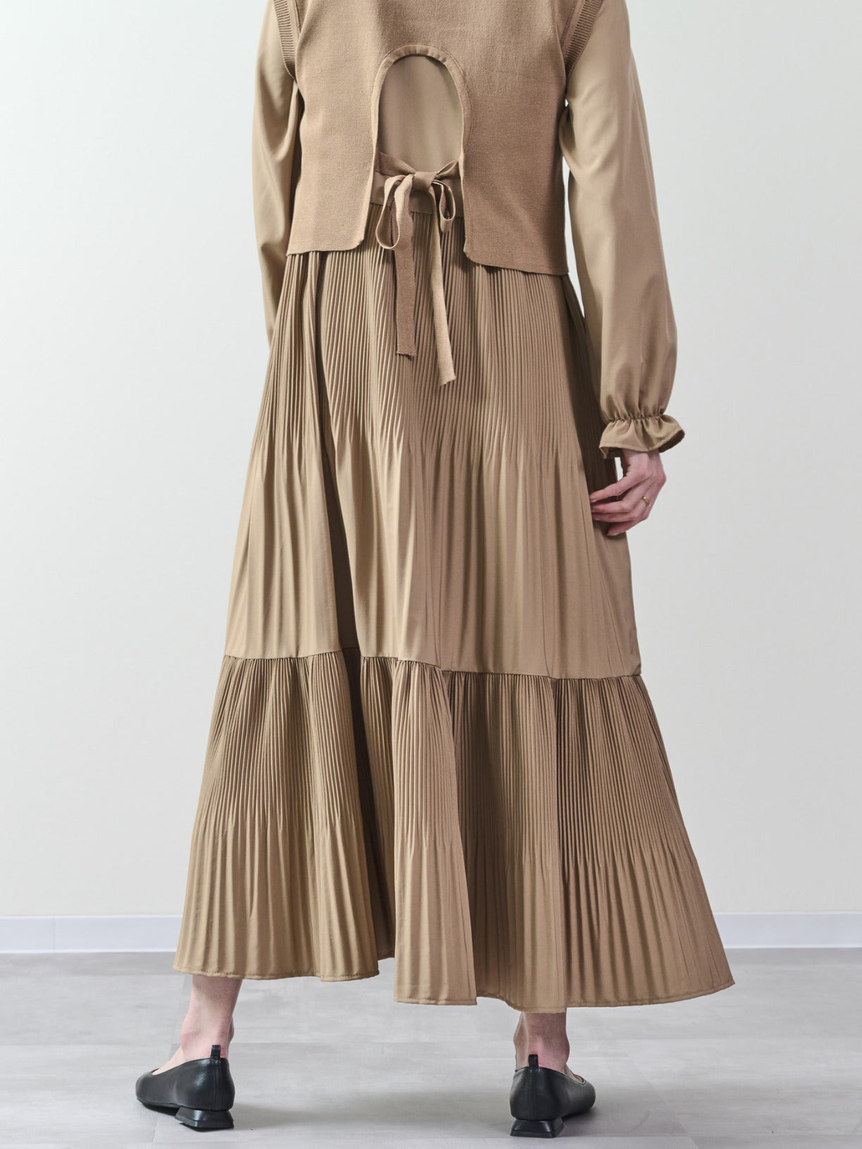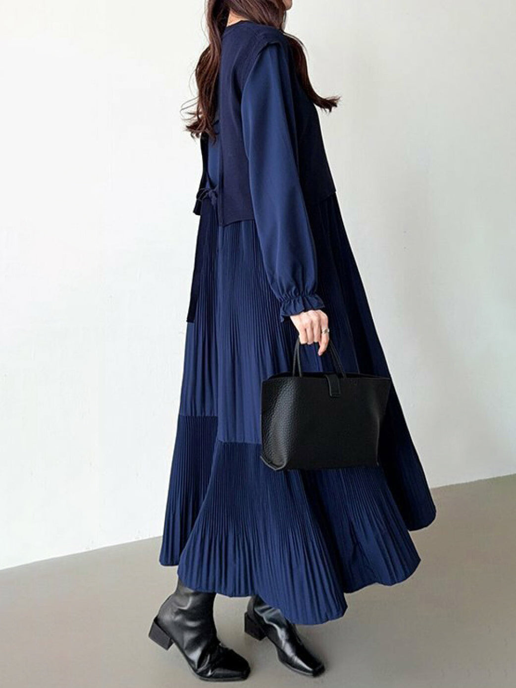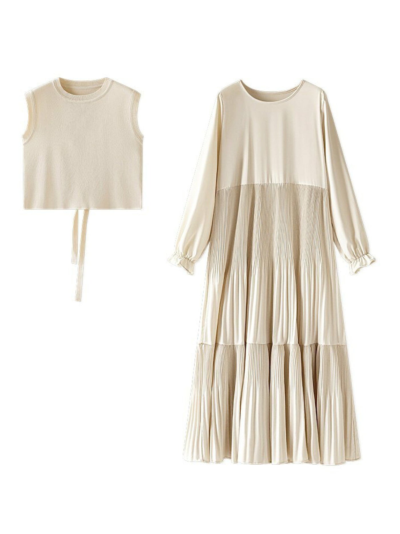 Back Ribbon Knit Vest + Pleated Dress Set (5 Colors)