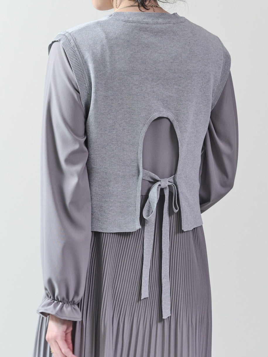 ☆背面のニットベストはざっくりと開いたデザインにリボンをあしらい、シルエット調整が可能です。
