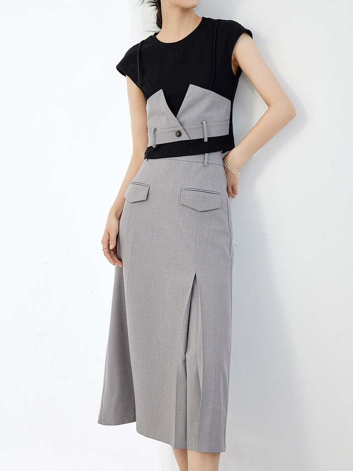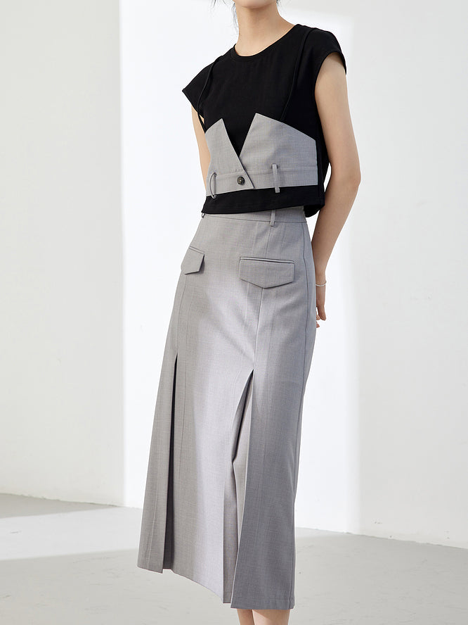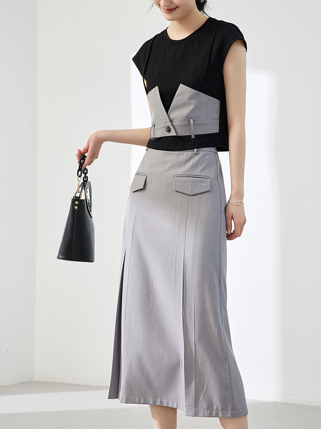 Color-coordinated bustier docking T-shirt + flap tuck-in skirt SET