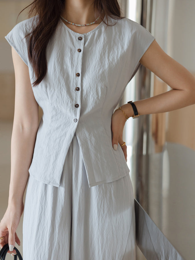 Wrinkled sleeveless blouse and wide pants set (2 colors)