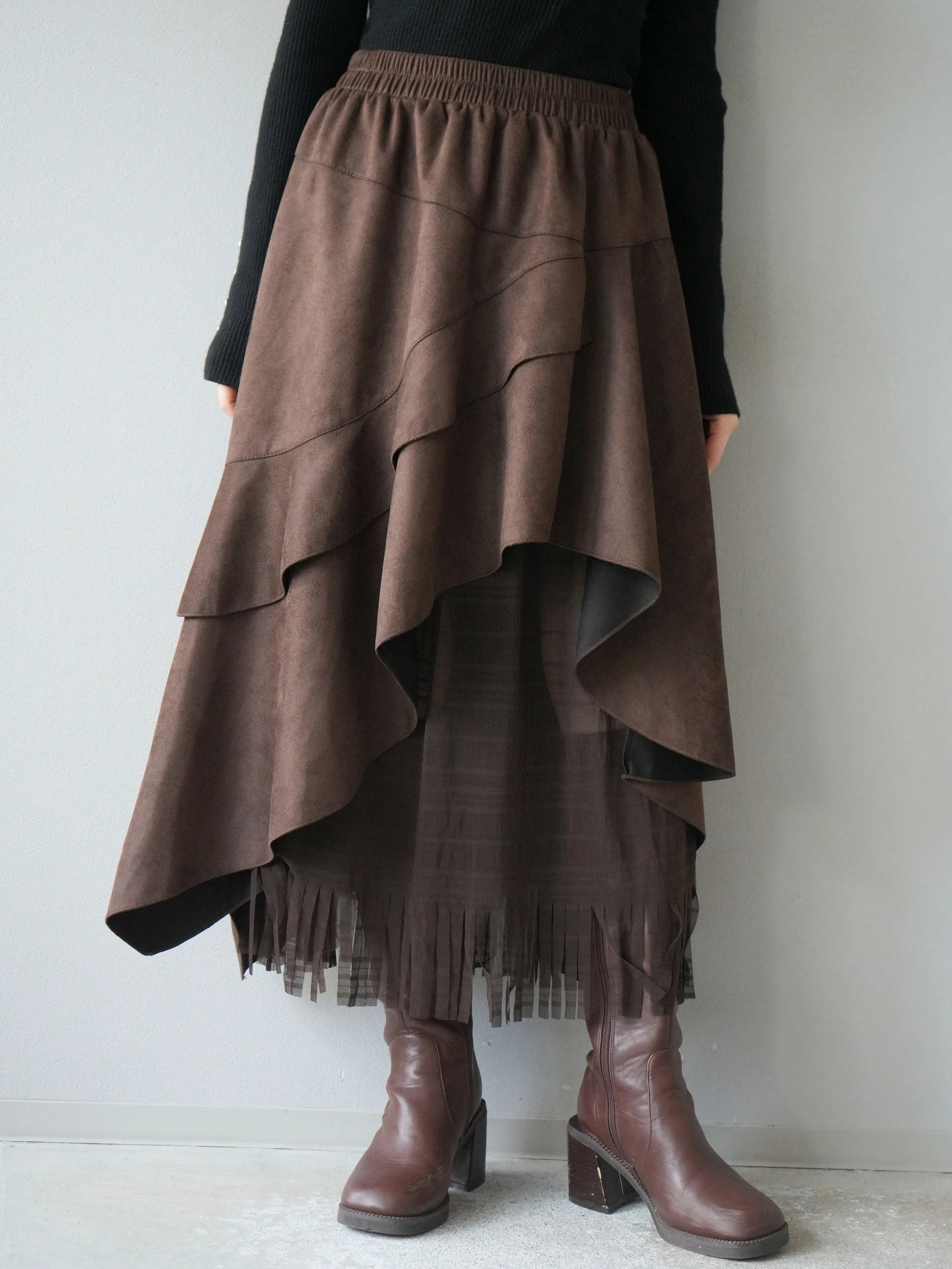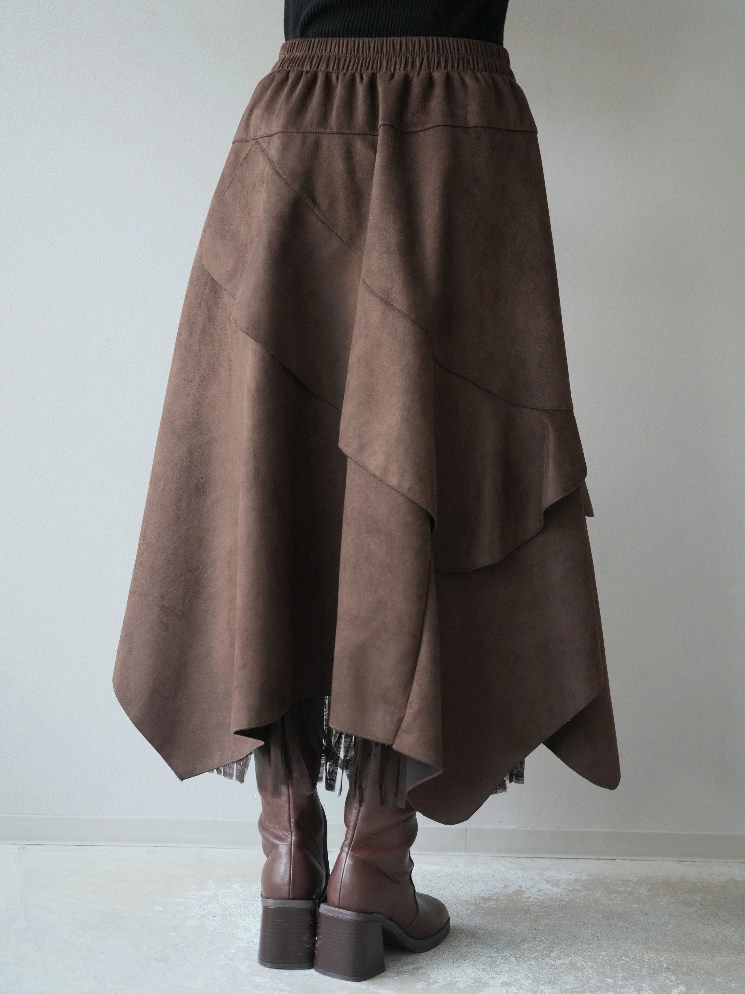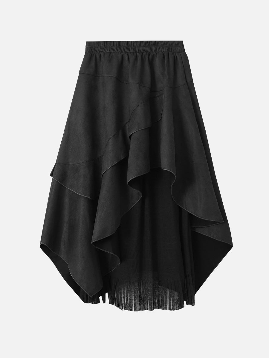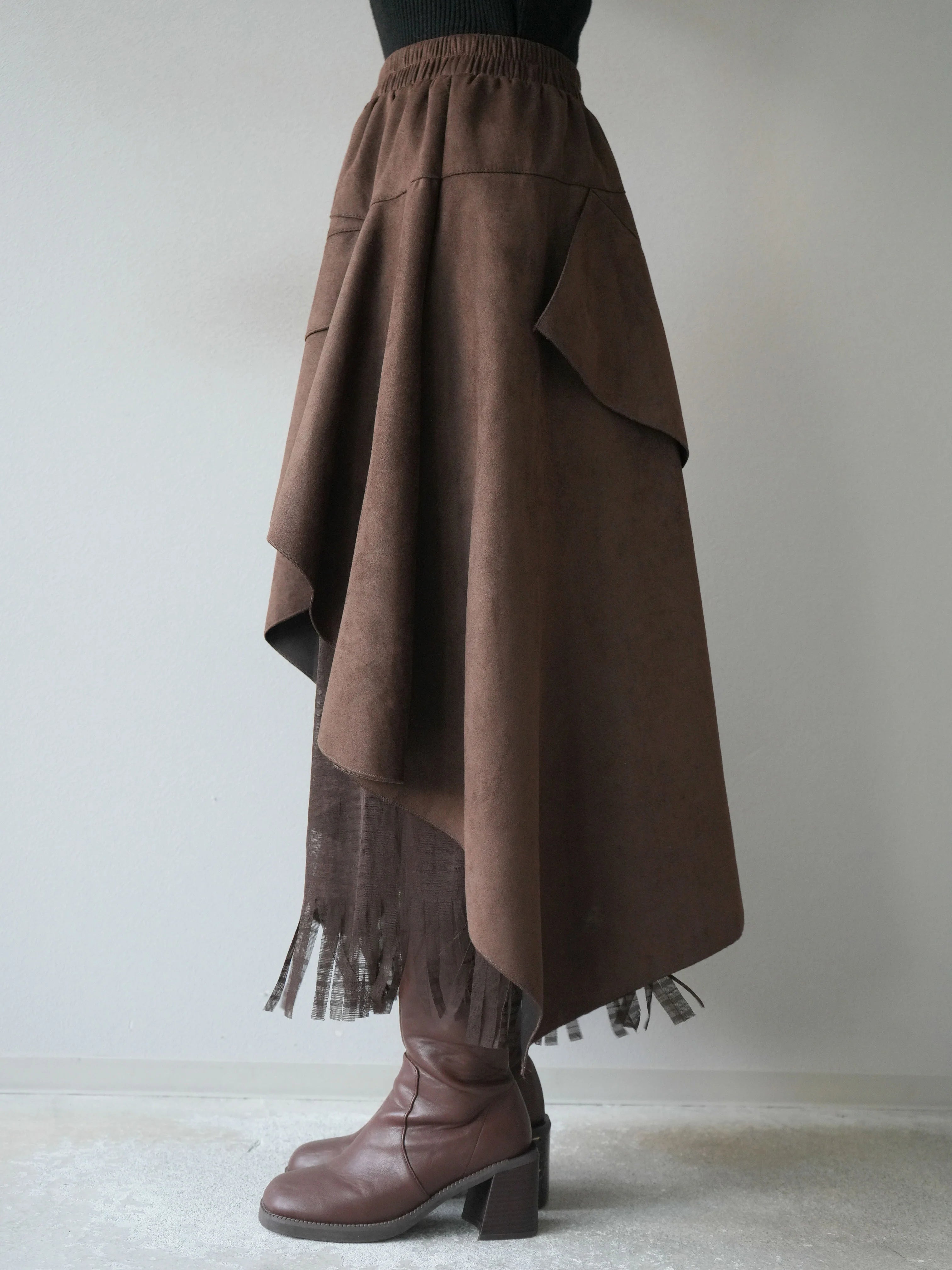 An asymmetrical skirt that mixes different materials, combining suede-like material and tulle fabric.