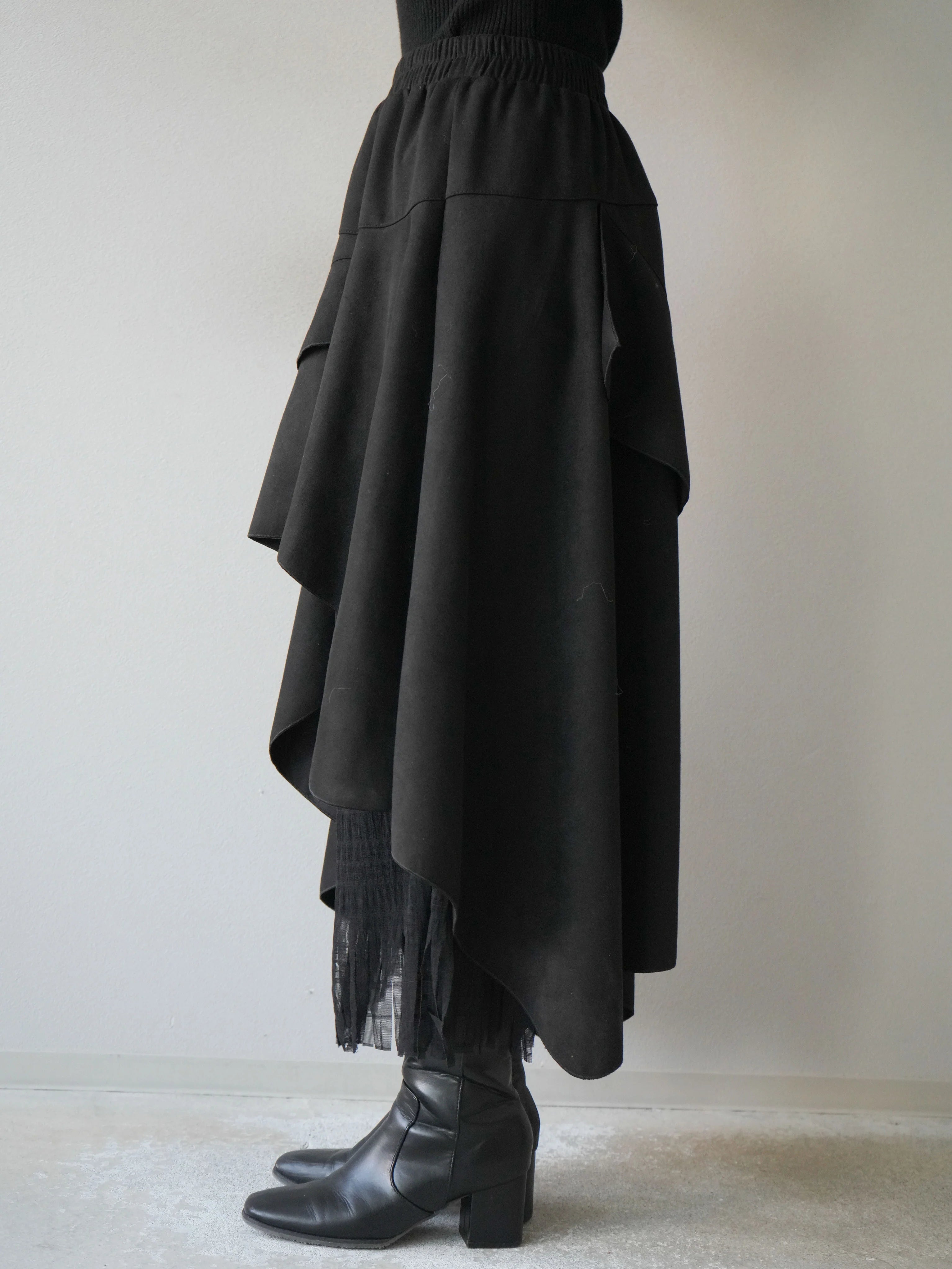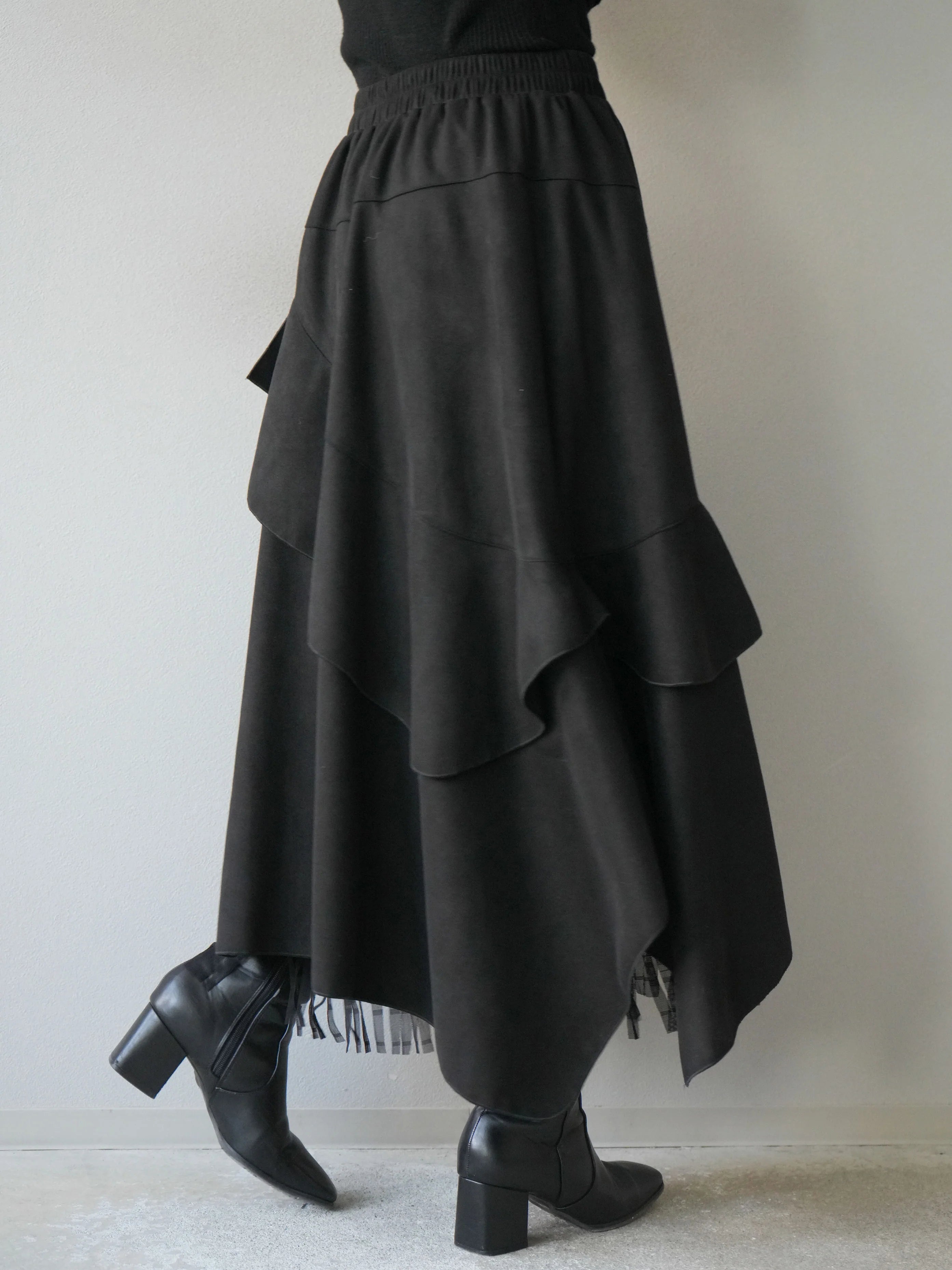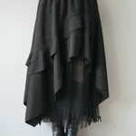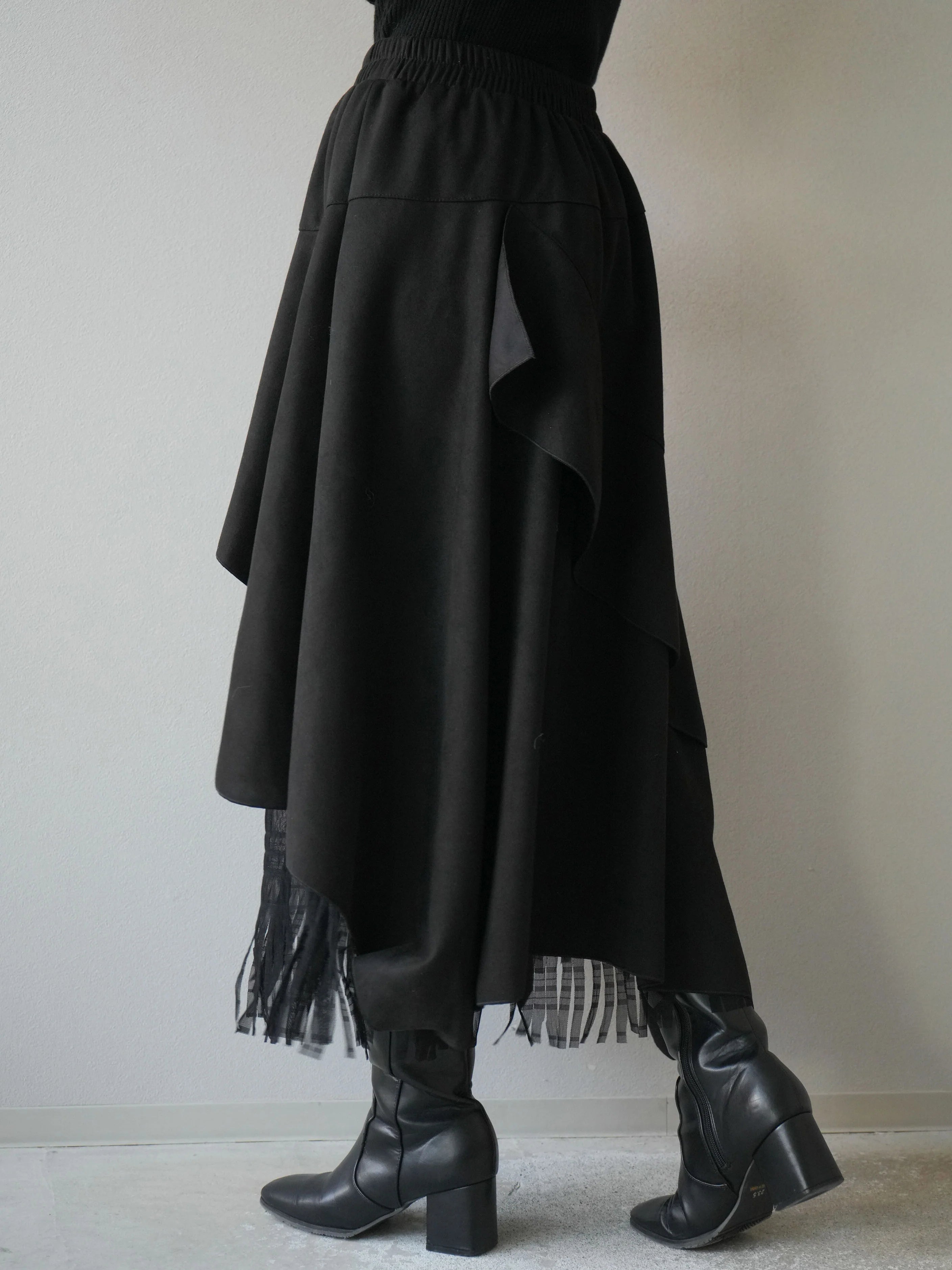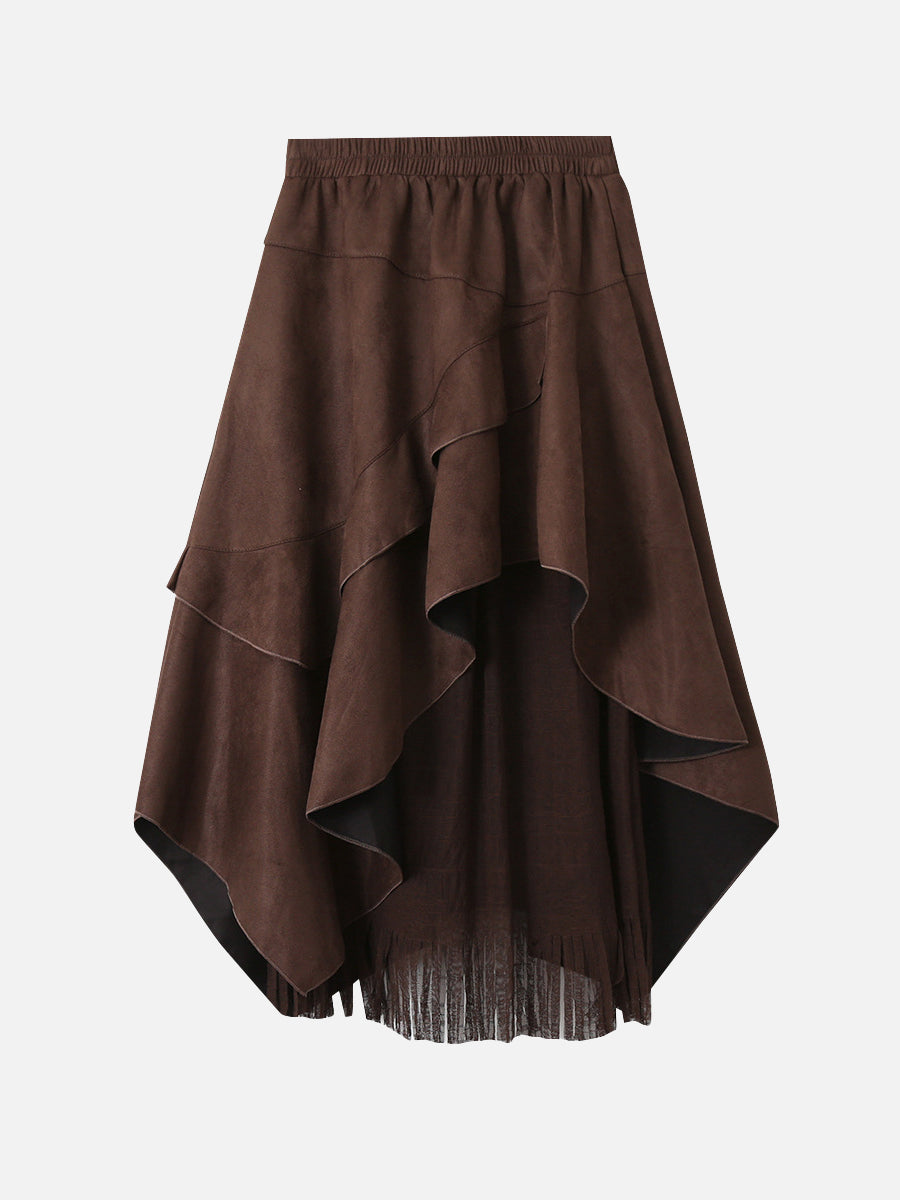 An asymmetrical skirt that mixes different materials, combining suede-like material and tulle fabric.