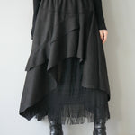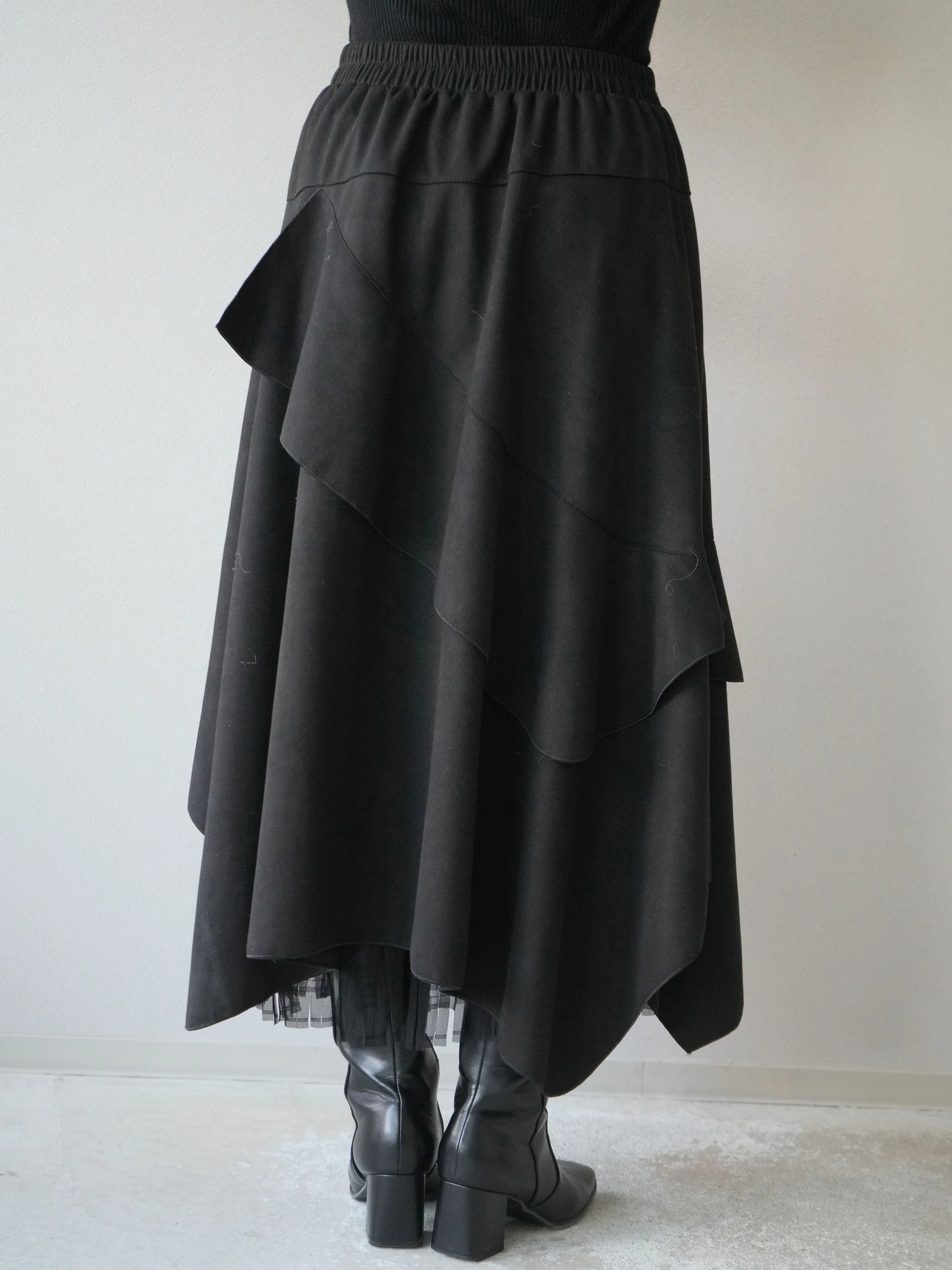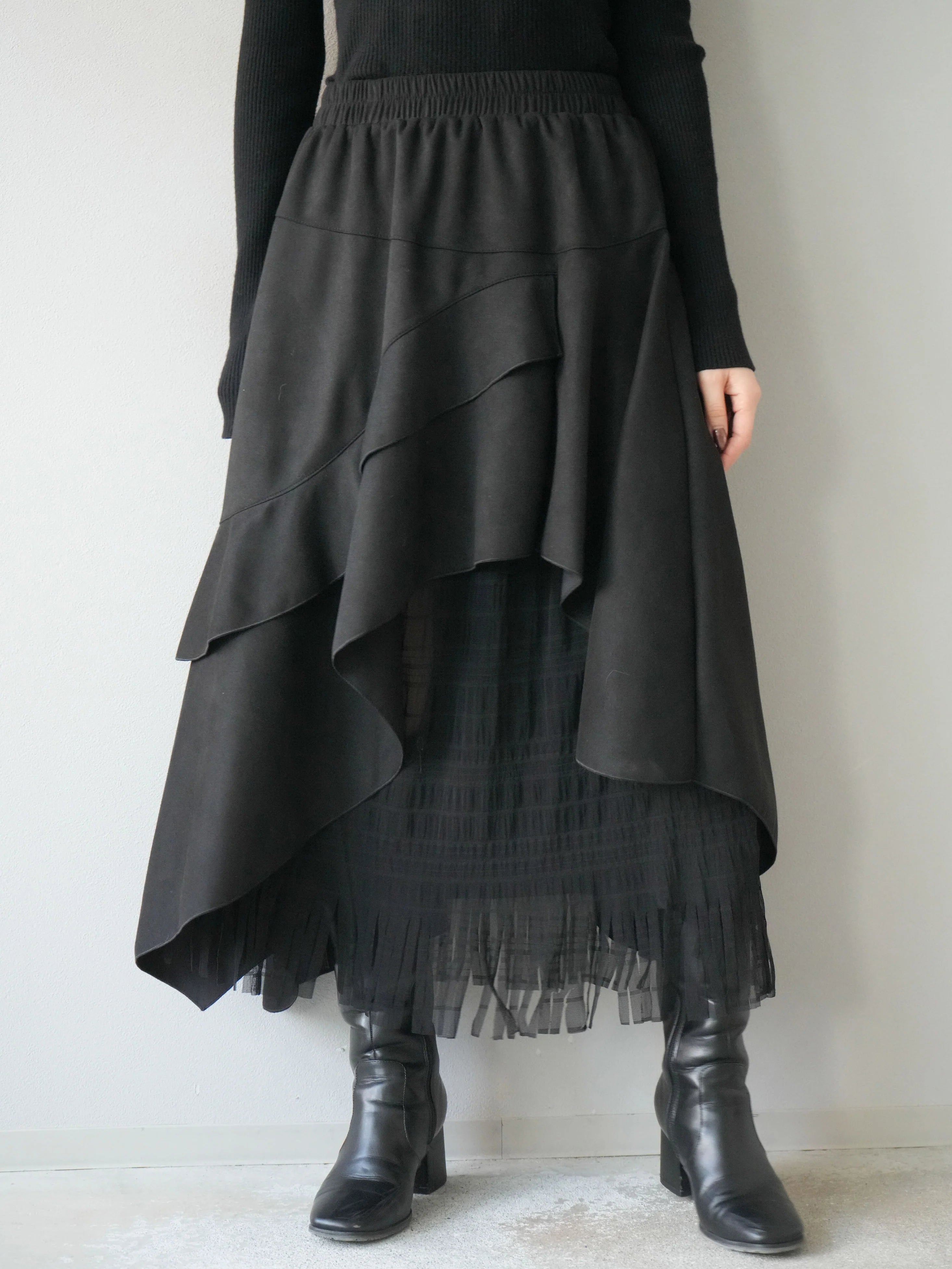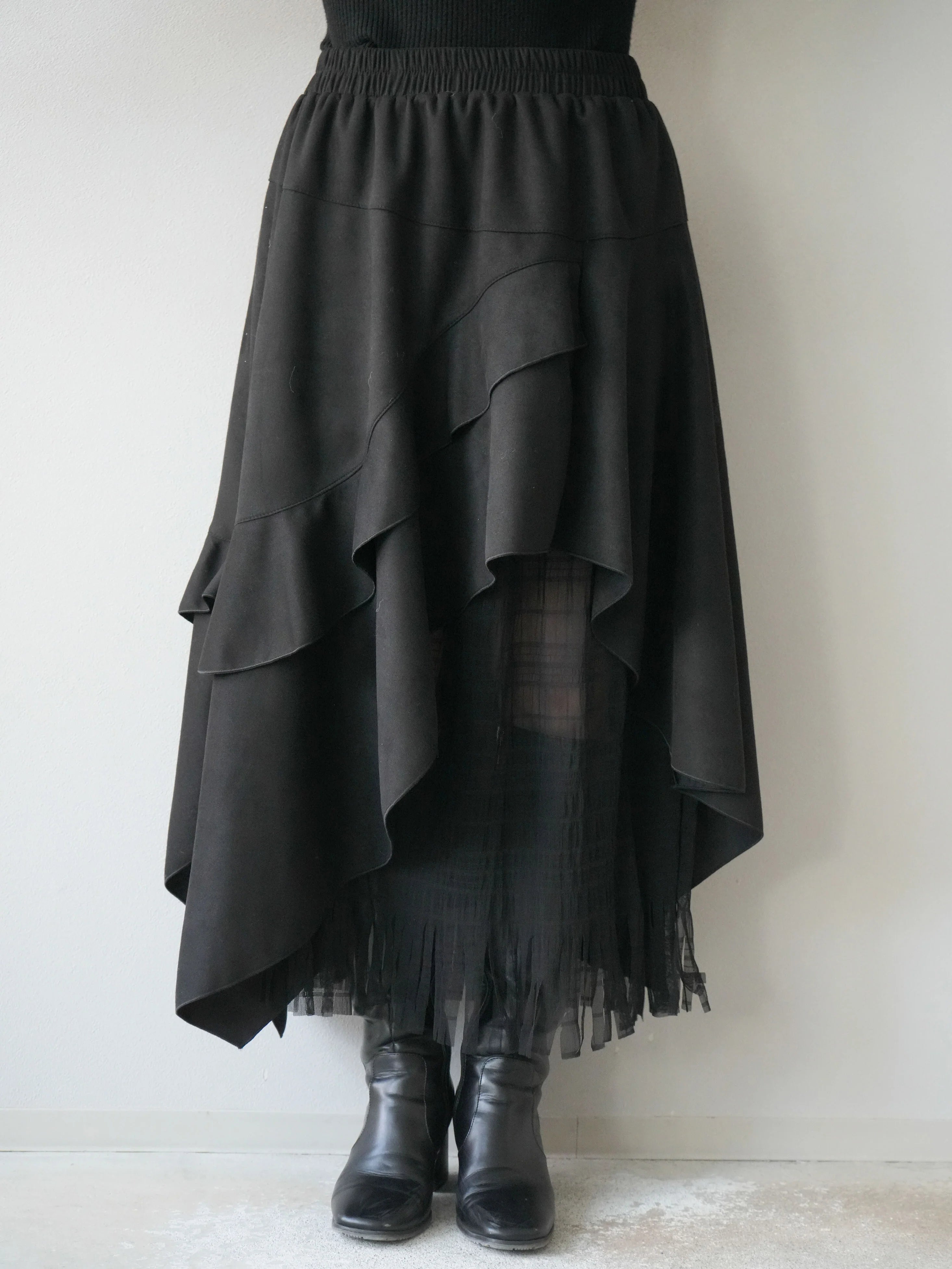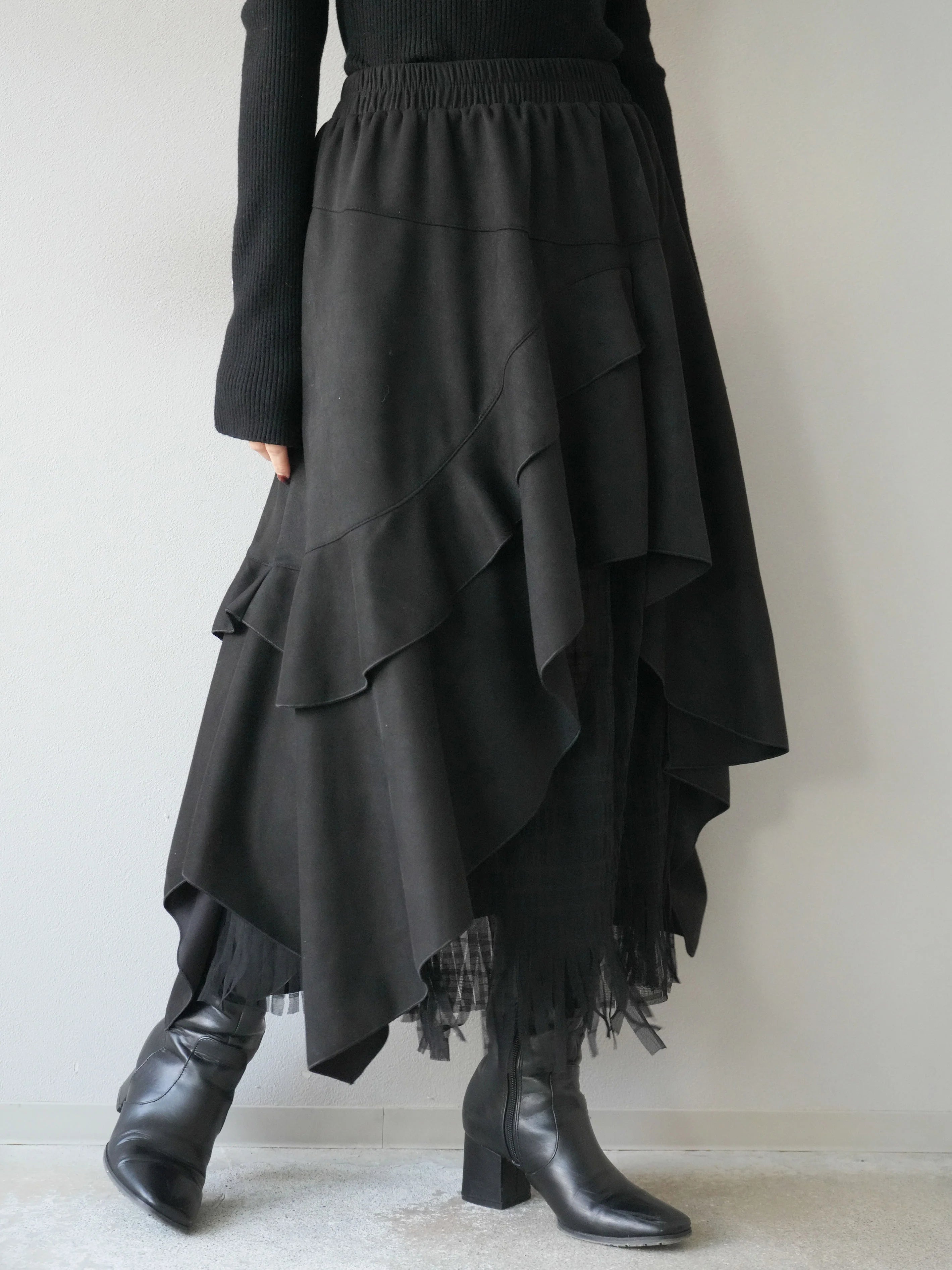 An asymmetrical skirt that mixes different materials, combining suede-like material and tulle fabric.
