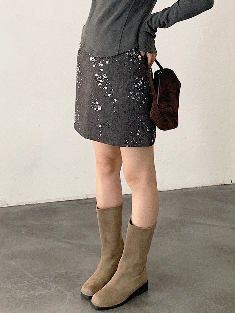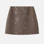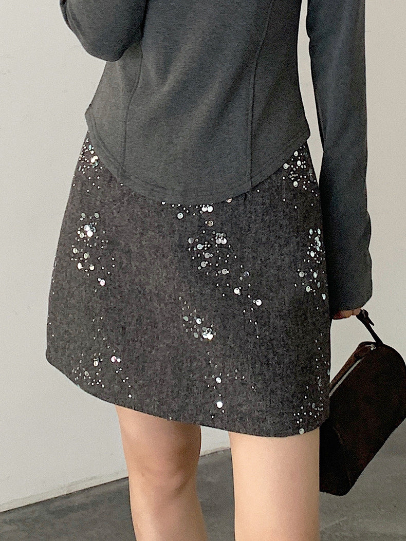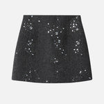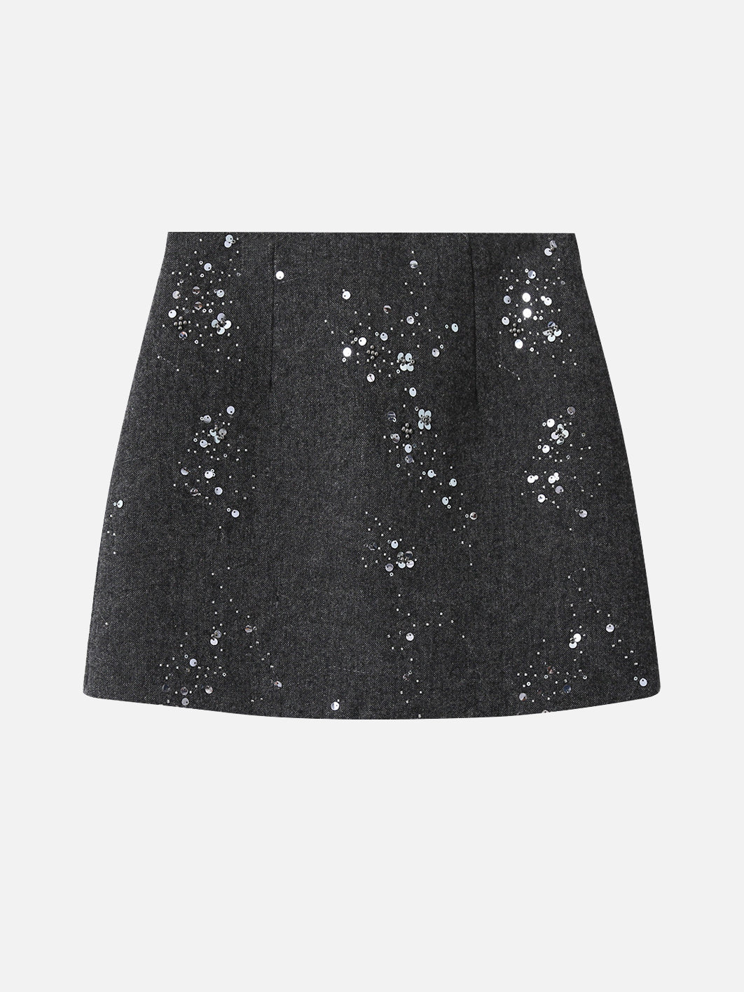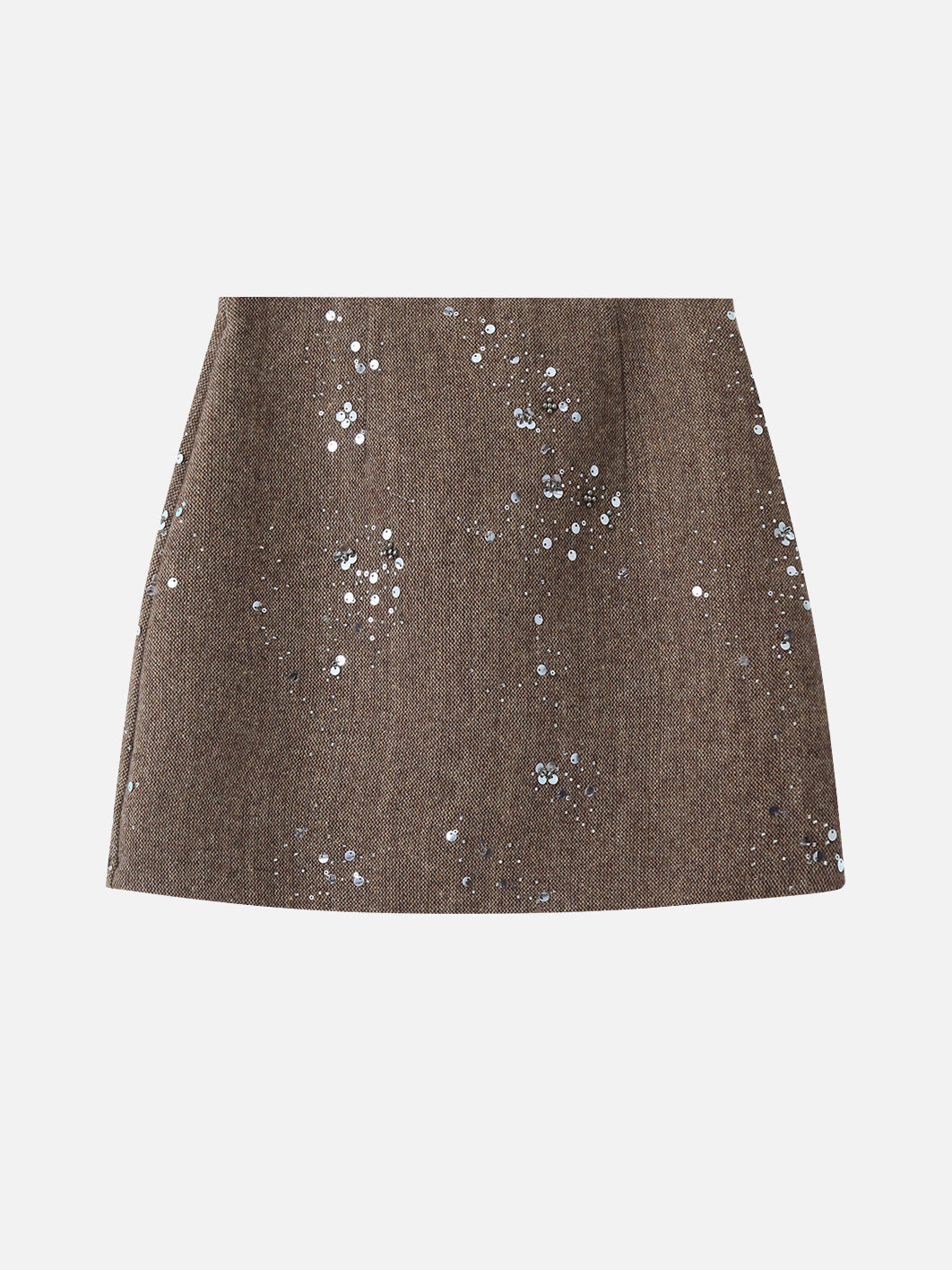 This expressive miniskirt is decorated with sequins and changes its shine depending on the angle.