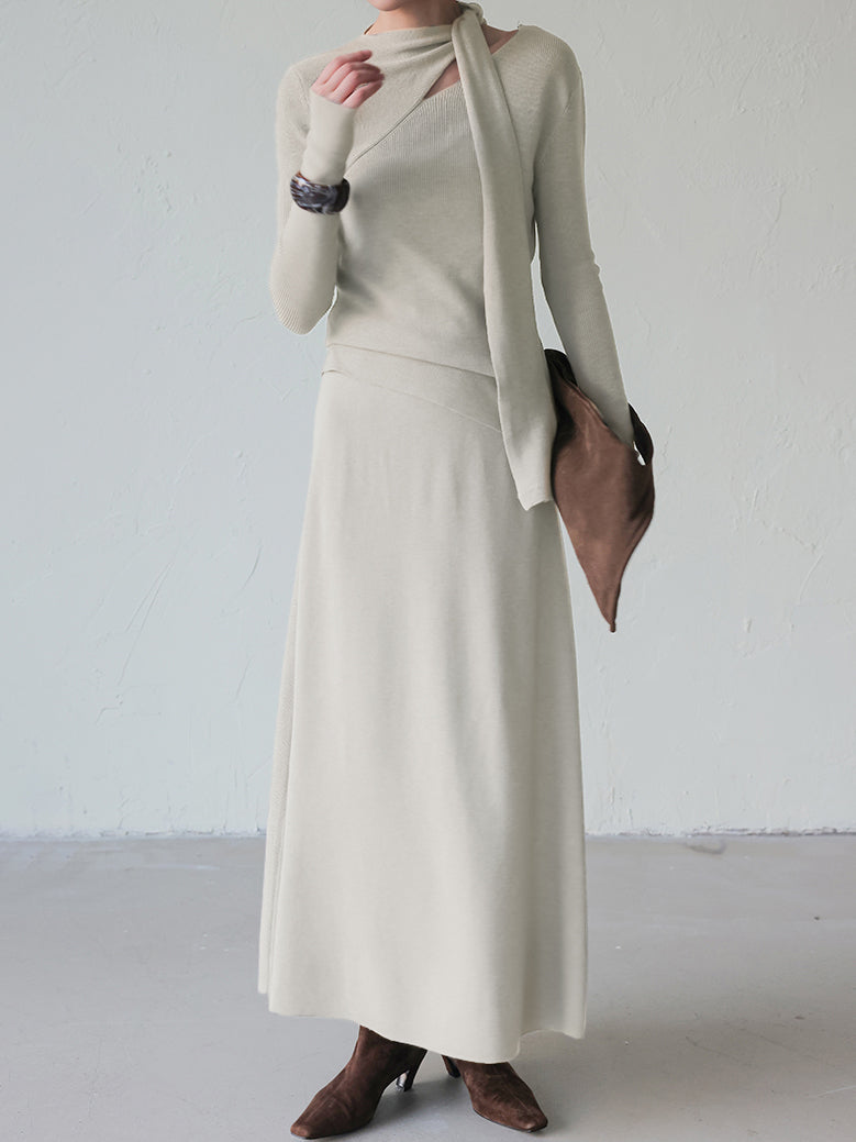 Asymmetrical Bowtie Knit + Long Flared Knit Skirt Set (5 Colors)