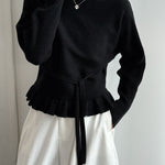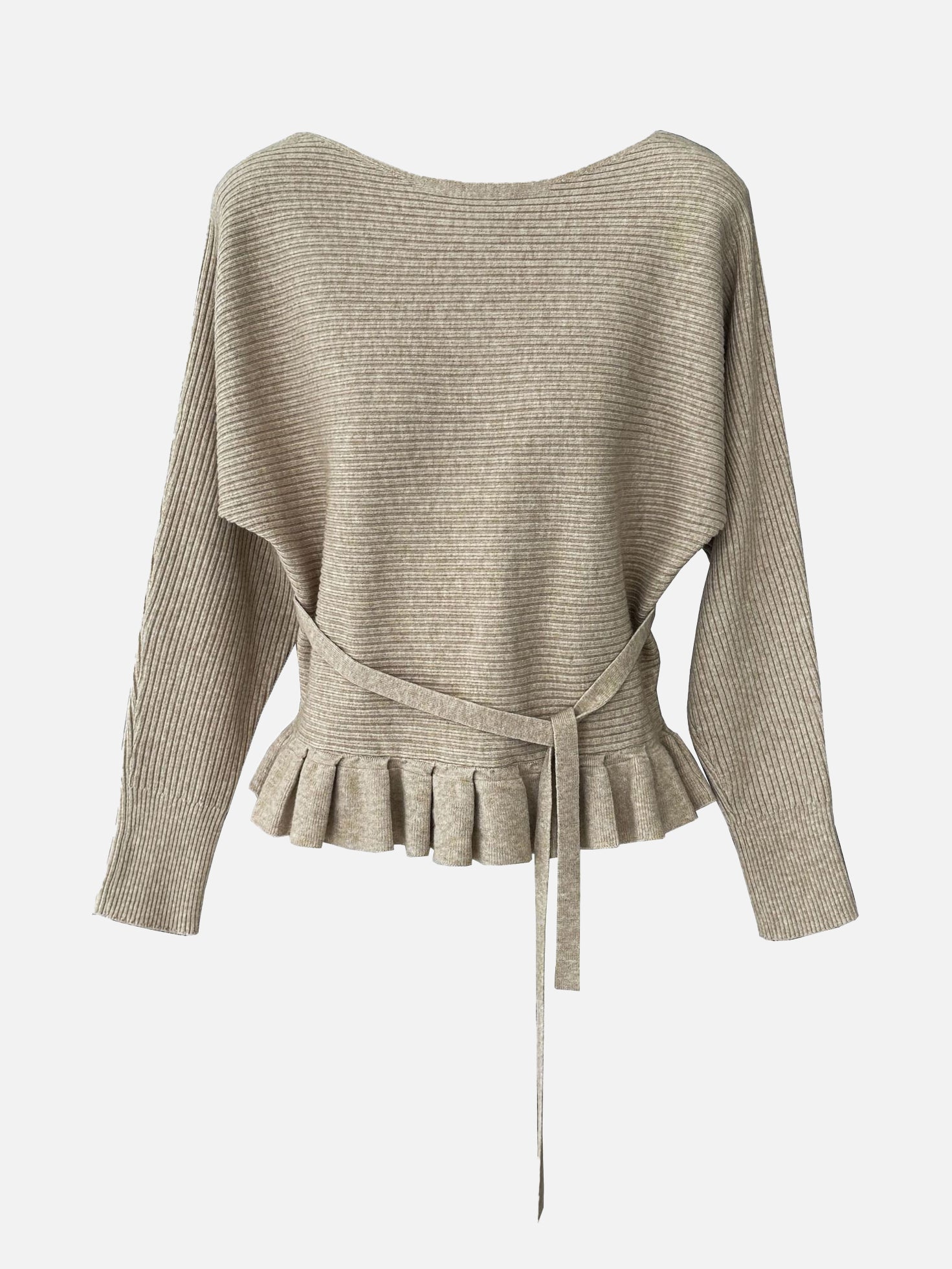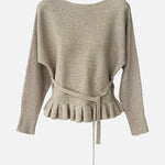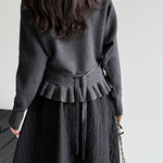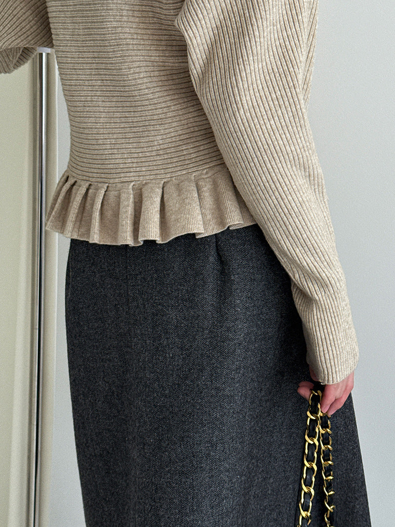 This piece combines a peplum design with ruffles to create a truly feminine silhouette.