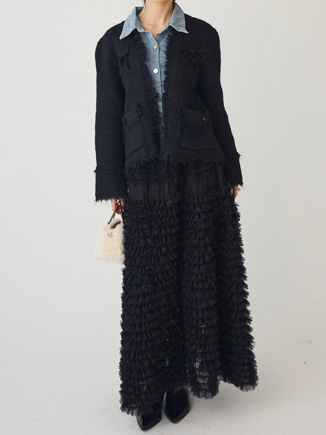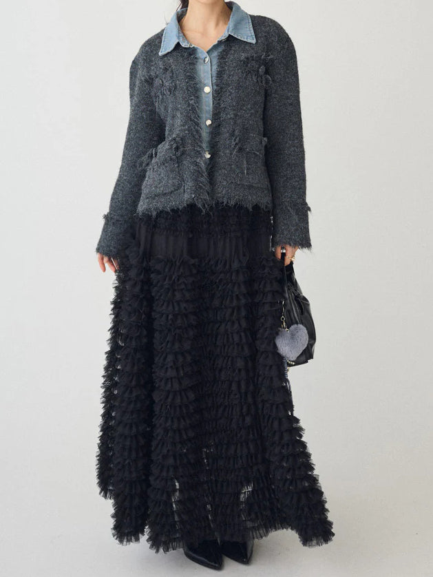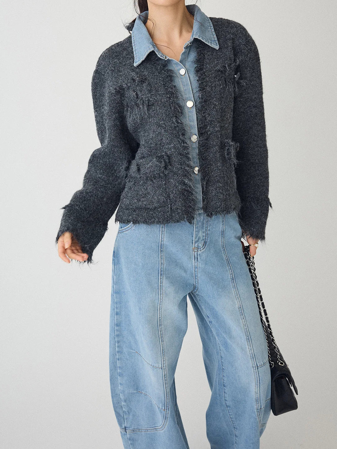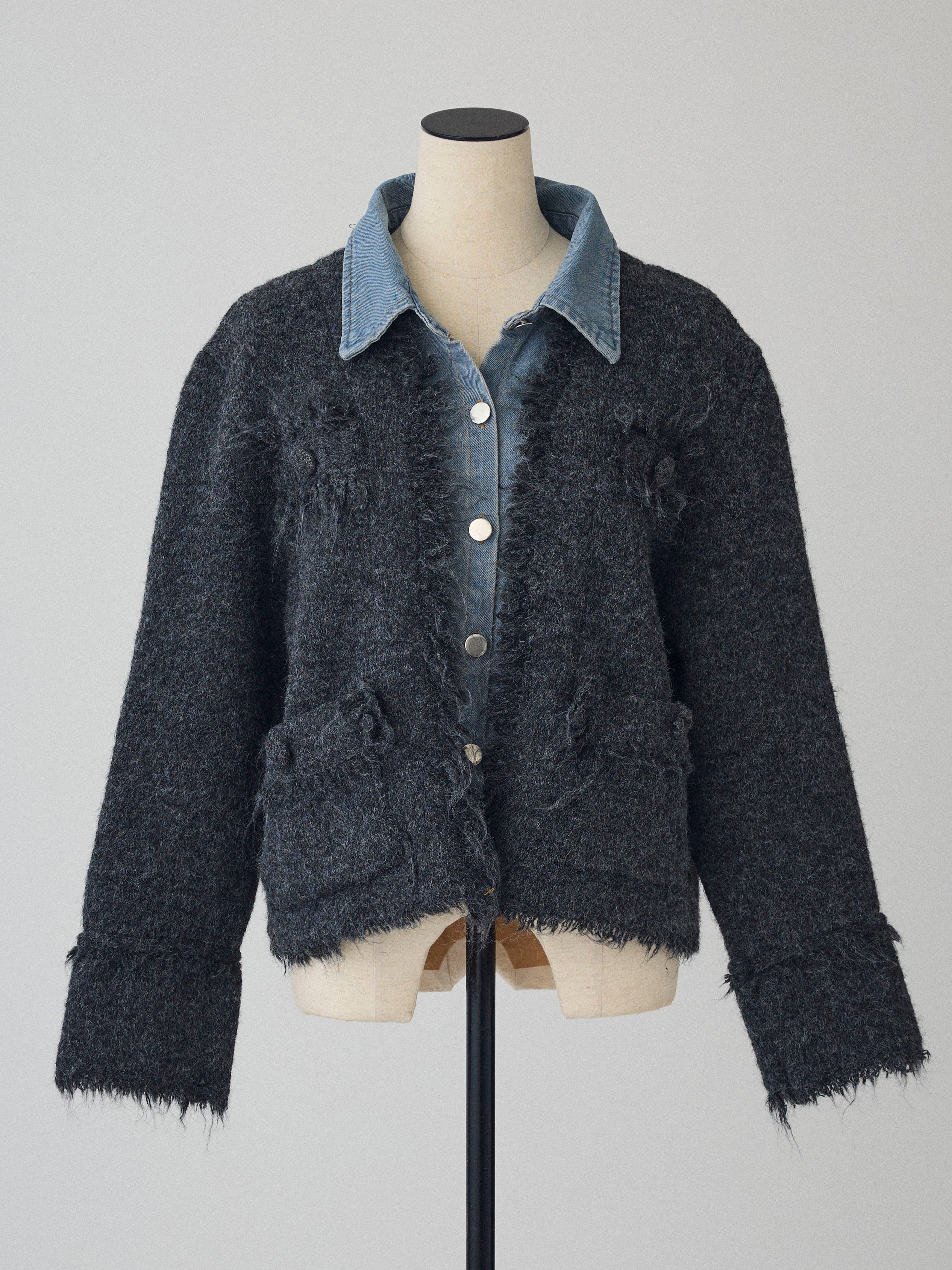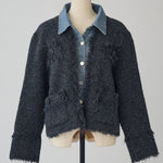 A layered cardigan that combines a tweed jacket with a denim shirt.