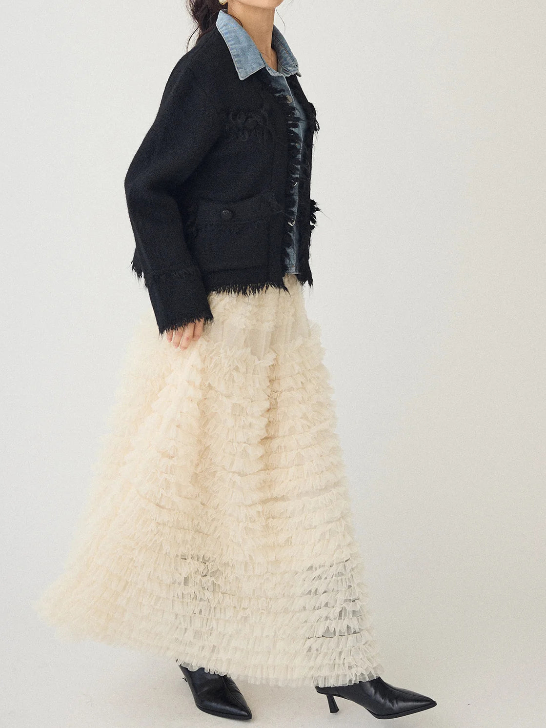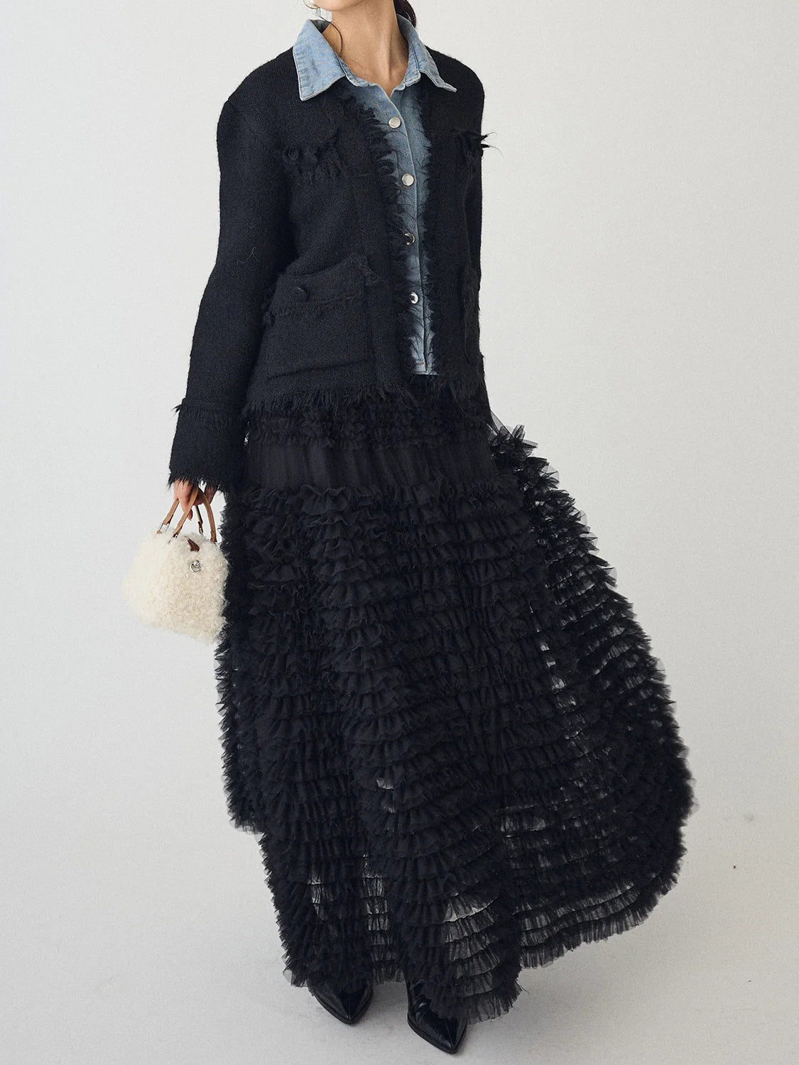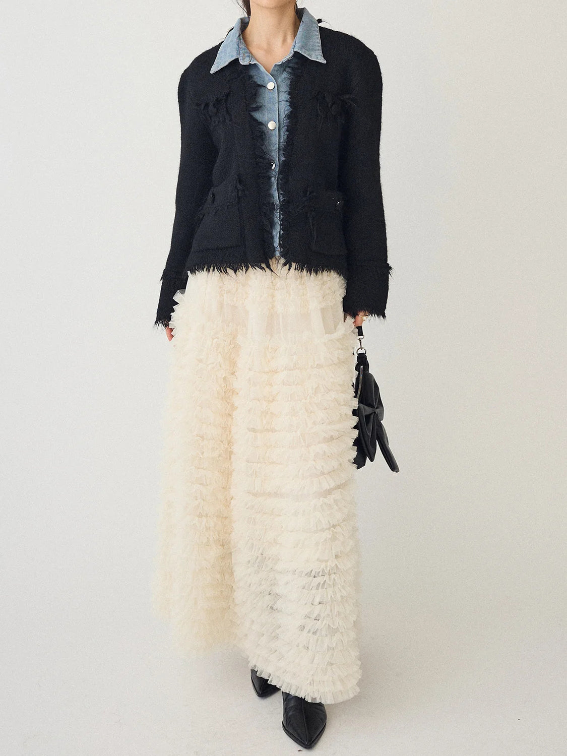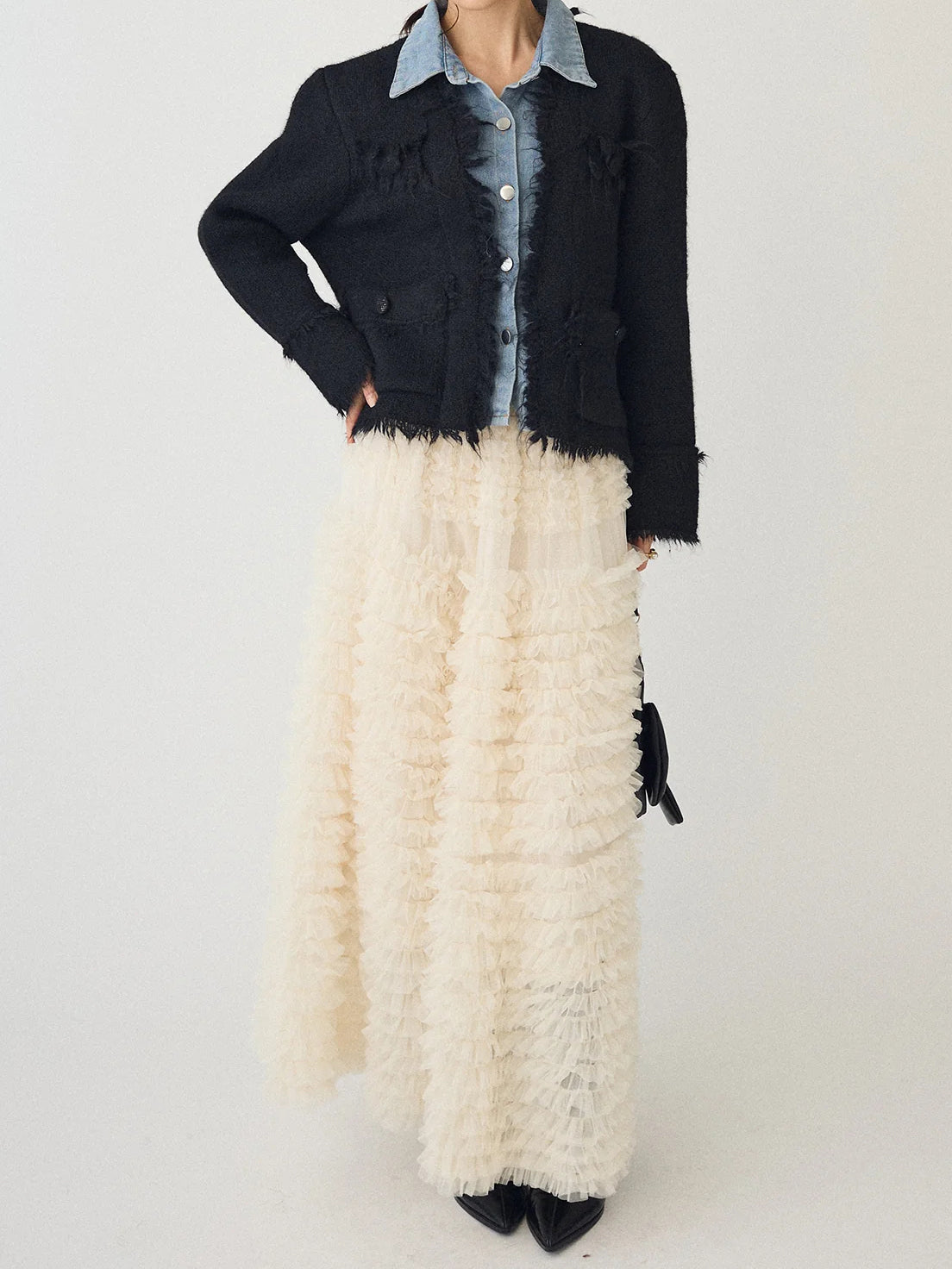 A layered cardigan that combines a tweed jacket with a denim shirt.