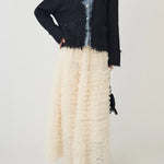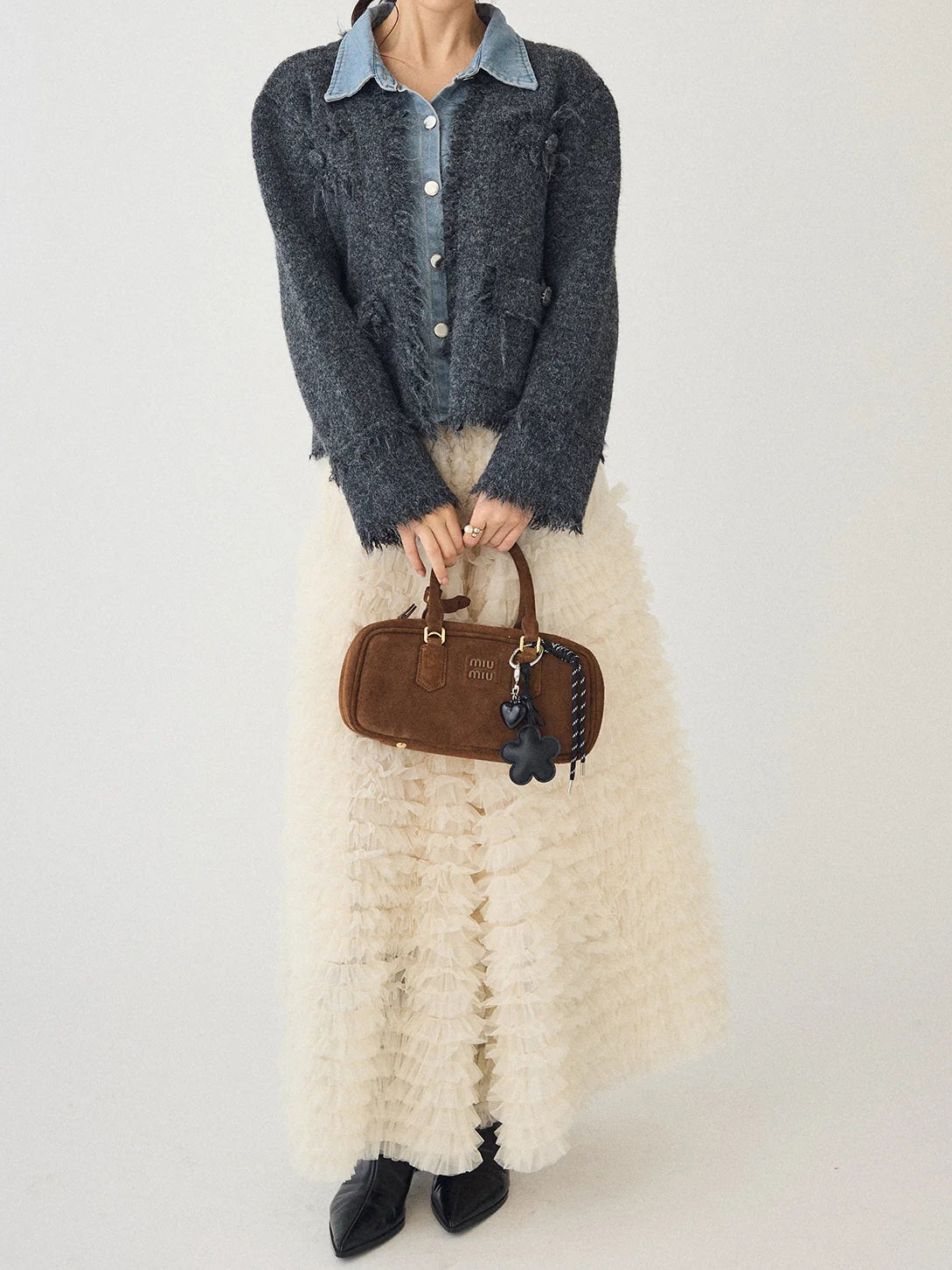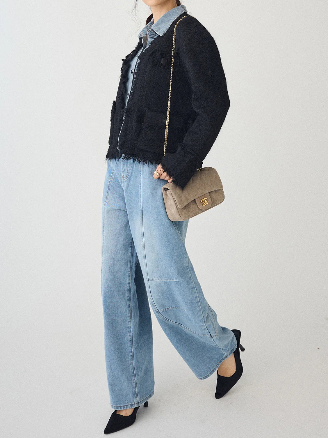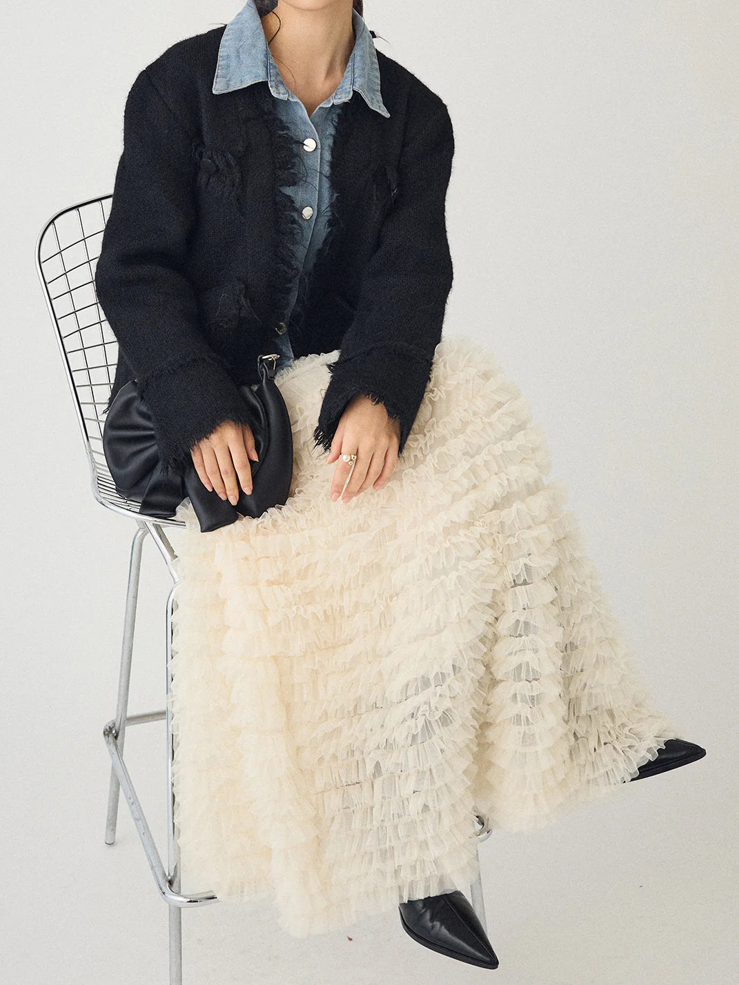 A layered cardigan that combines a tweed jacket with a denim shirt.