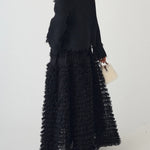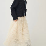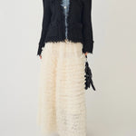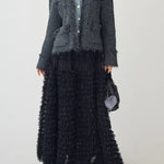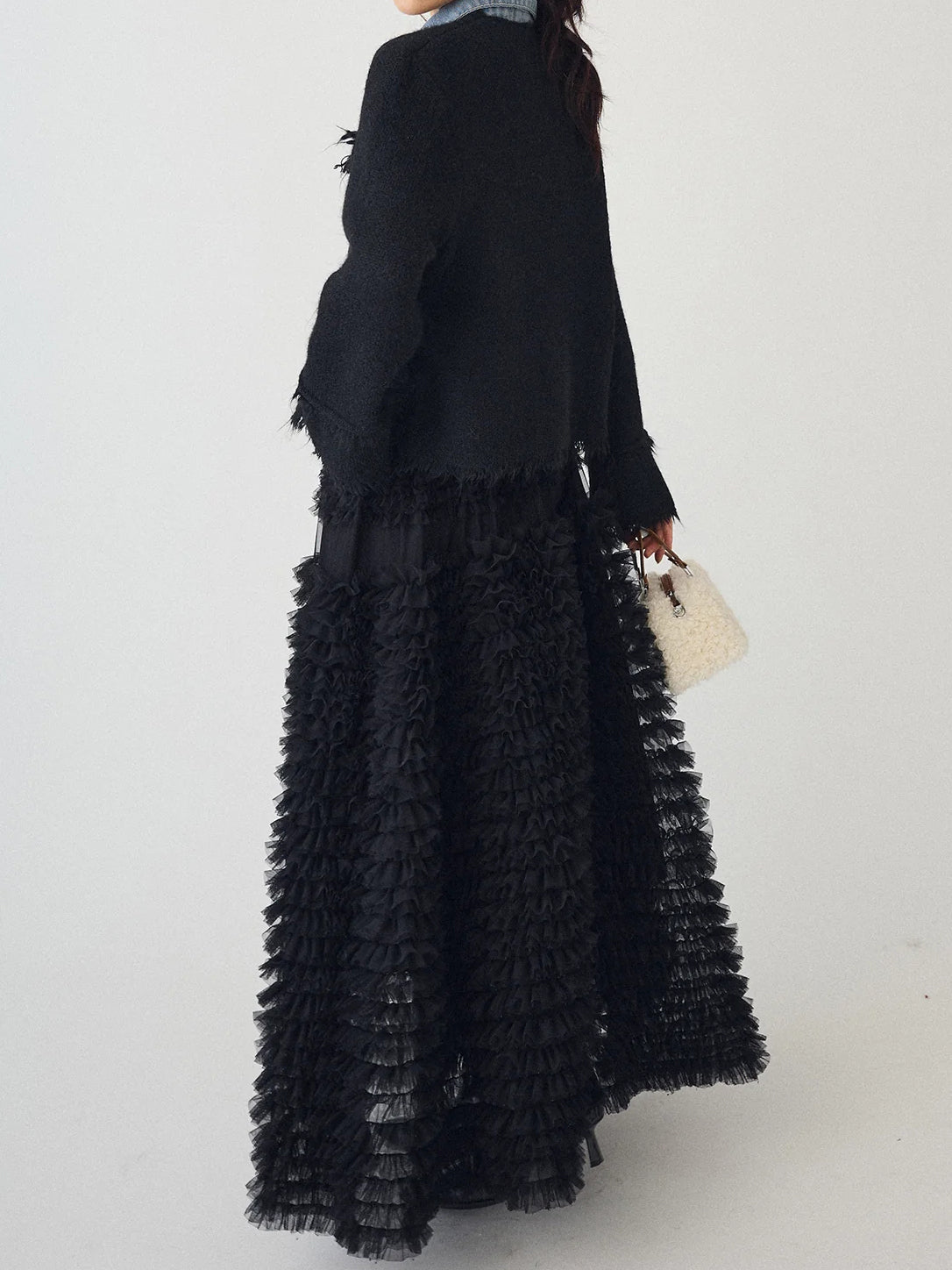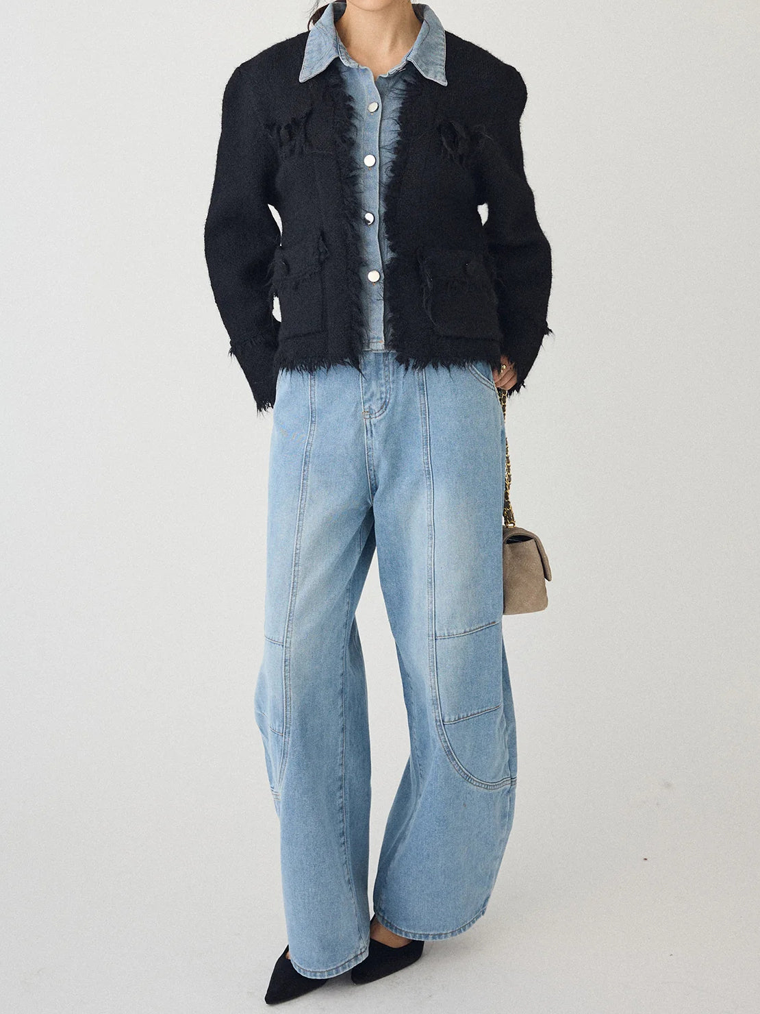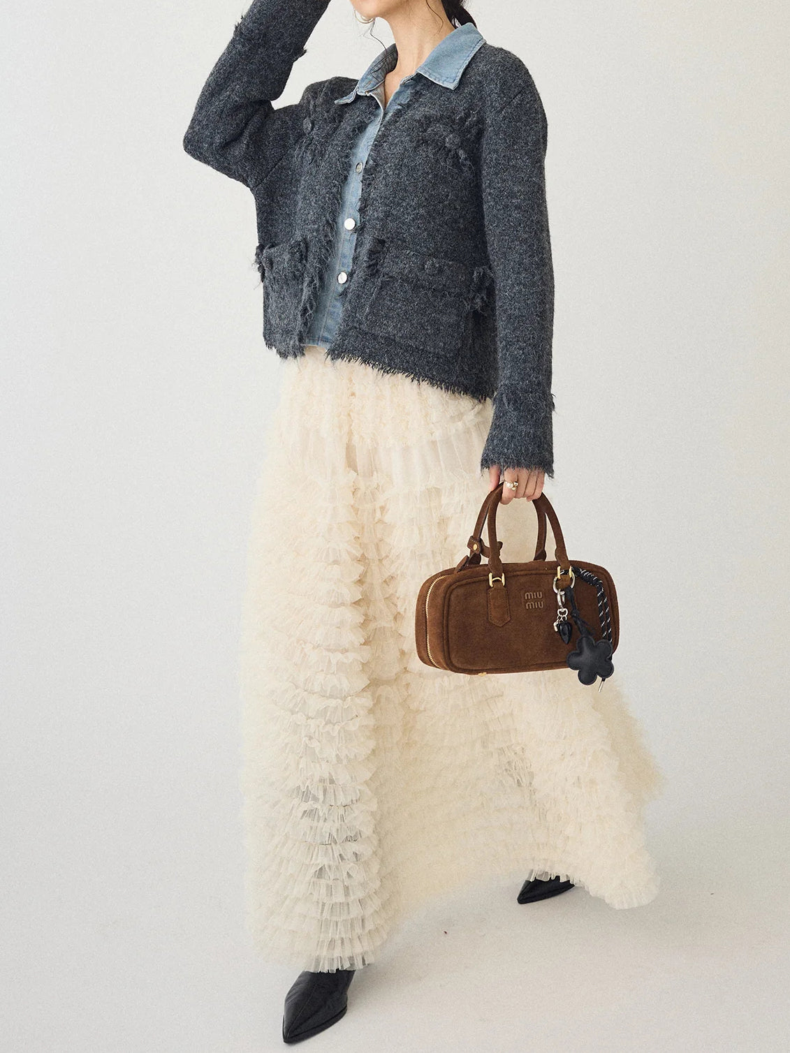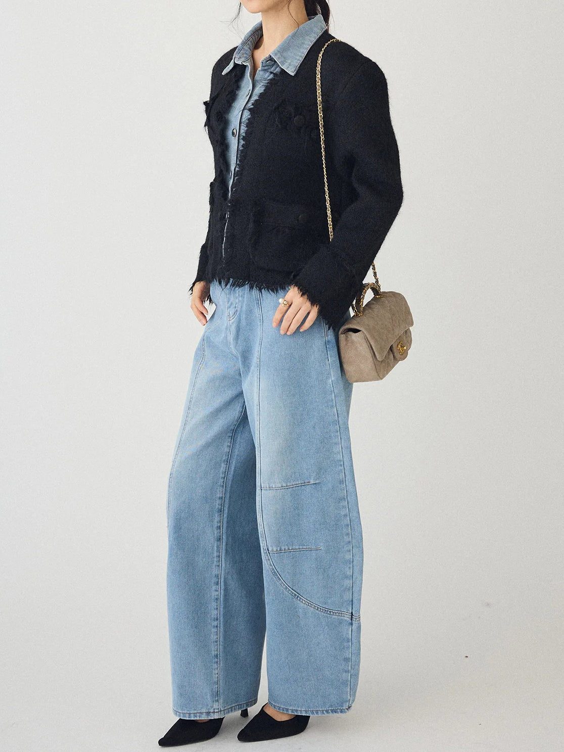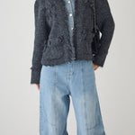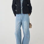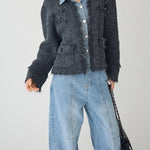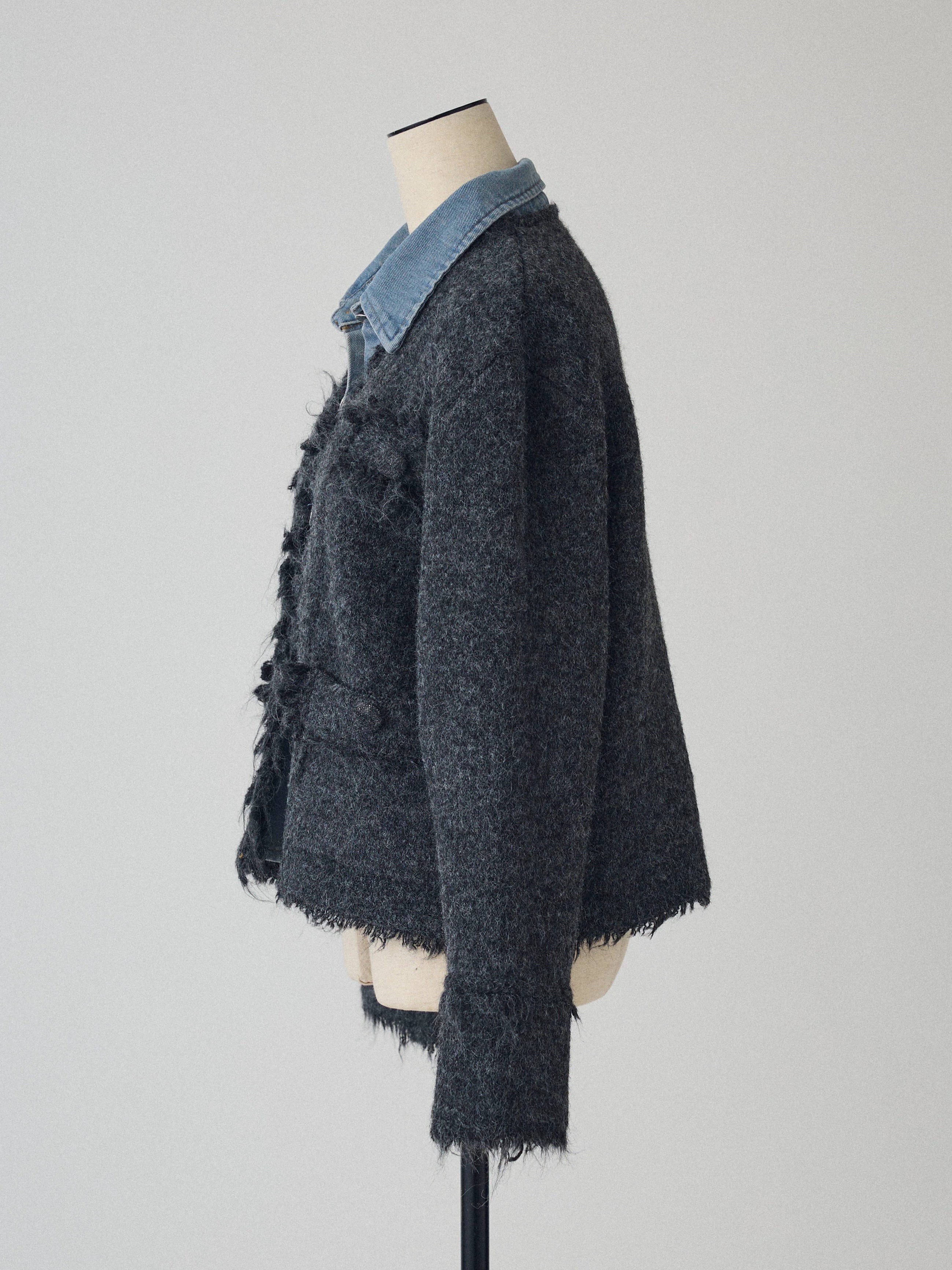 [A piece with a three-dimensional denim and tweed knit that creates a distinctive impression ]