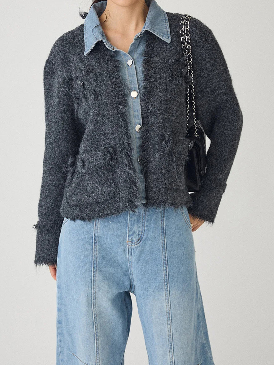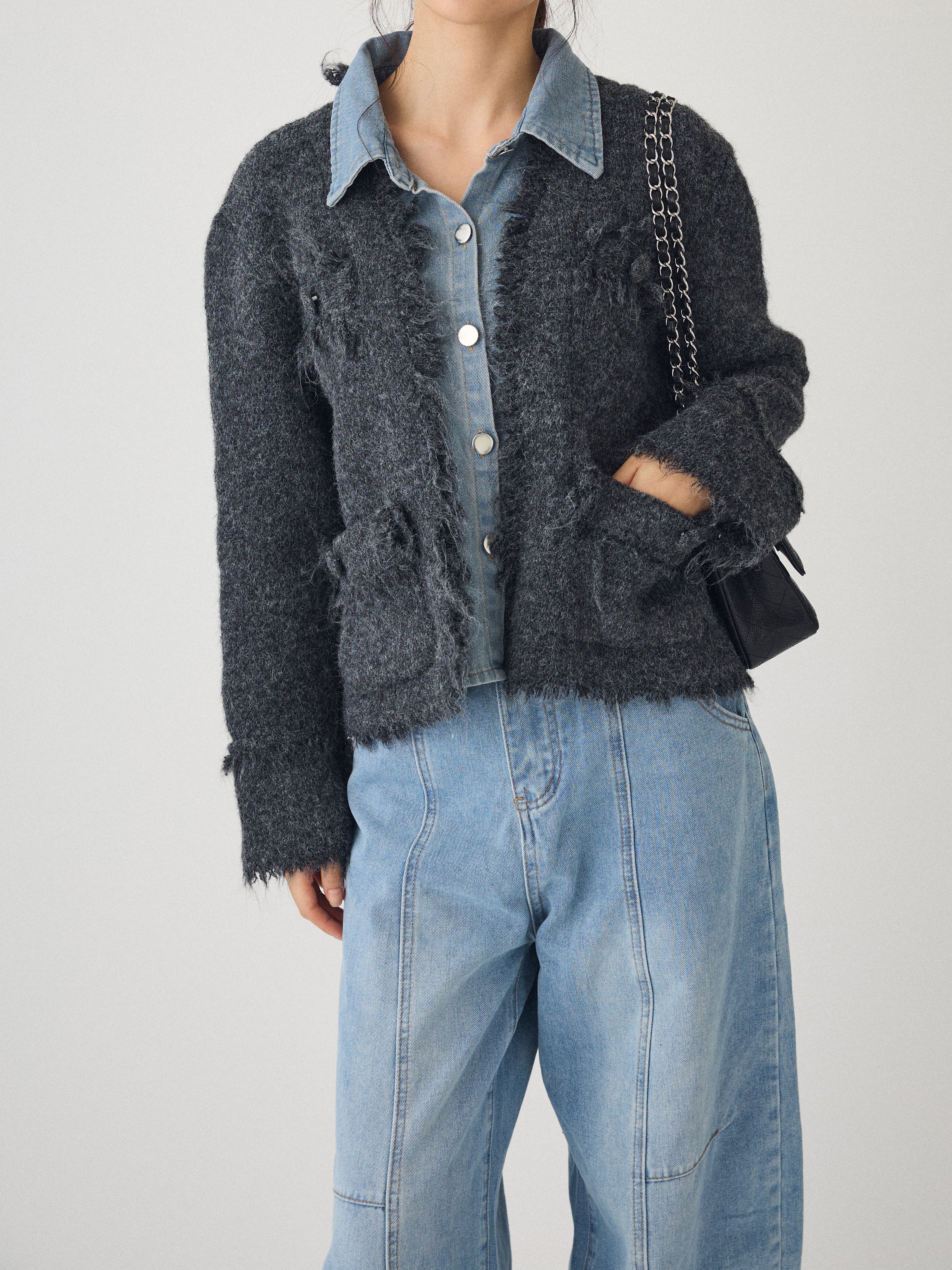 Denim shirt docking tweed cardigan (2 colors)