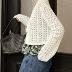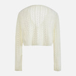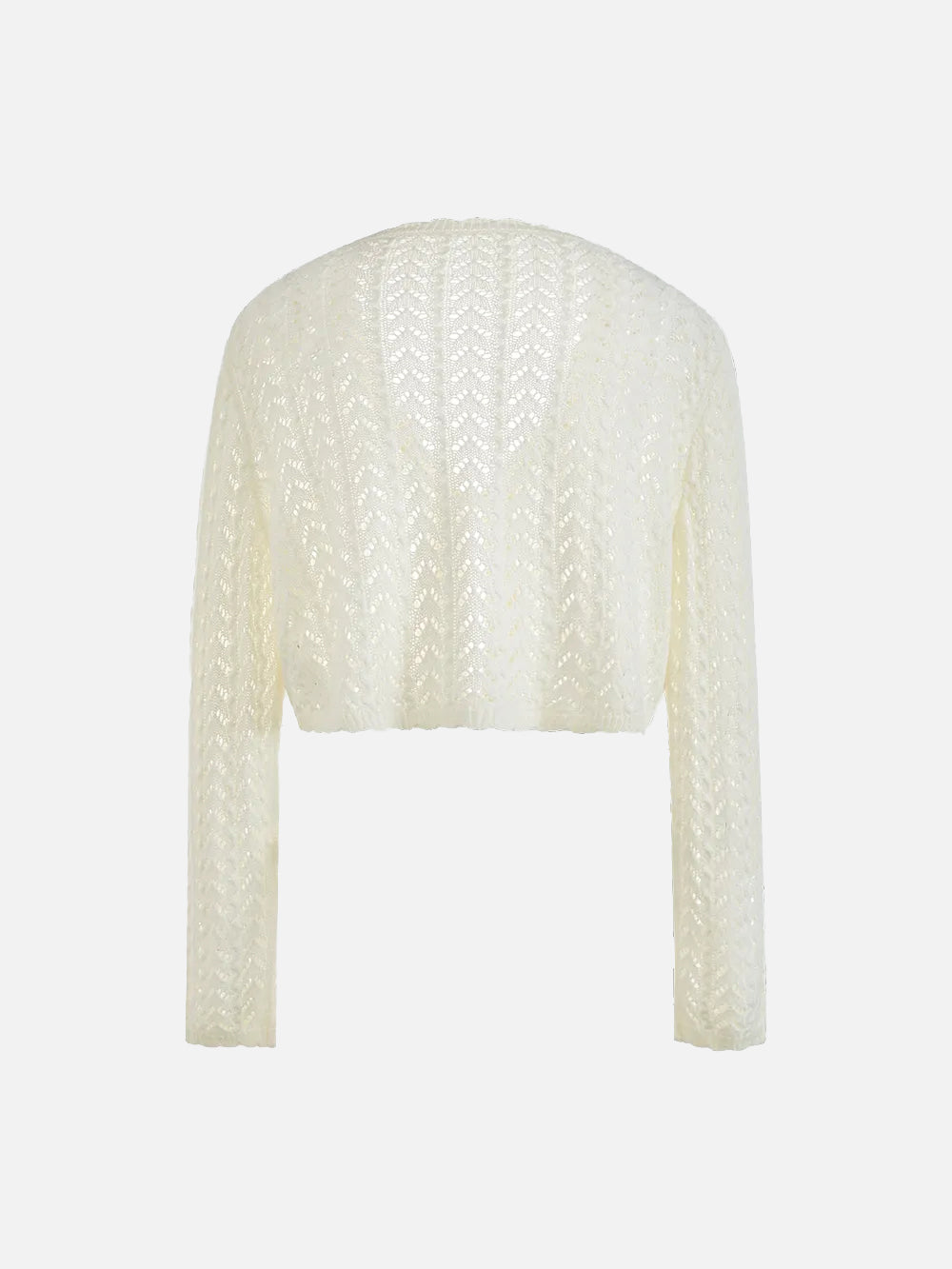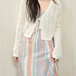 A slightly shorter knit cardigan made with trendy crochet knitting .