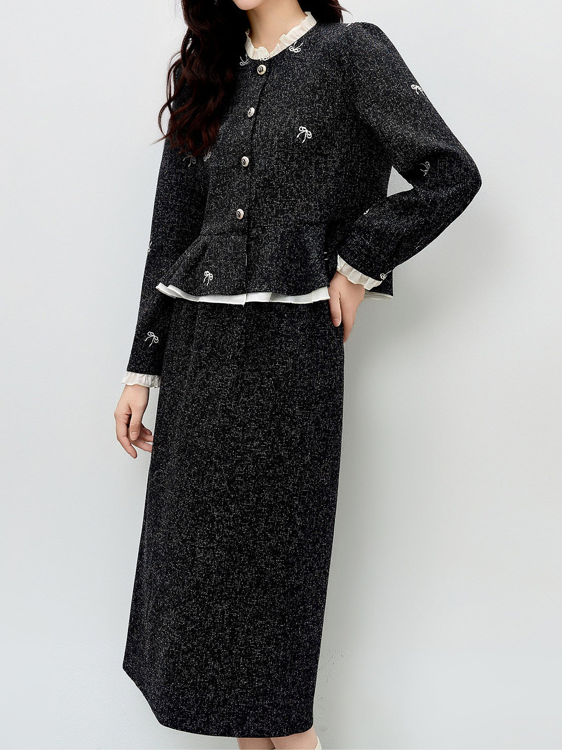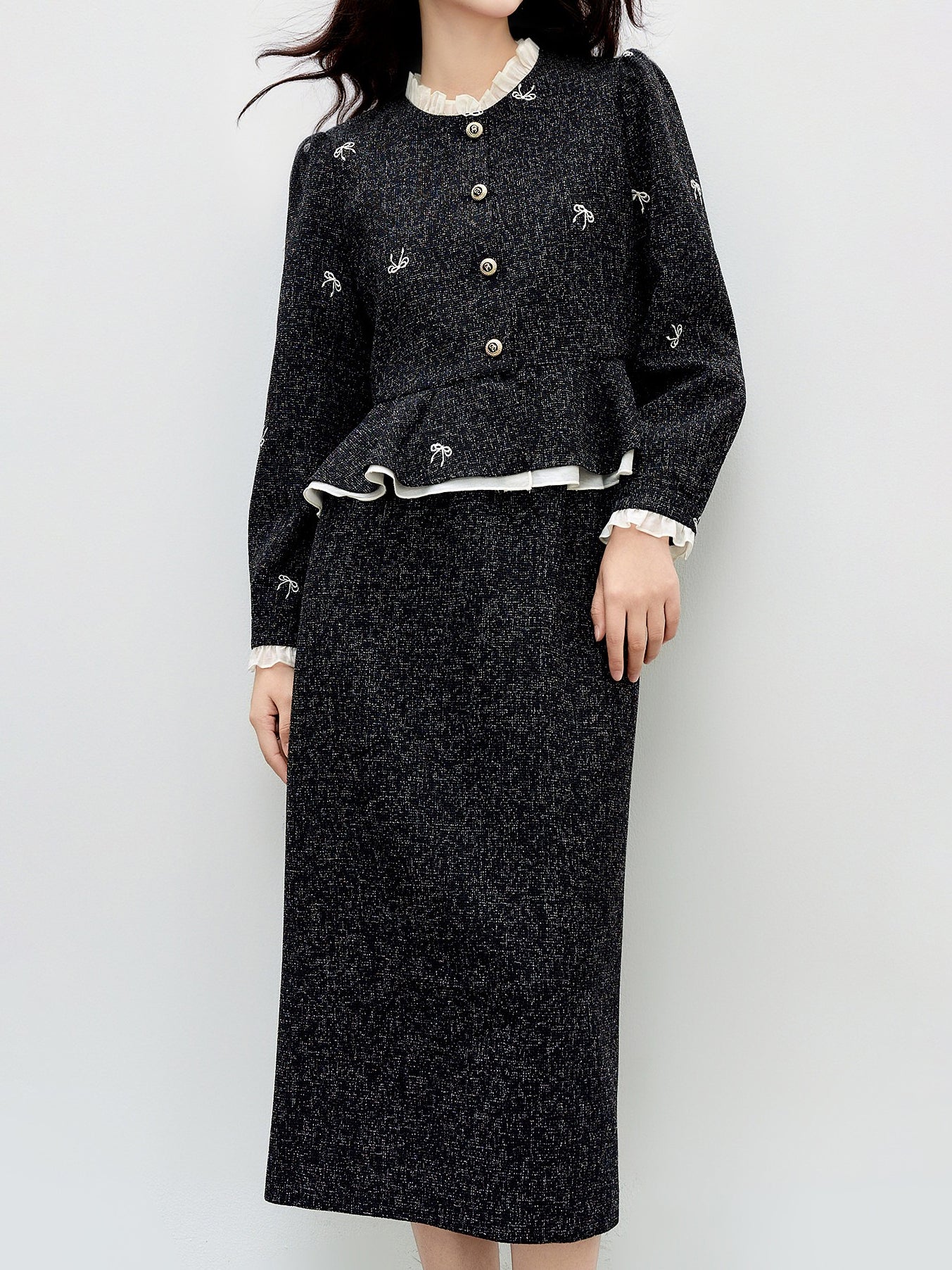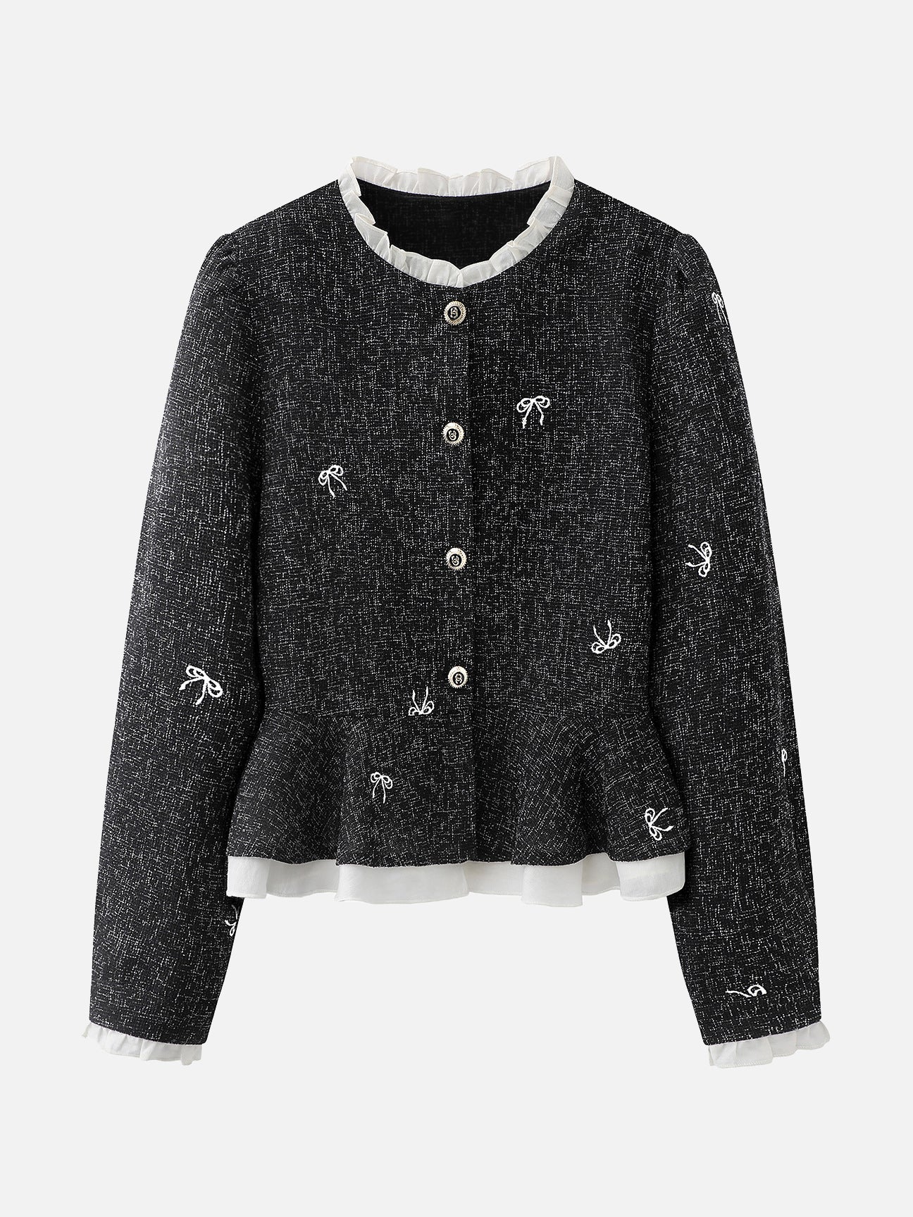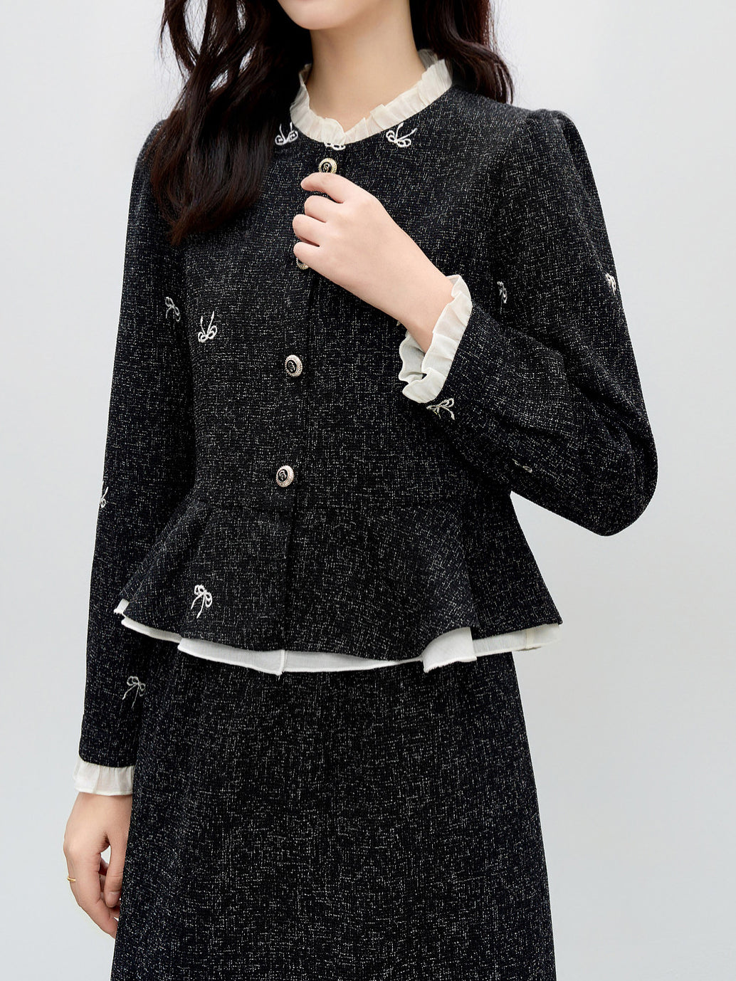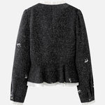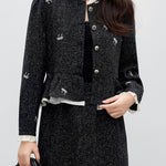 Frill Docking Ribbon Embroidered Tweed Jacket (Can be coordinated)