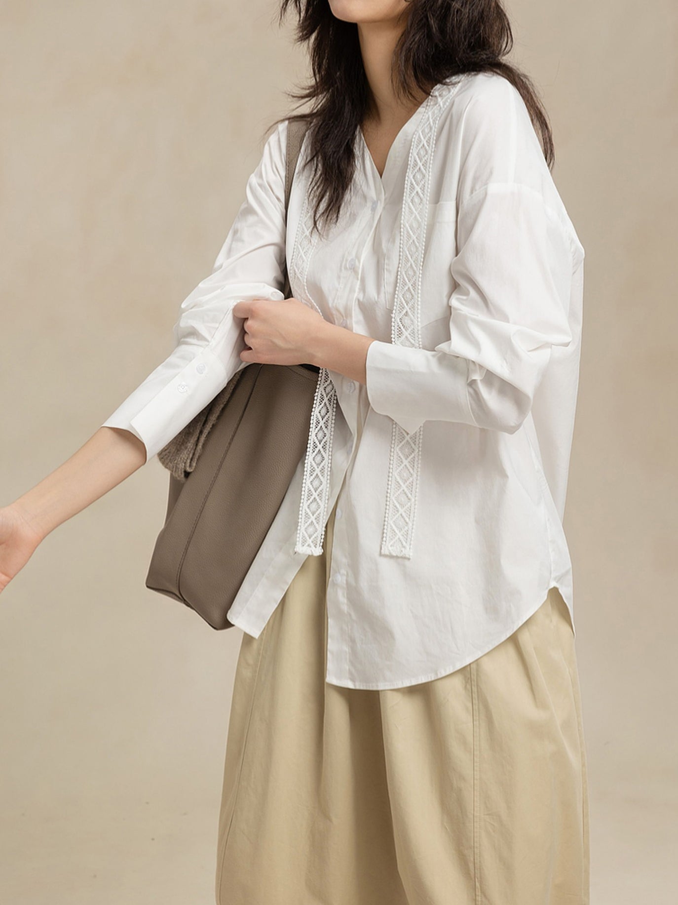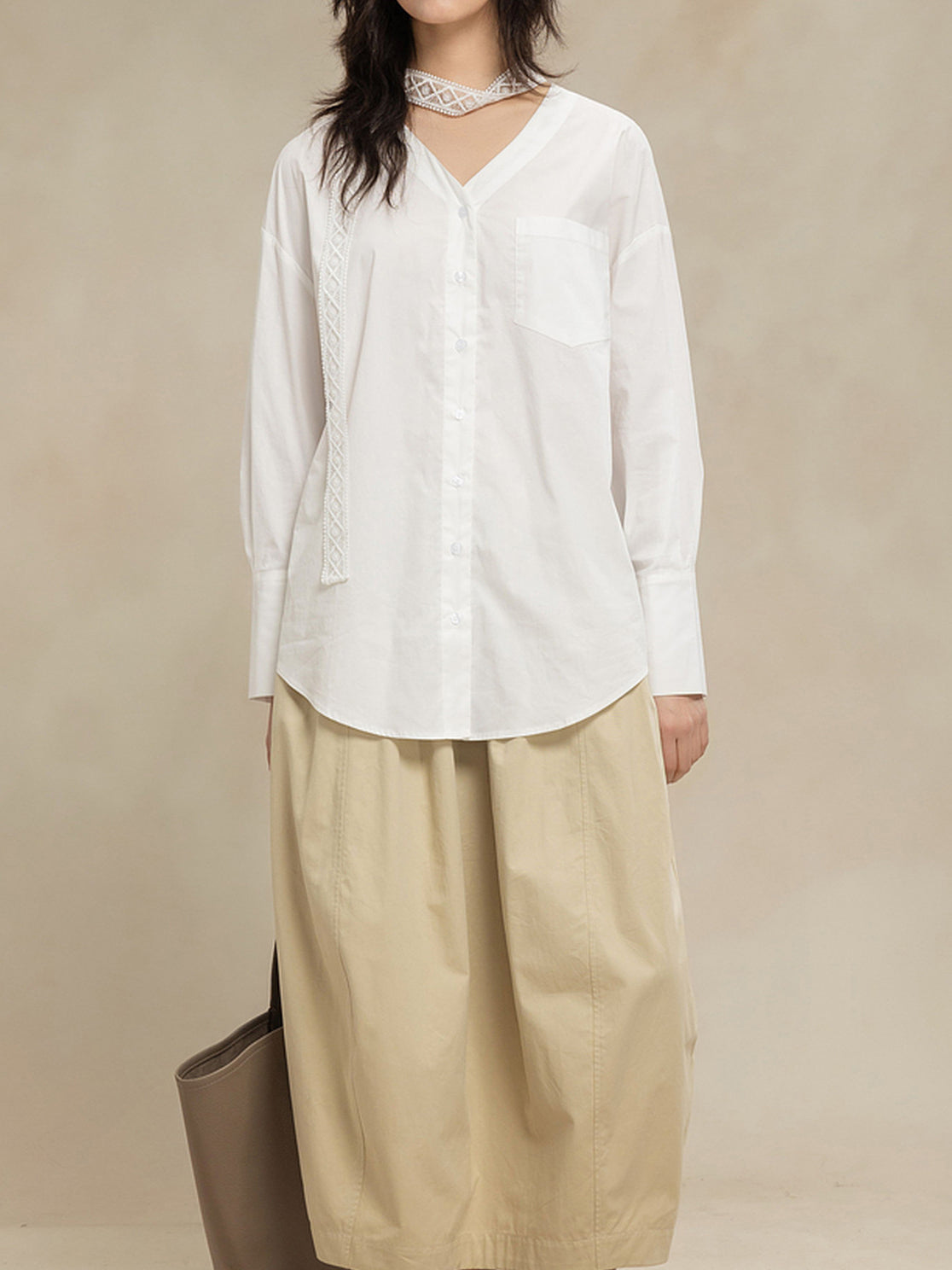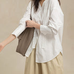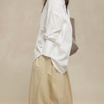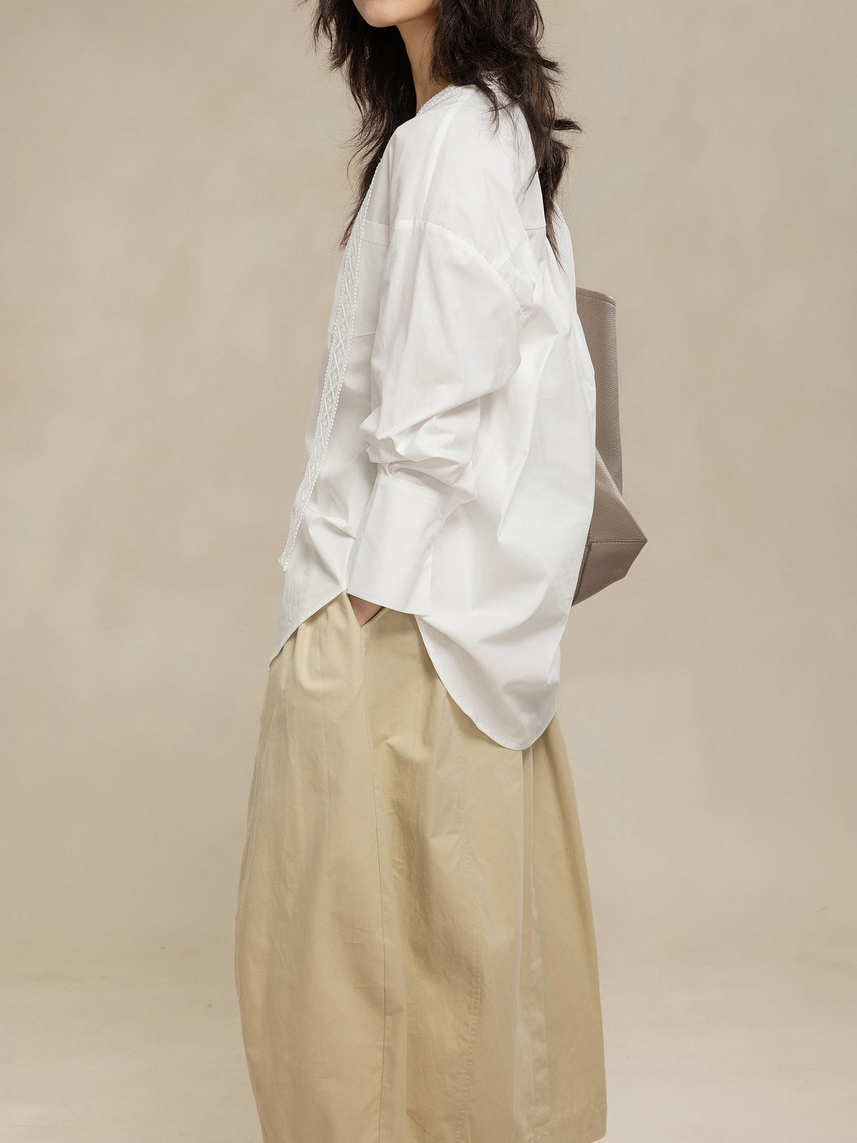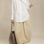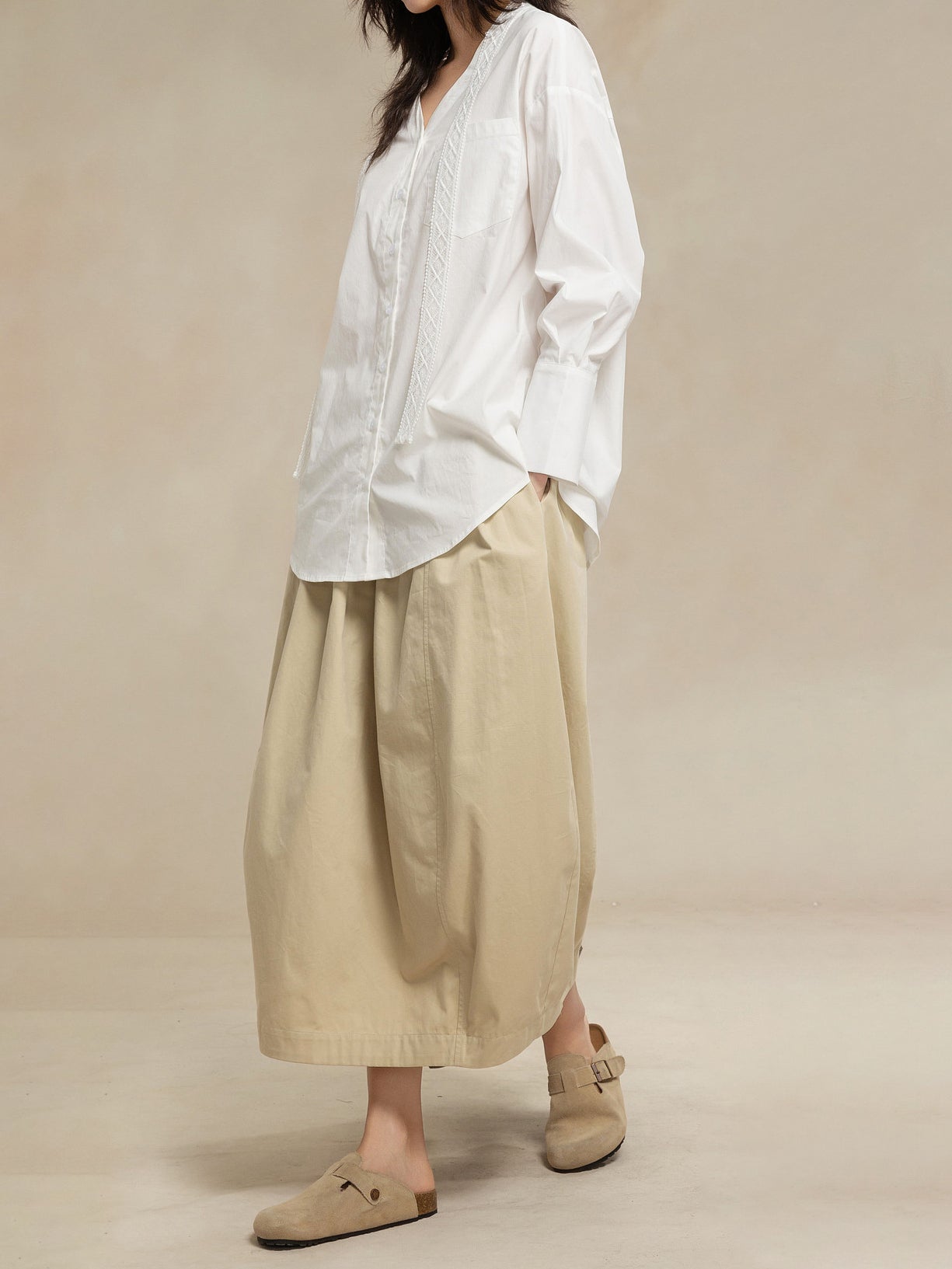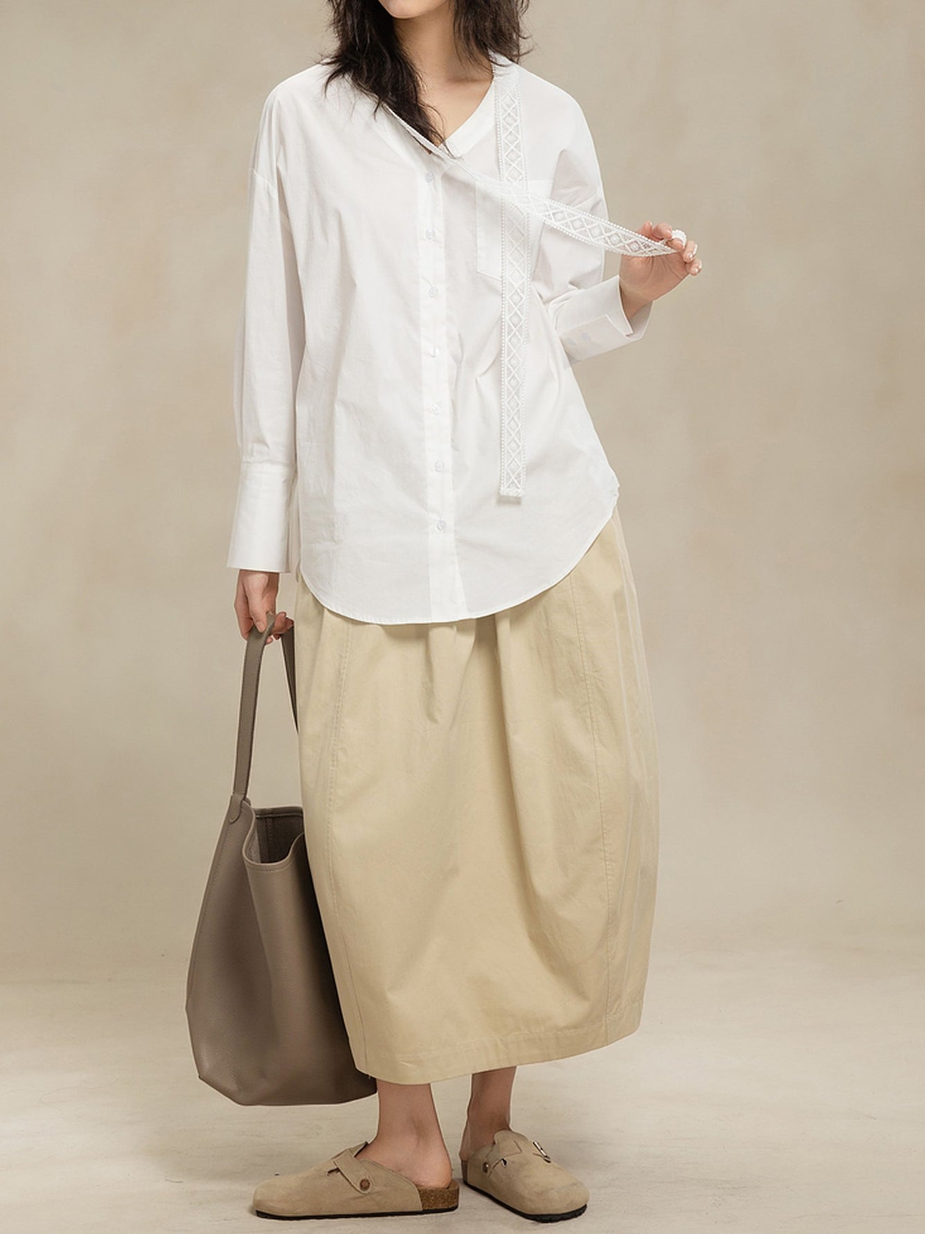 -For a relaxed weekend look, pair it with an I-line skirt or curved pants and flat shoes.