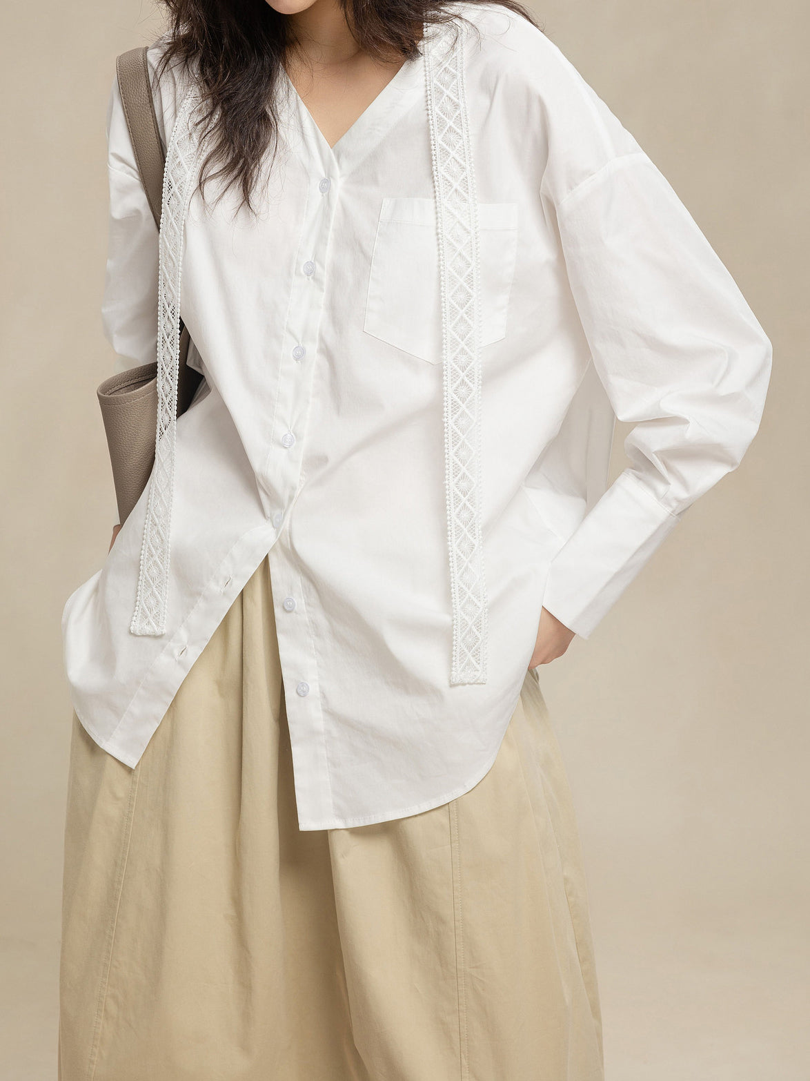 The lace bow tie collar can be worn in a classic style, or you can untie the tie and create a V-neck for a more relaxed look.