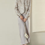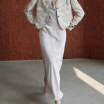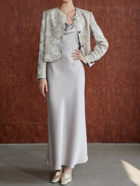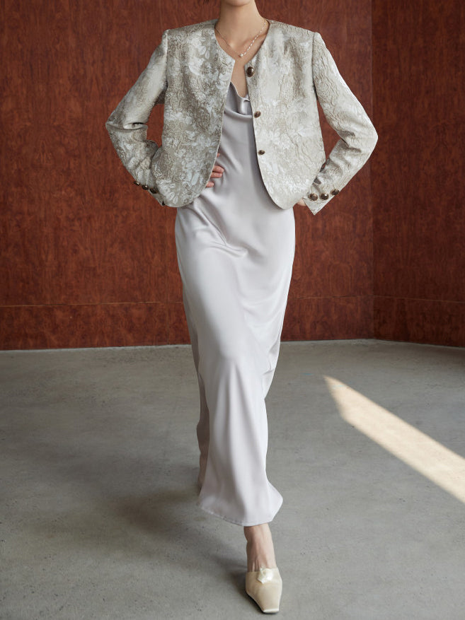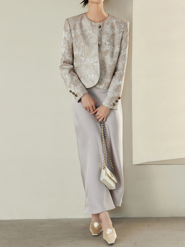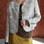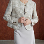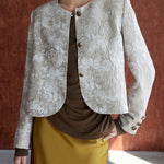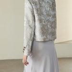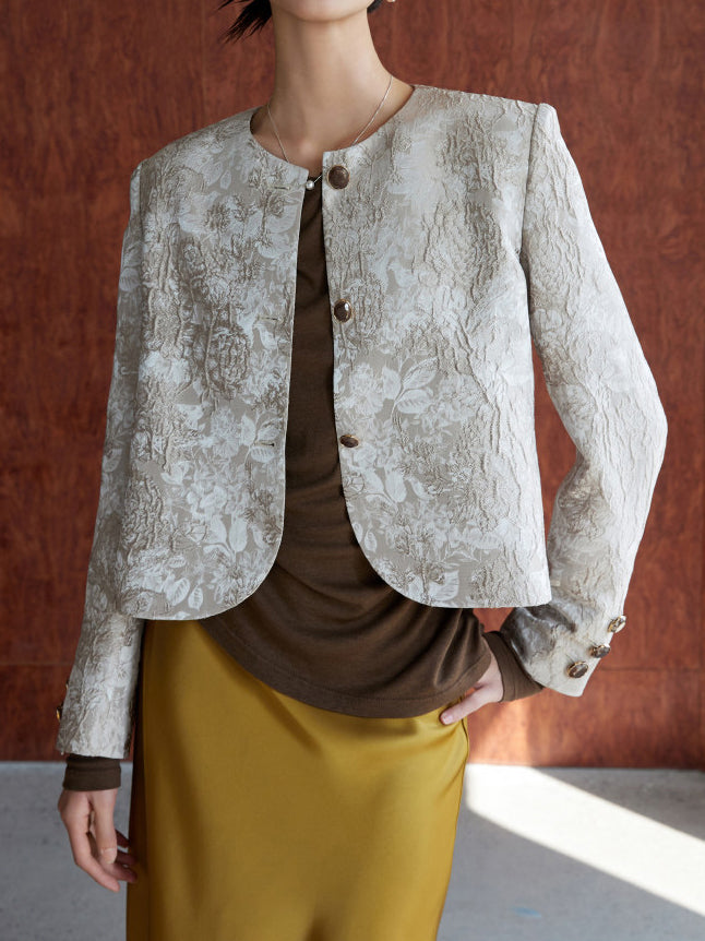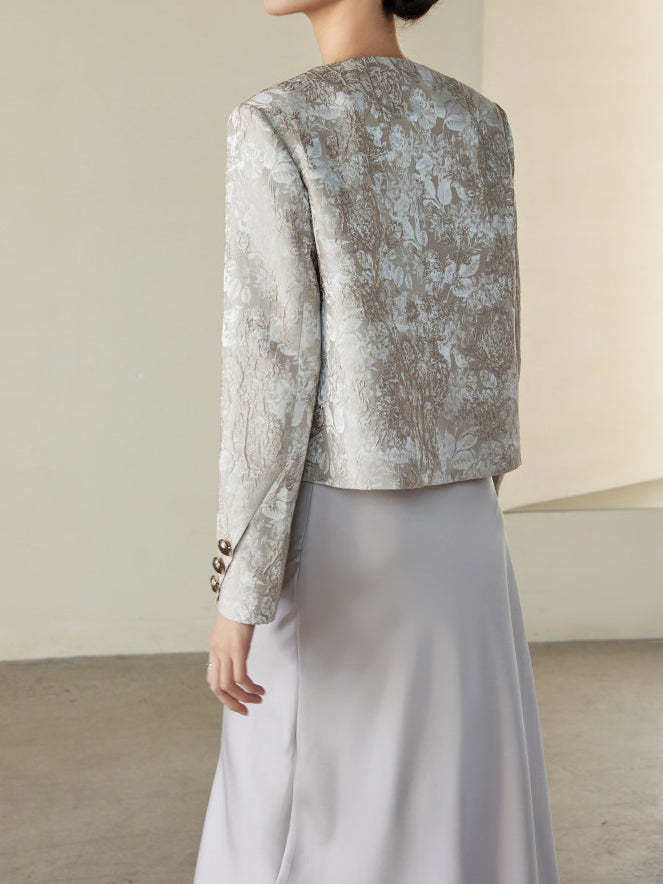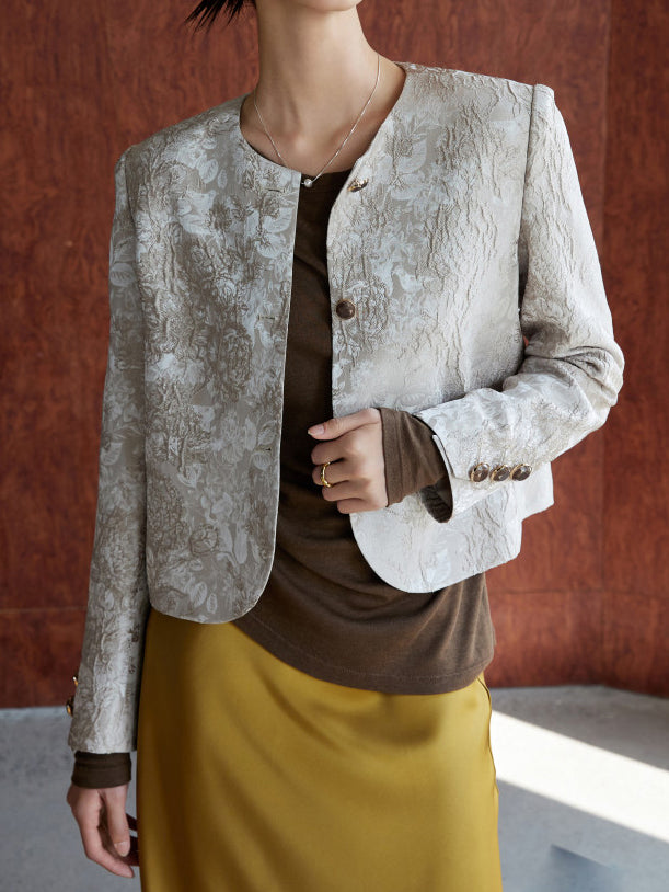 A sophisticated short jacket made from puffed jacquard fabric with a textured surface.
