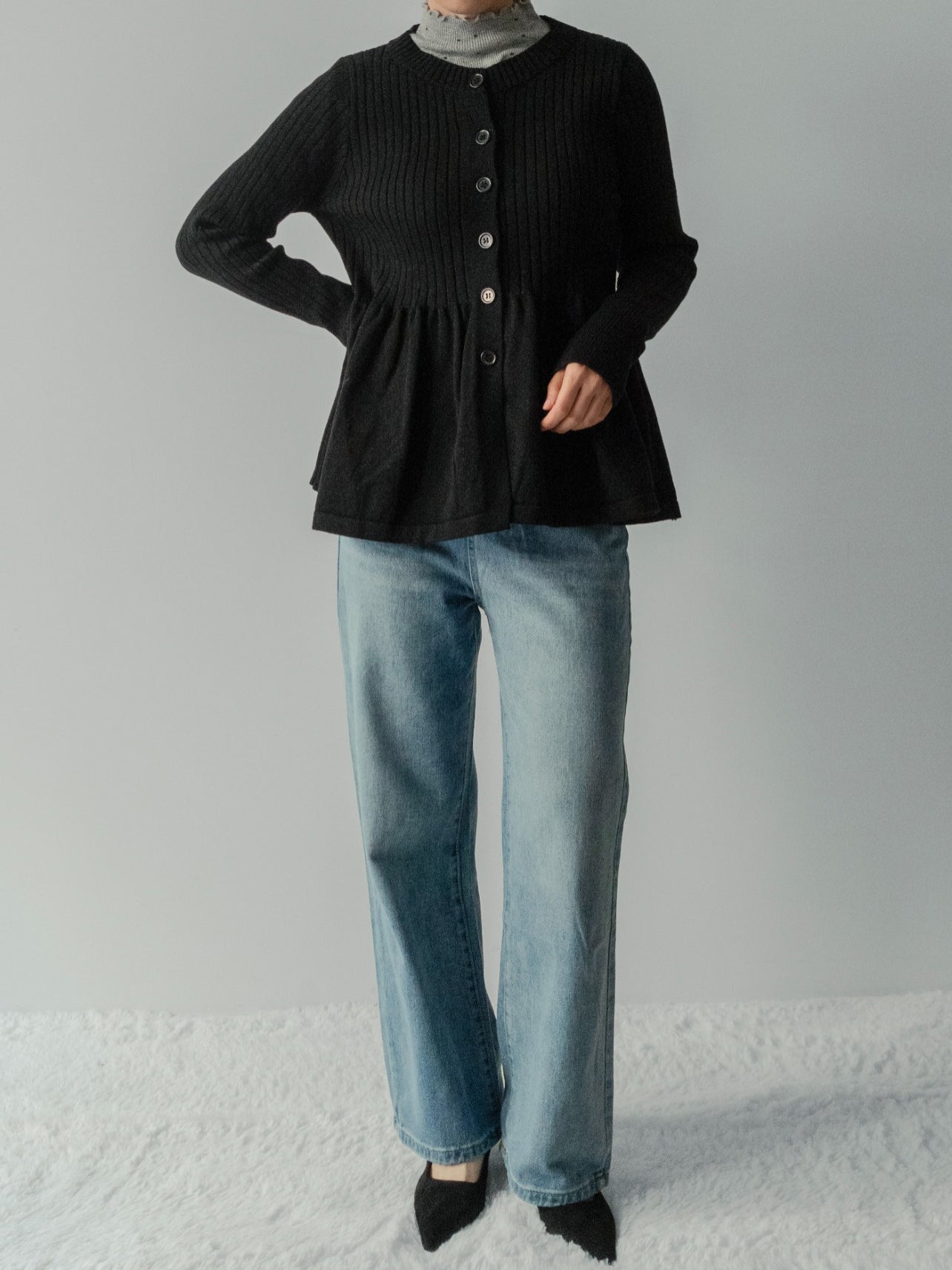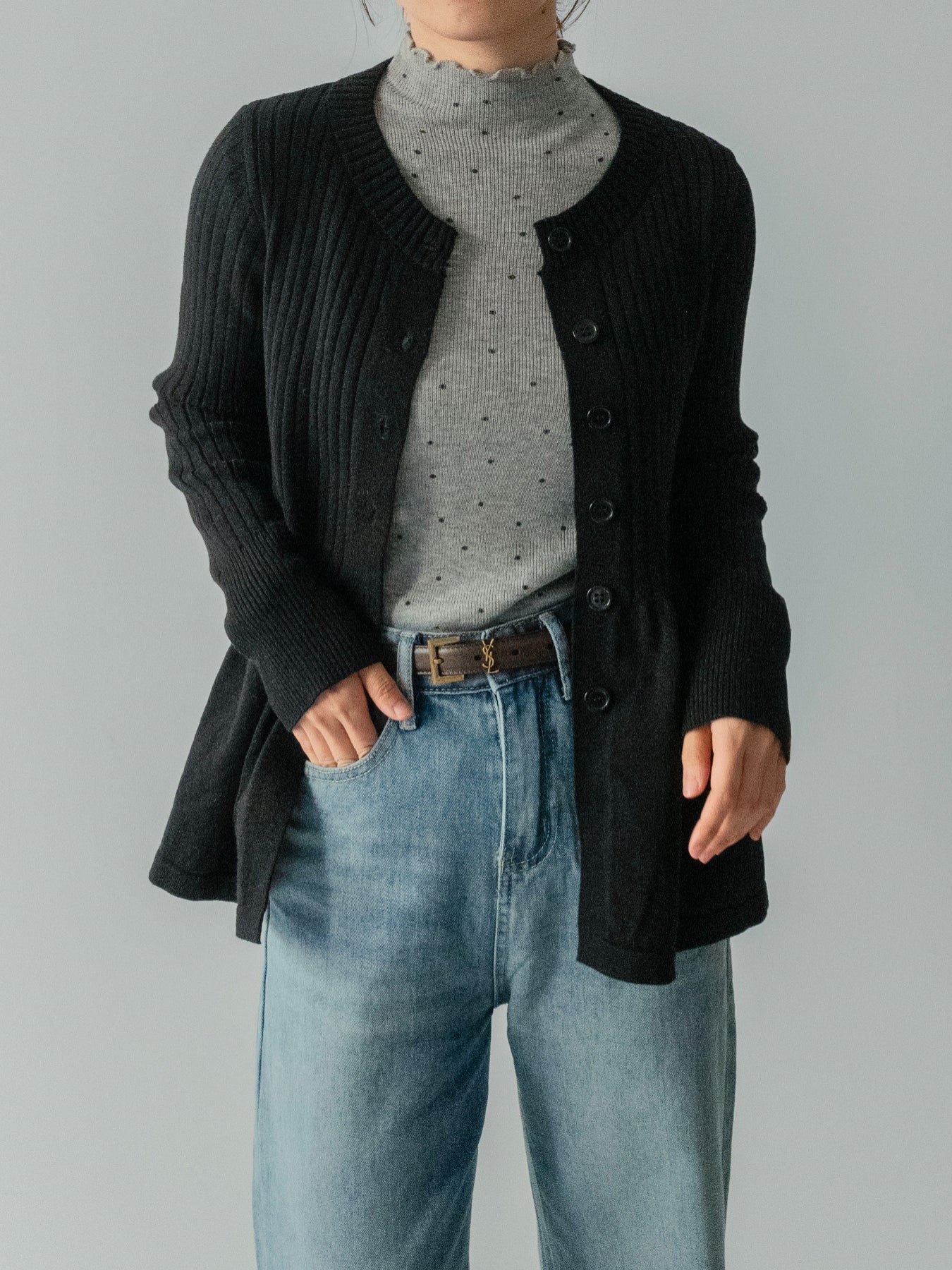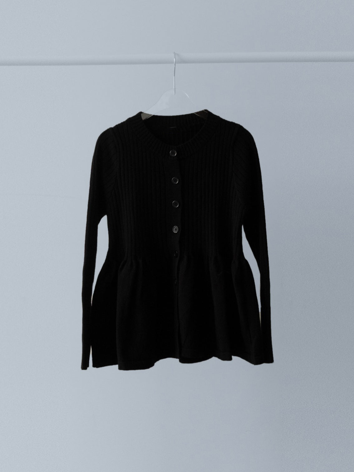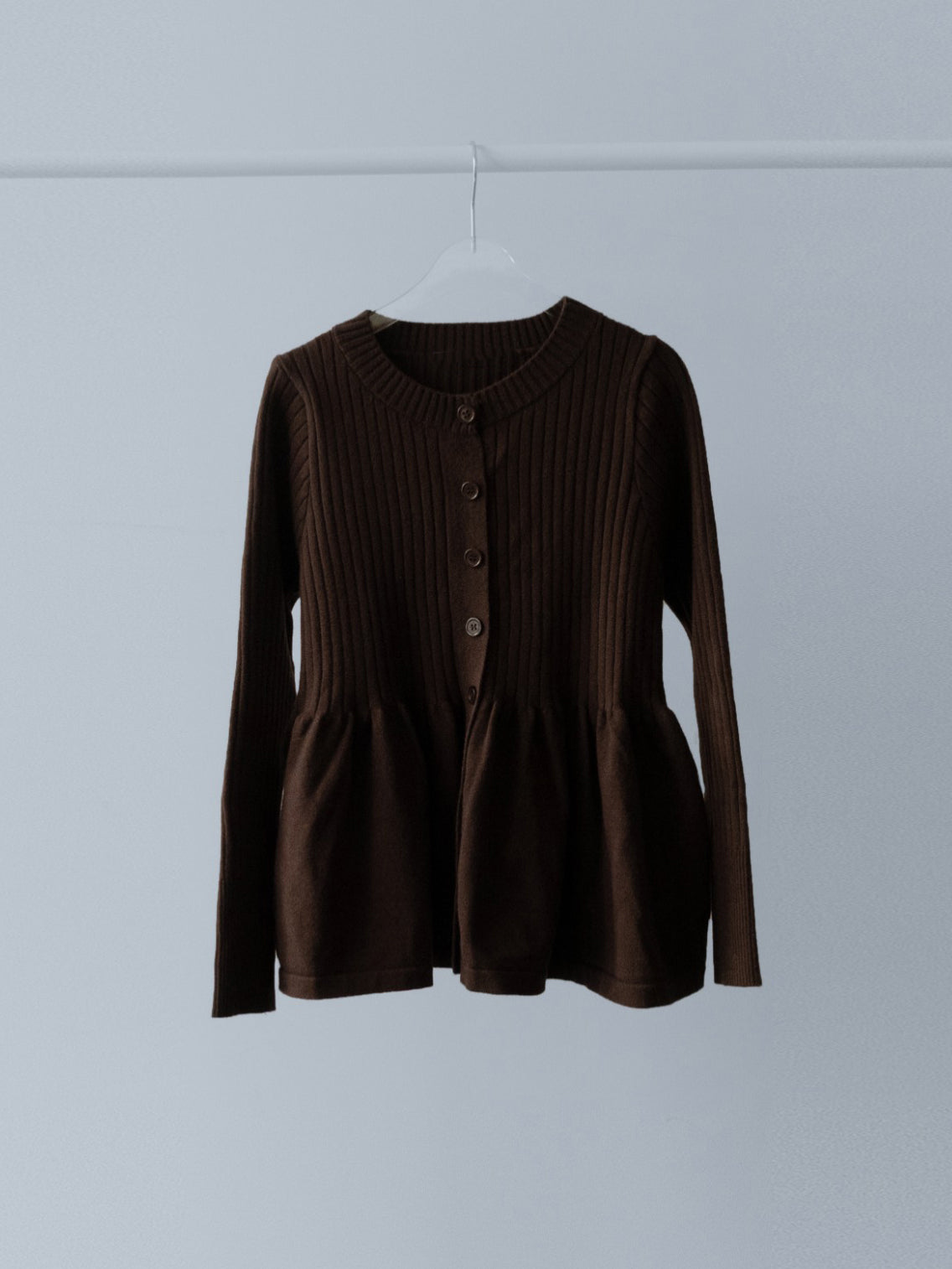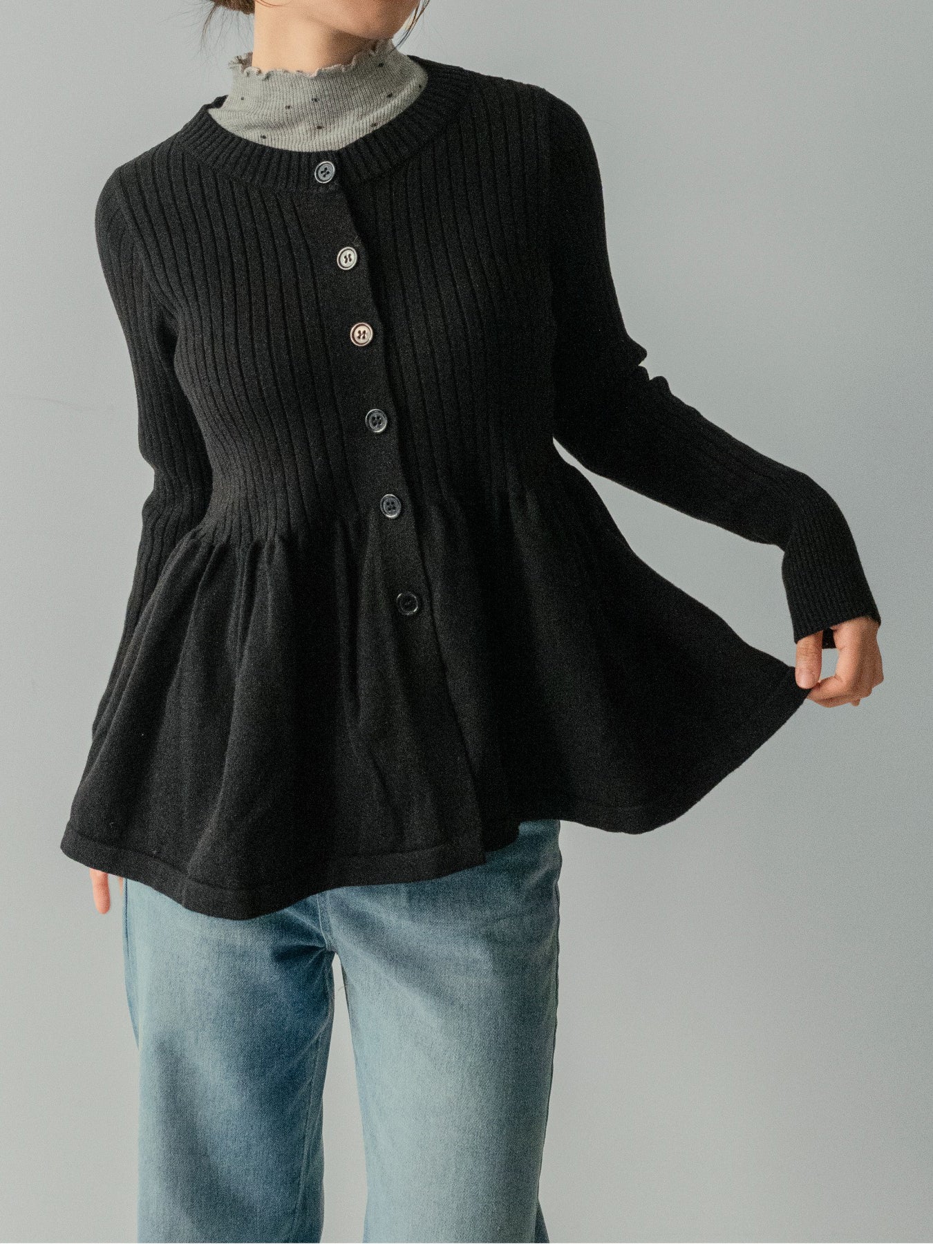A cardigan with ruffles and a peplum that adds a touch of elegance and femininity.