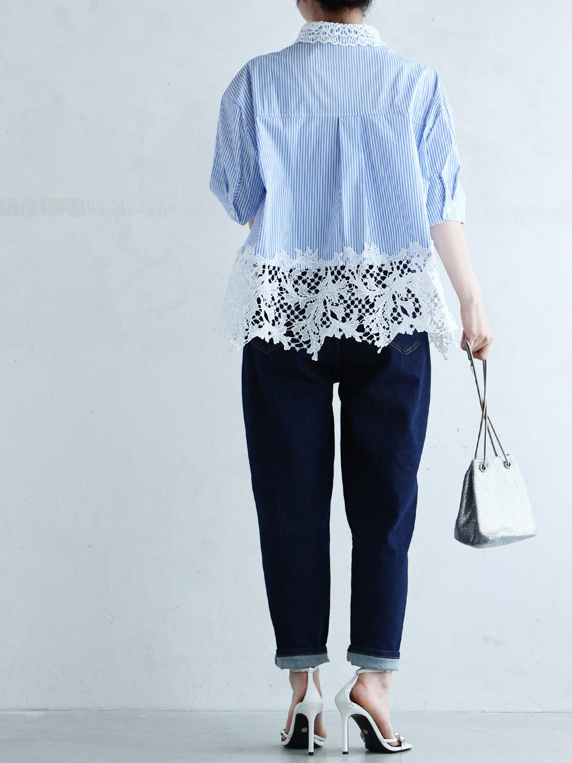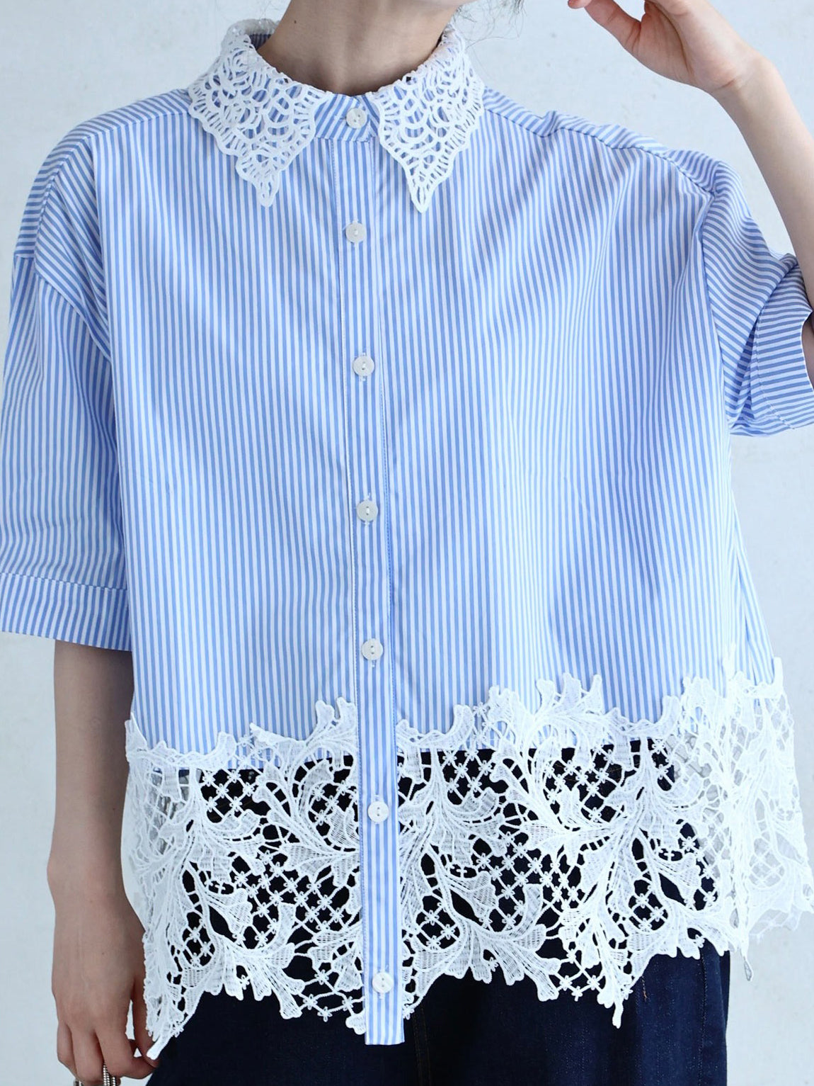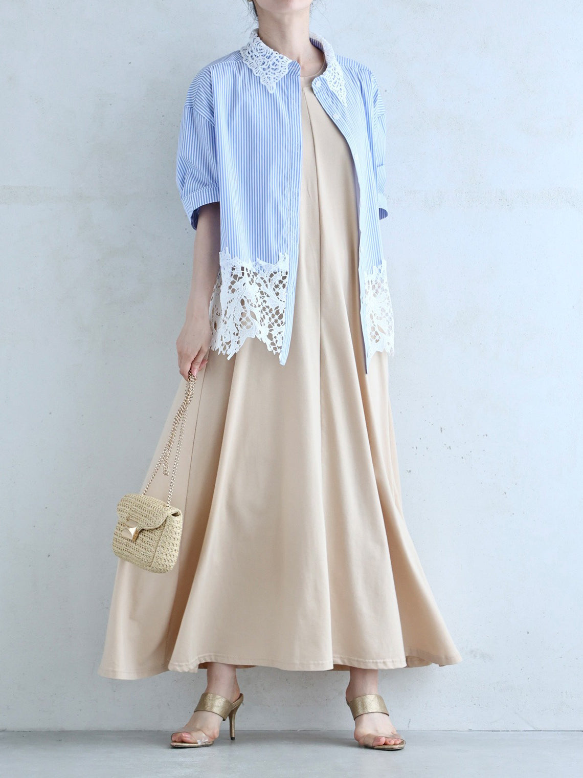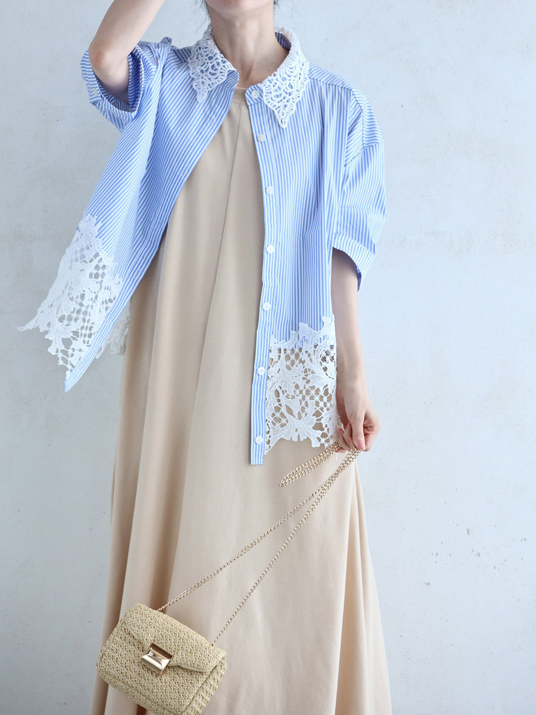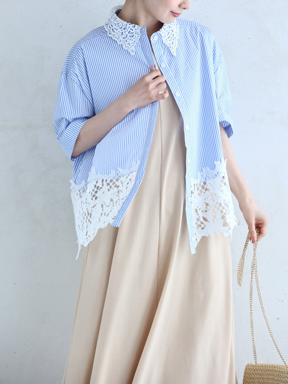☆ The striped pattern and lace collar and hem give it a mature and cute look without being too sweet, and the transparency of the lace gives it a cool feel, making it perfect for the hot season .