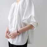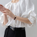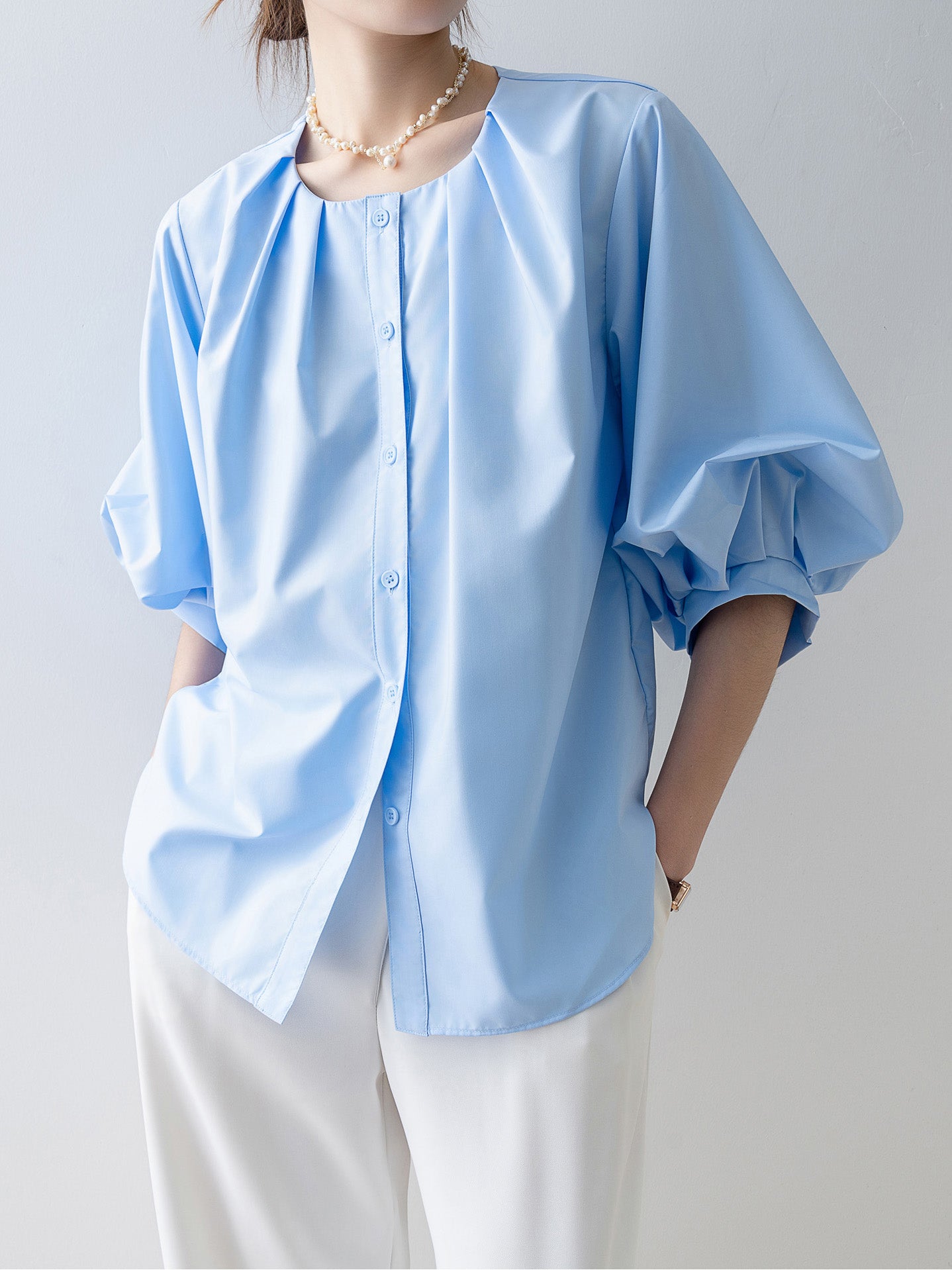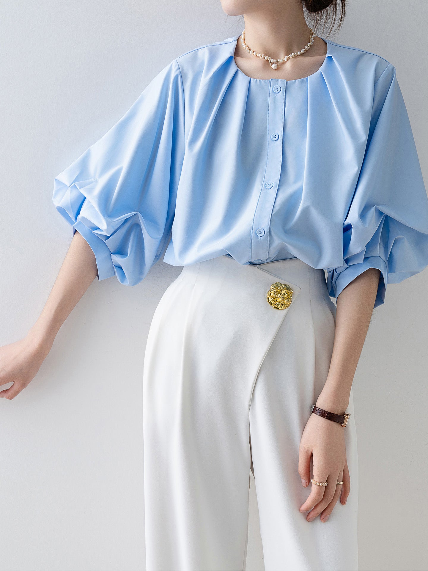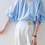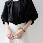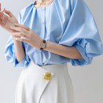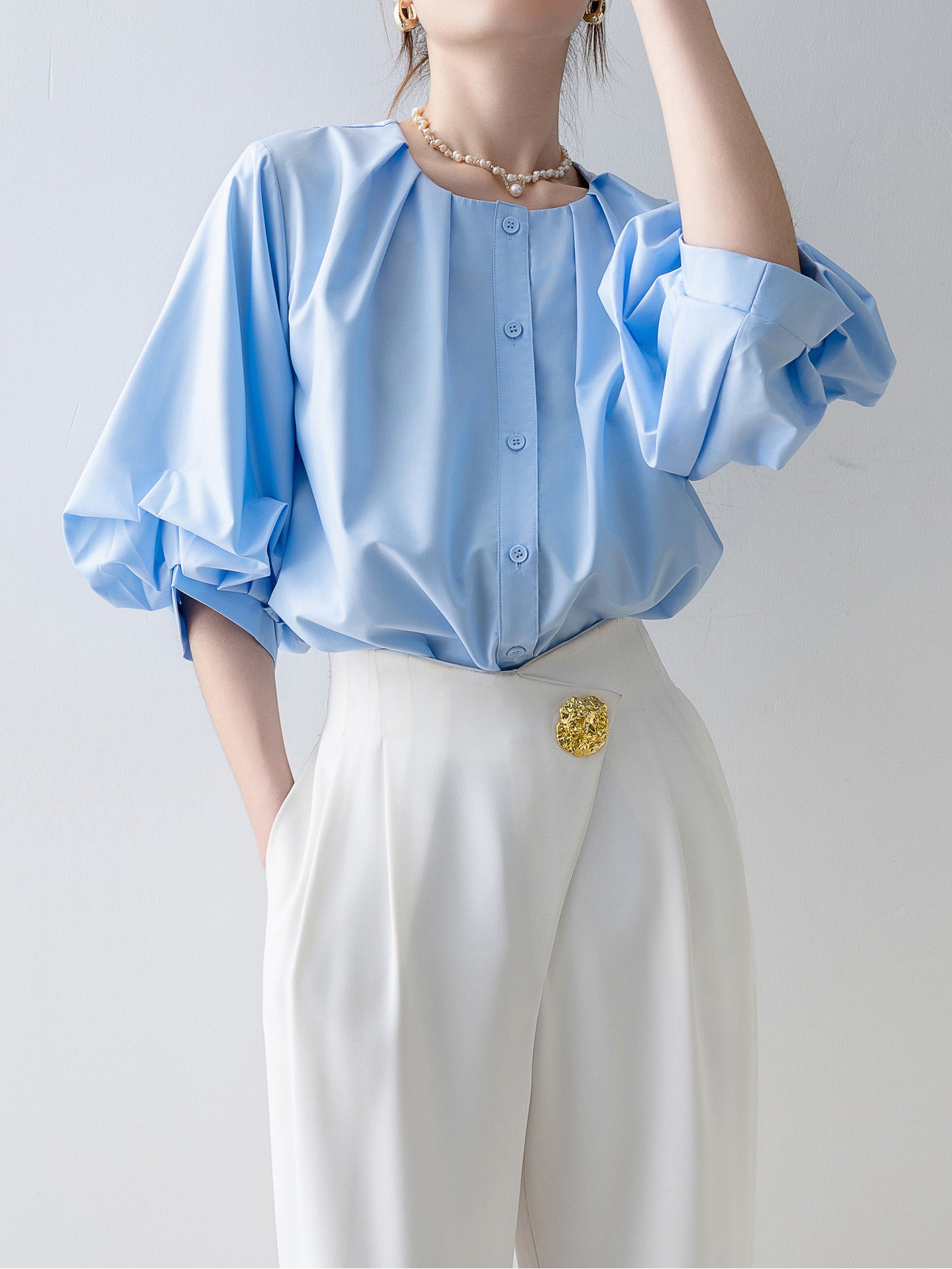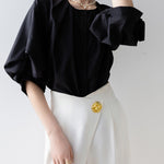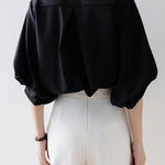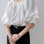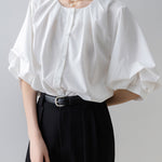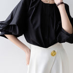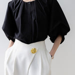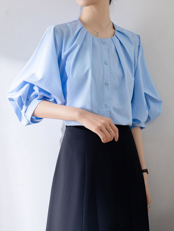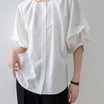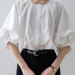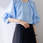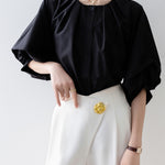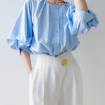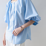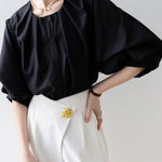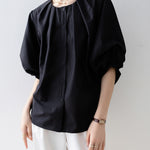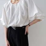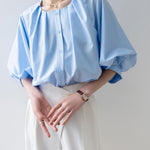 [Semi-matte volume sleeve neck tucked-in blouse]