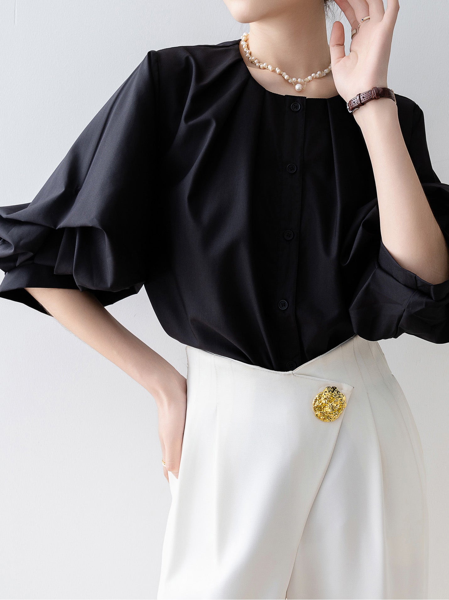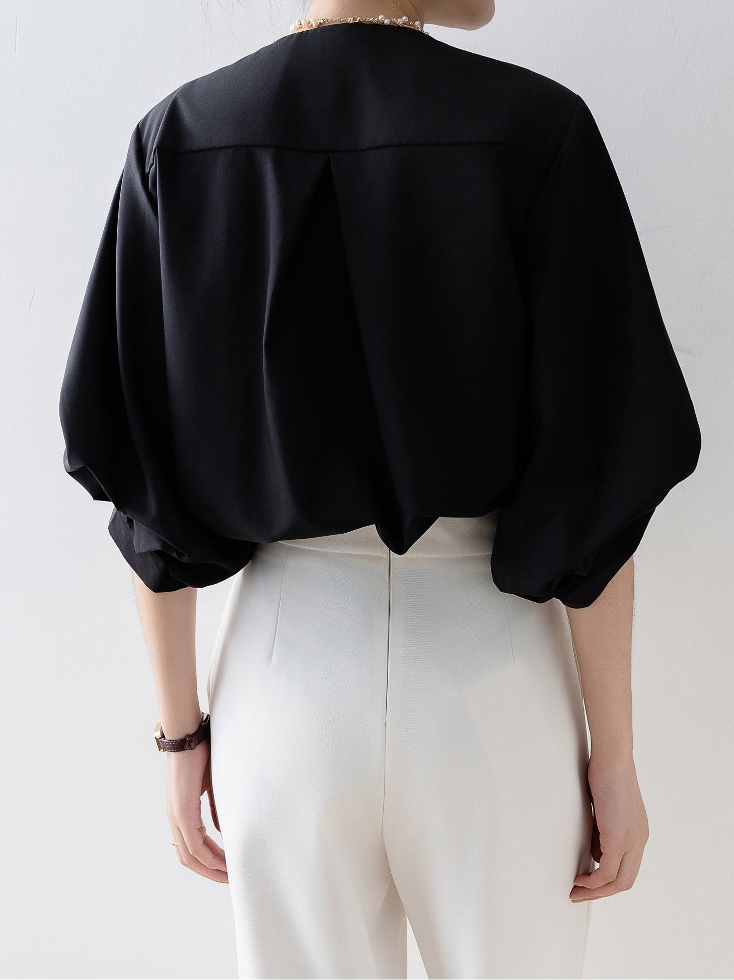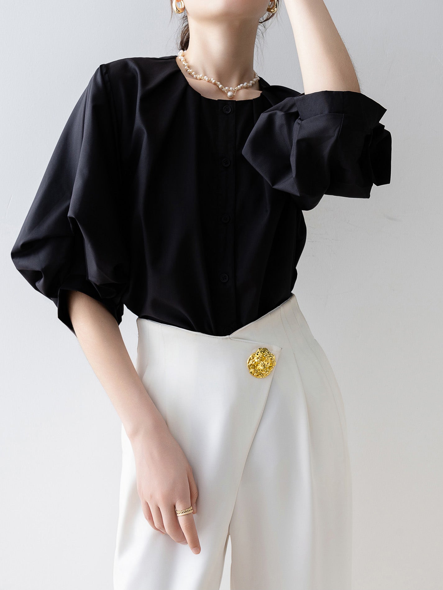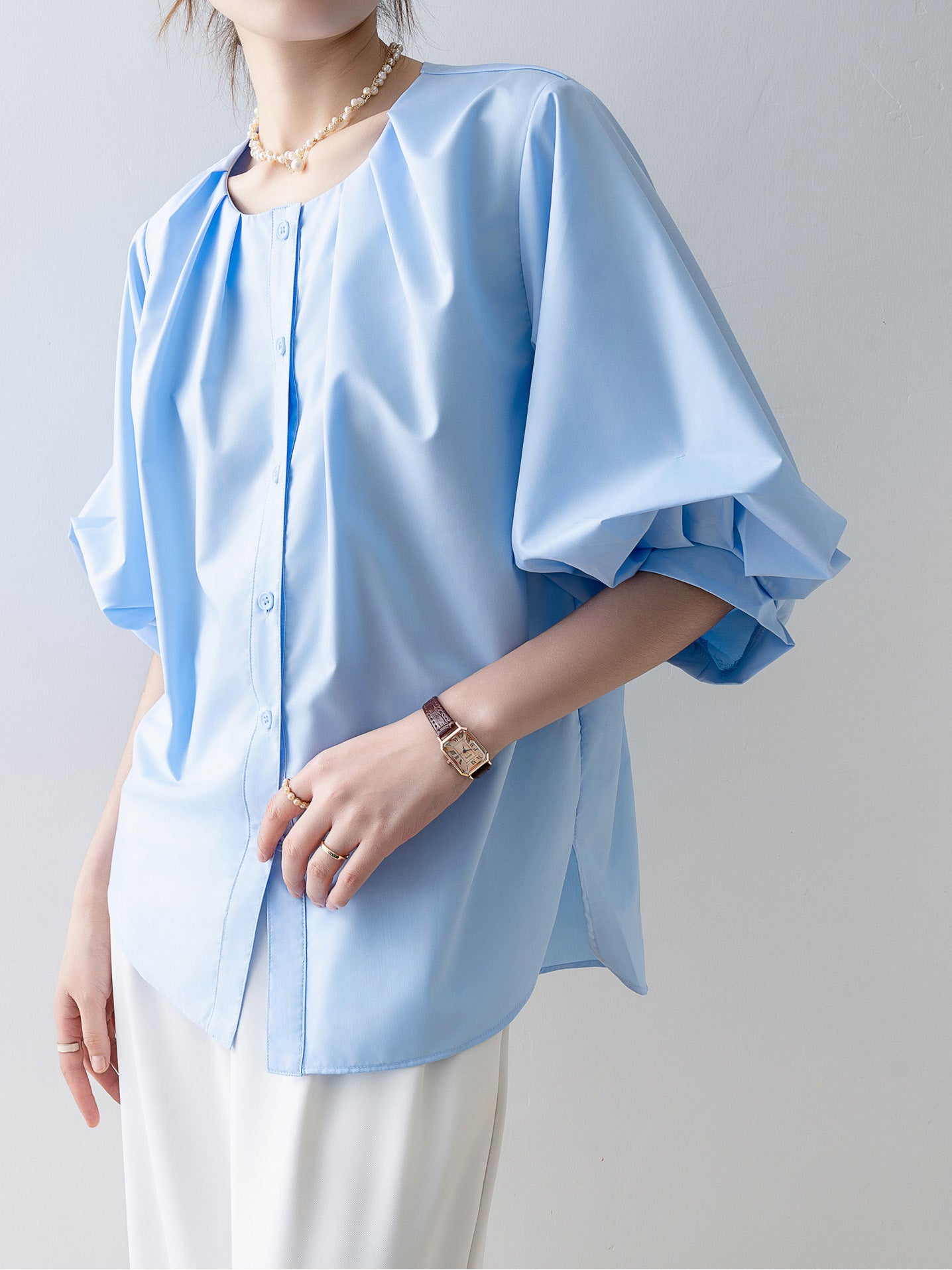 [Semi-matte volume sleeve neck tucked-in blouse]