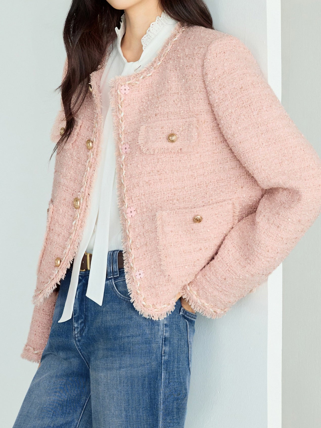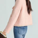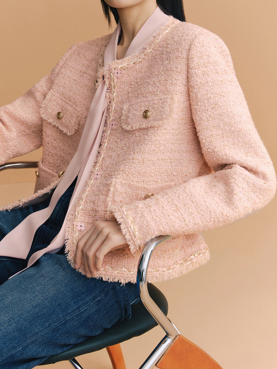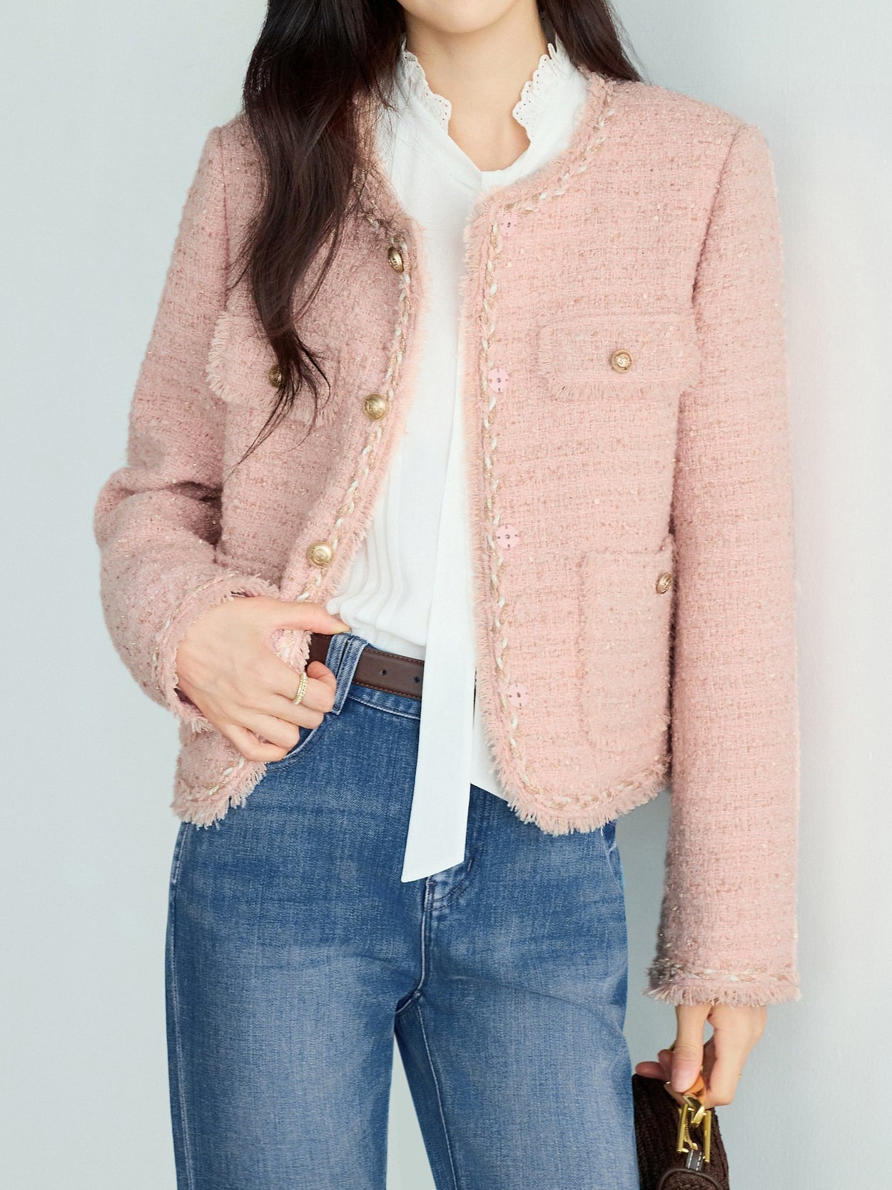フリンジ使いとフロントボタンデザインが効いたノーカラージャケット。