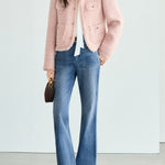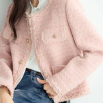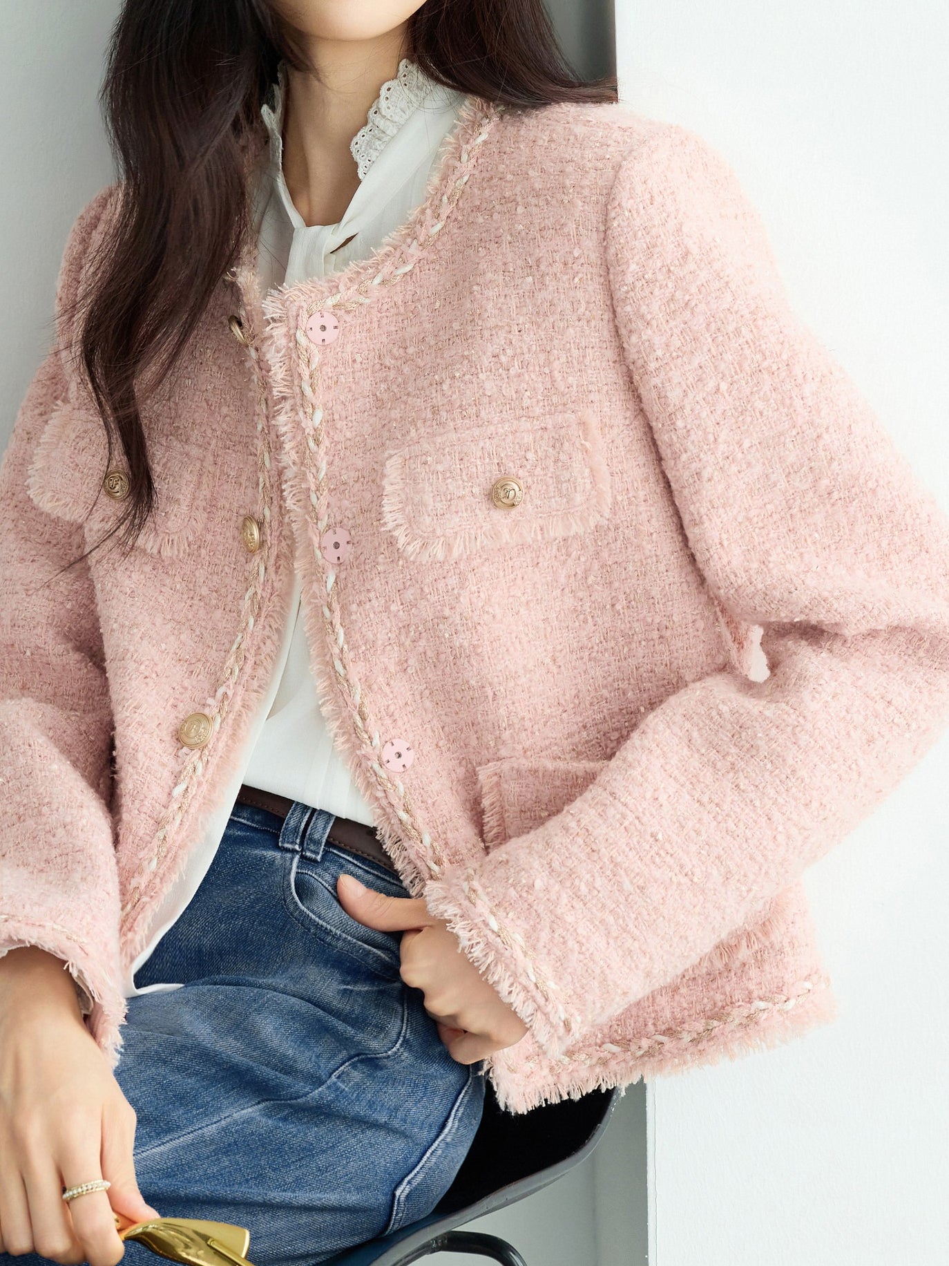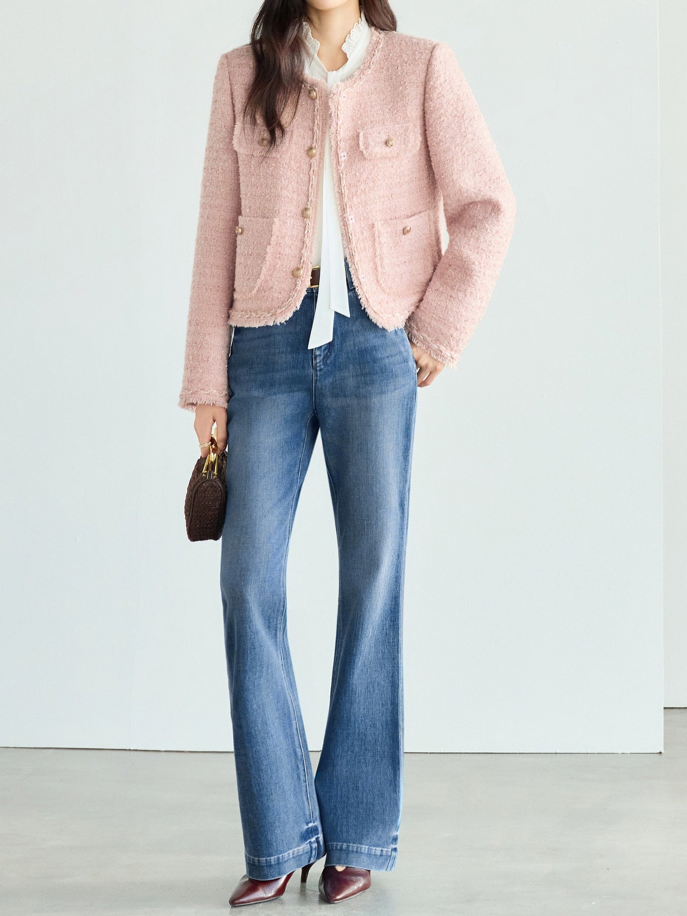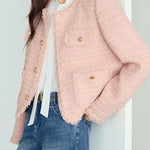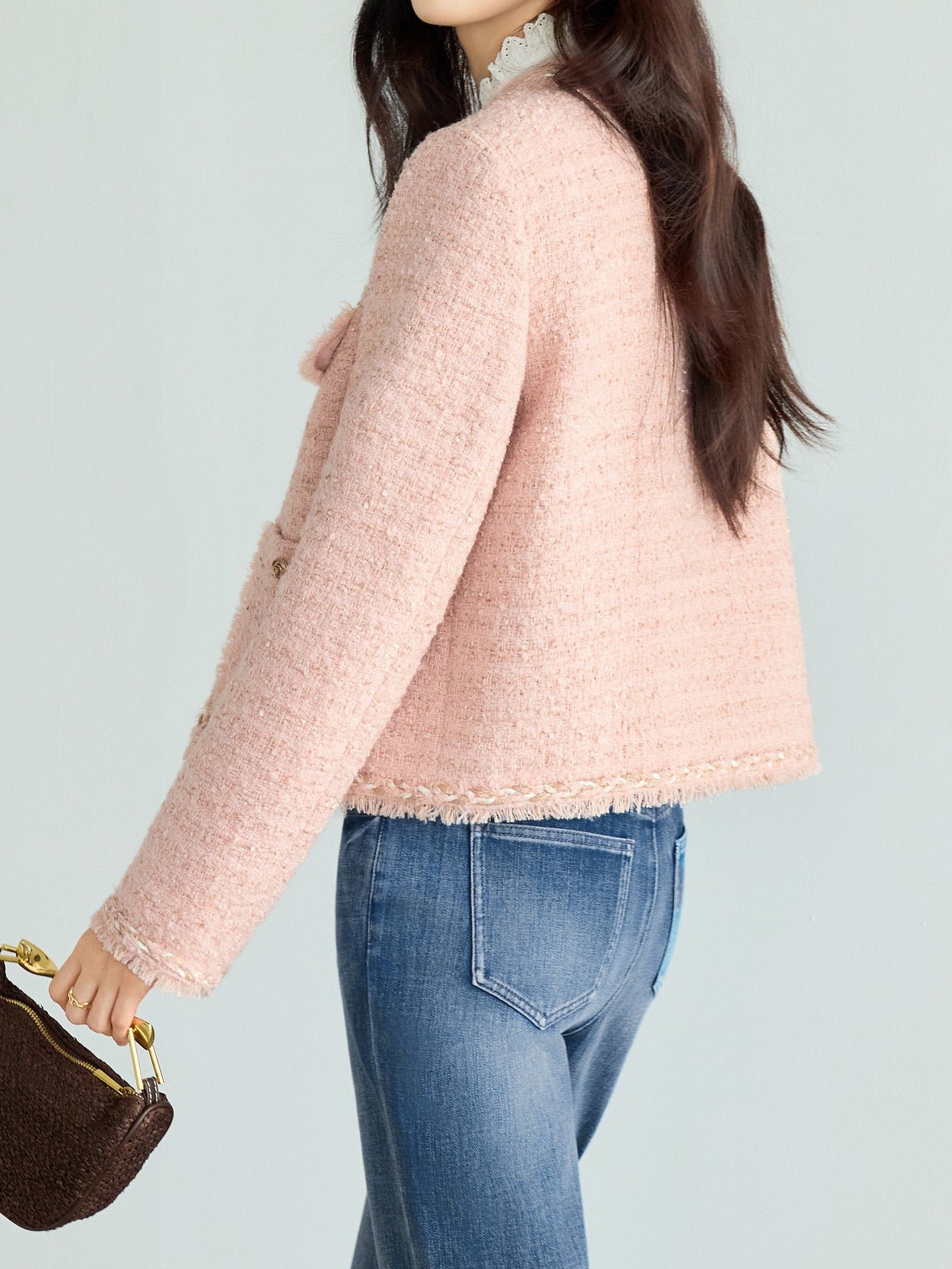 フリンジ使いとフロントボタンデザインが効いたノーカラージャケット。