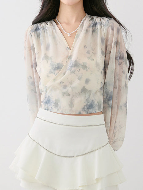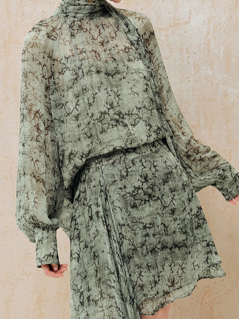 <Pre-release> Bowtie Color Print Chiffon Blouse <Can be set up>