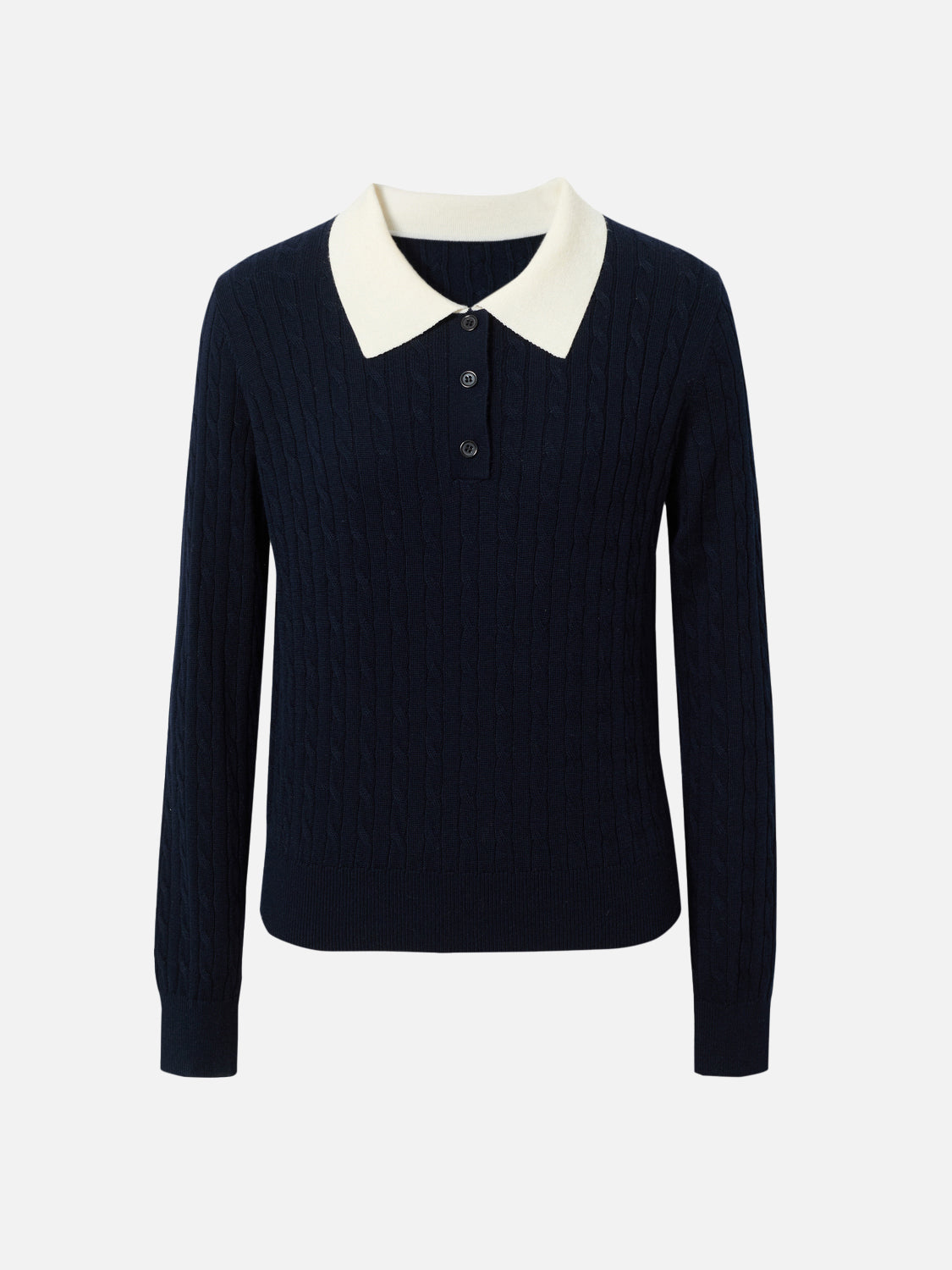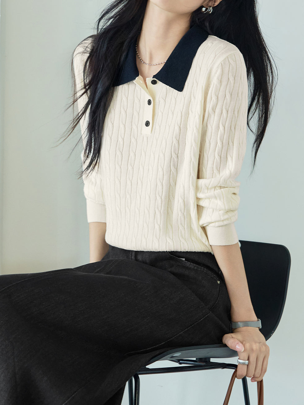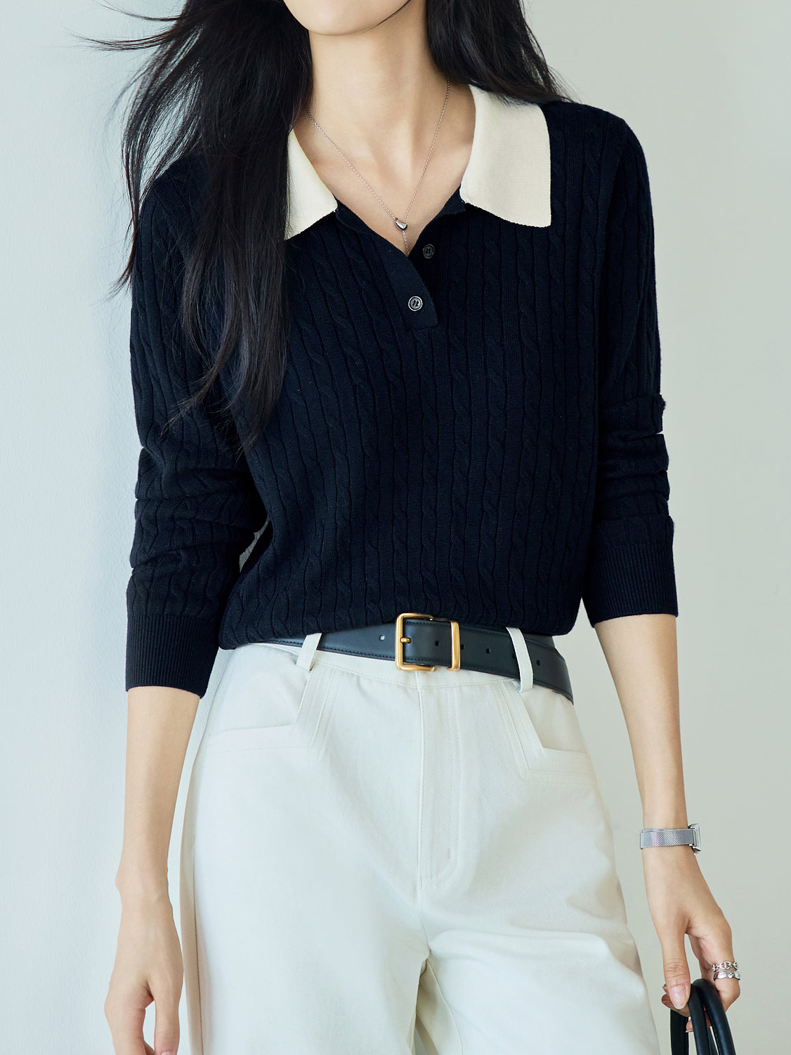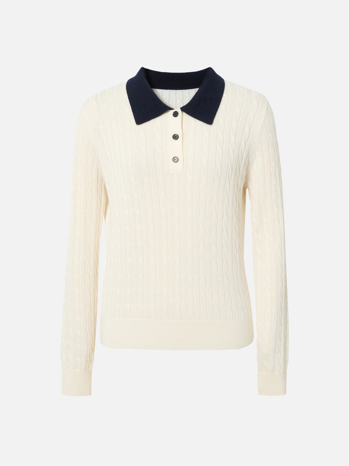 This knit polo features a warm cable pattern and two-tone color scheme that gives it a feminine and soft impression.