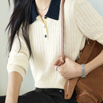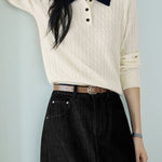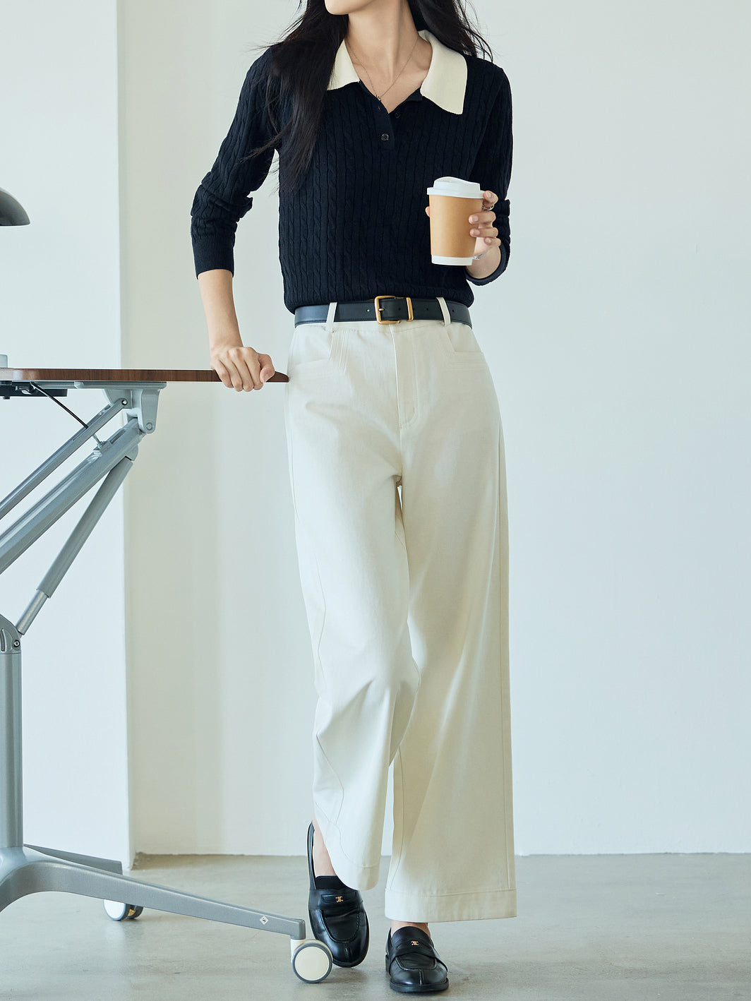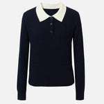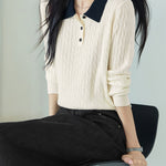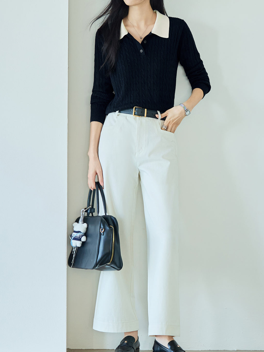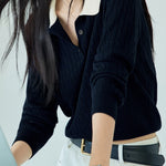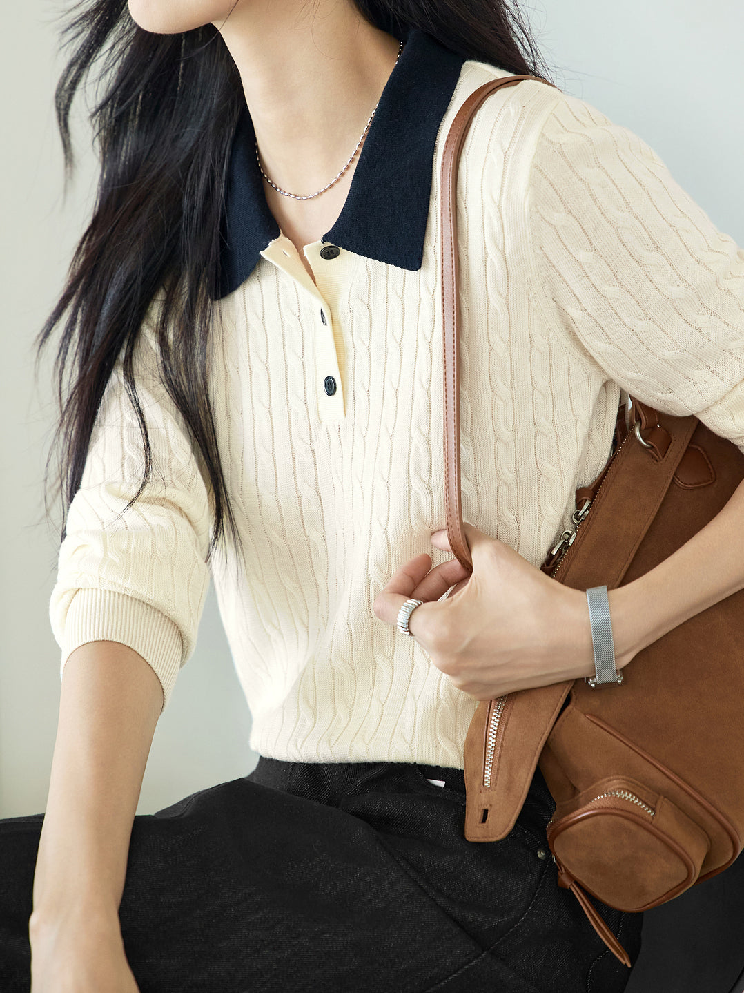 This knit polo features a warm cable pattern and two-tone color scheme that gives it a feminine and soft impression.