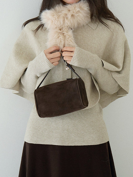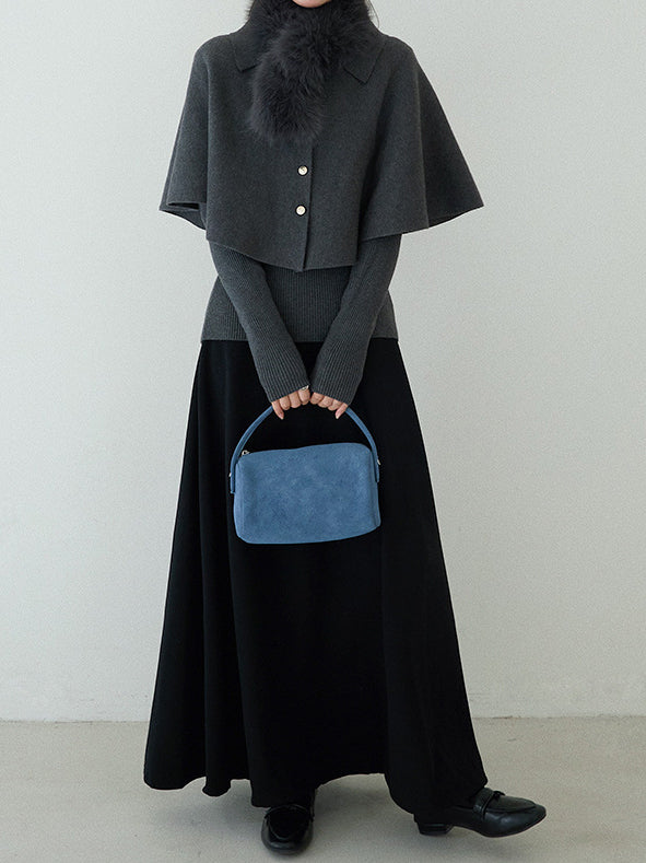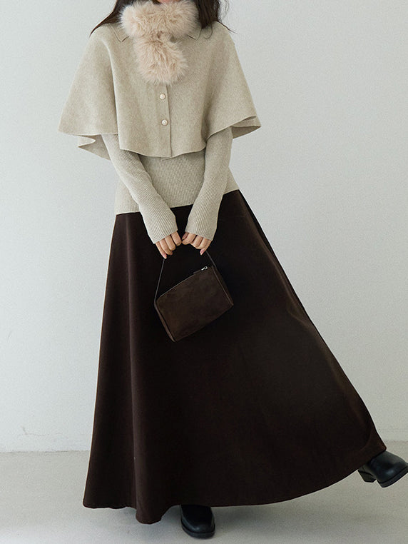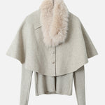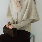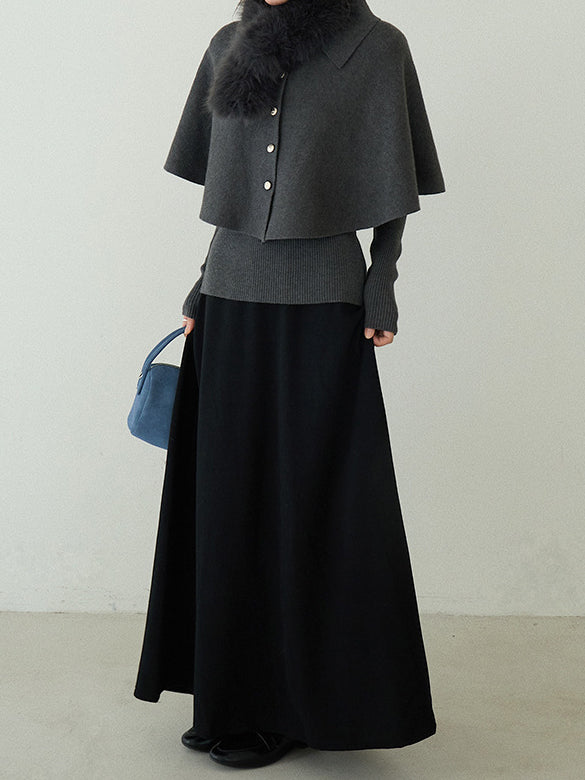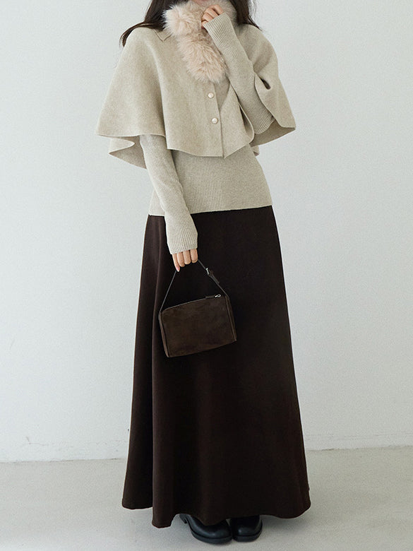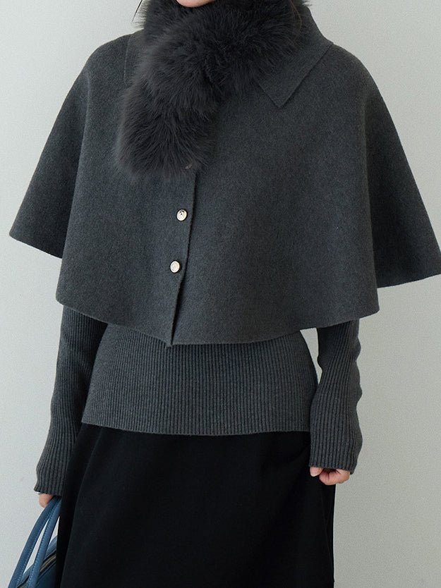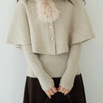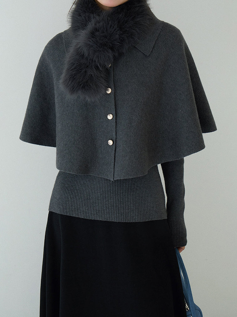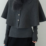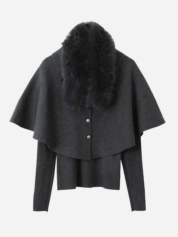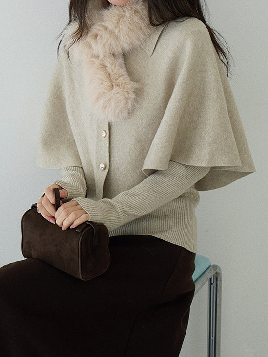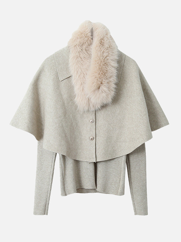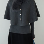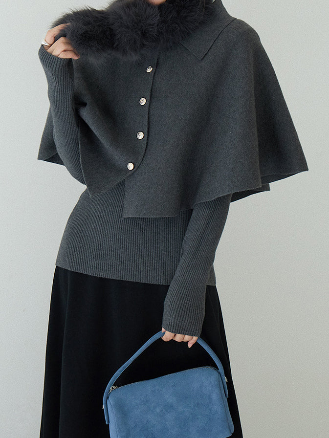Cape knit with fur tippet + V-neck rib knit ensemble (2 colors)